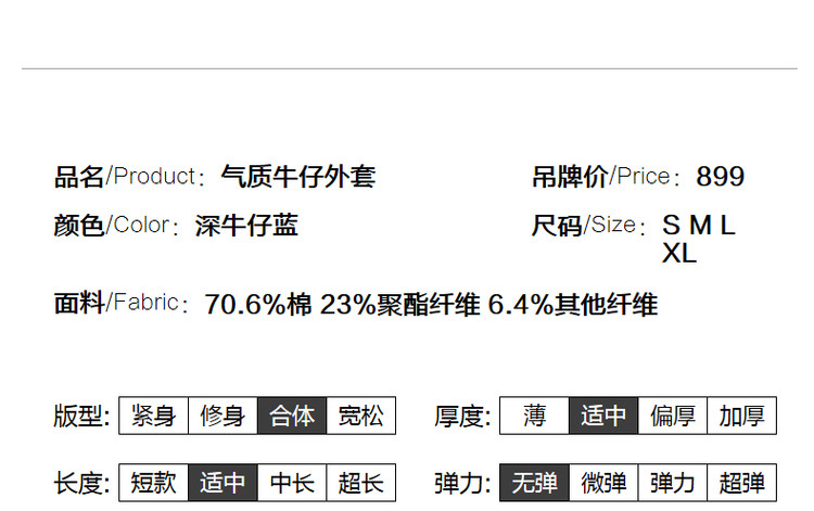 商品名称:【智型丹宁】春秋通勤风云朵棉撞色边翻领一粒扣修身女式牛仔外套 171457