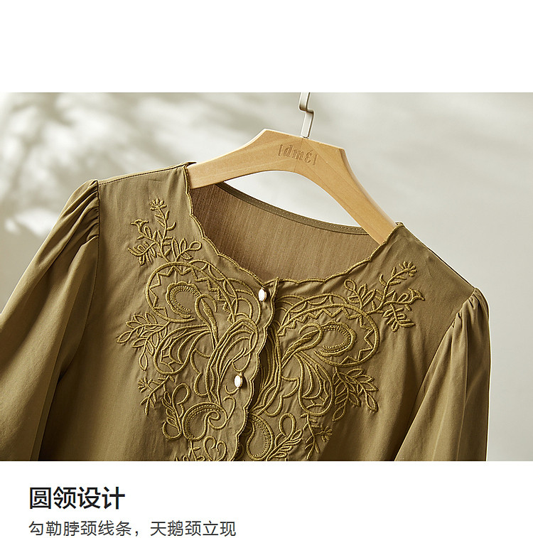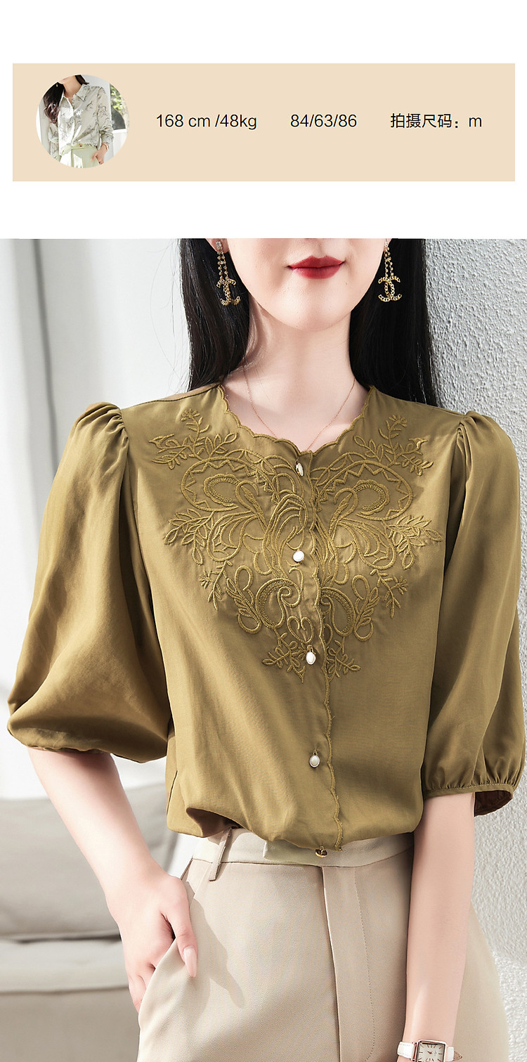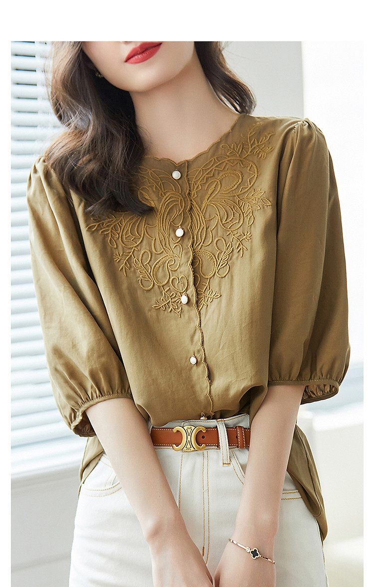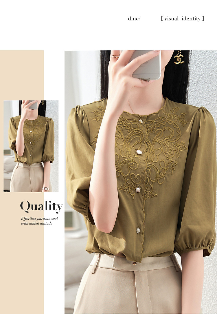 商品名称:【呼吸感花藤刺绣衬衫】夏法式文艺设计感褶皱藏肉舒适衬衣女上衣 142273