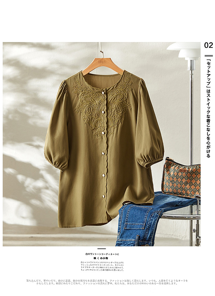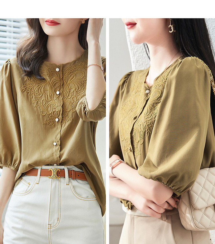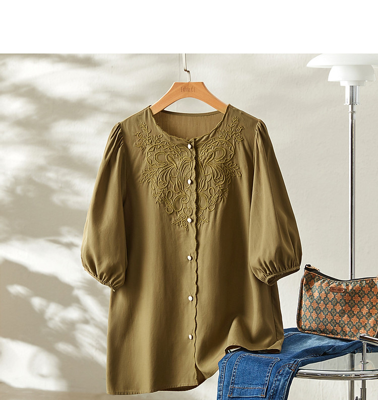 【呼吸感花藤刺绣衬衫】夏法式文艺设计感褶皱藏肉舒适衬衣女上衣 142273