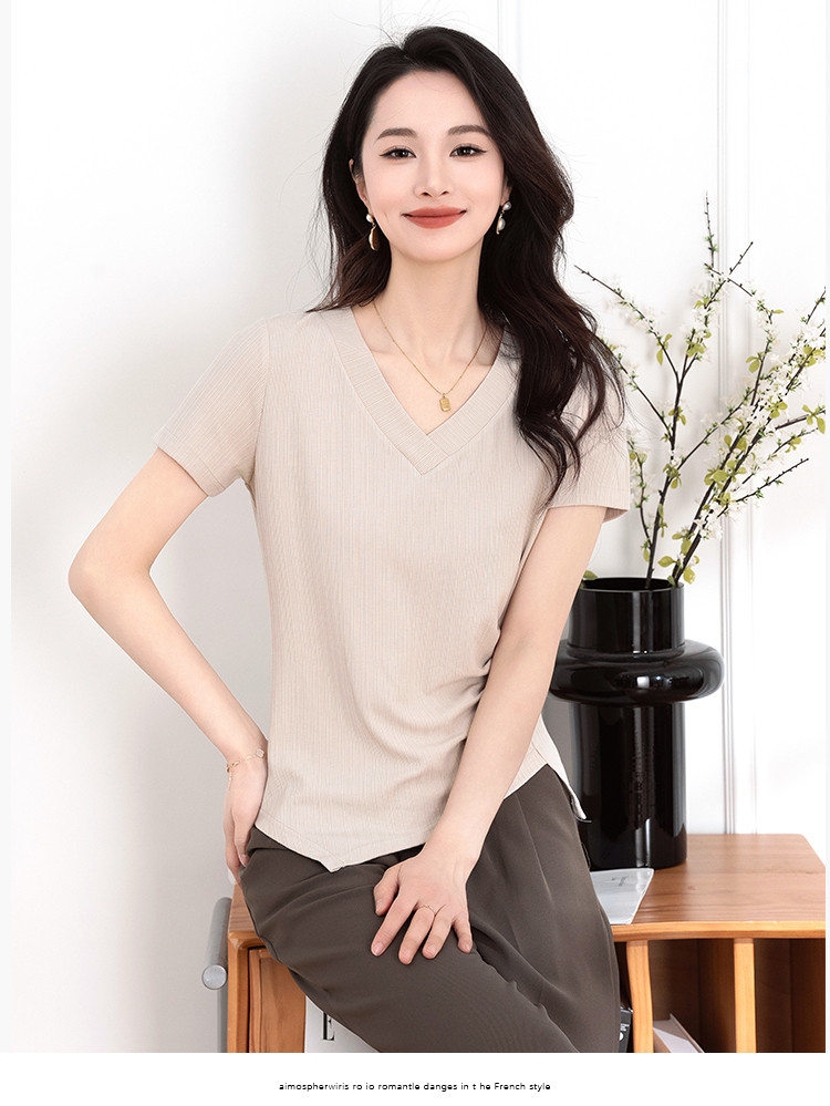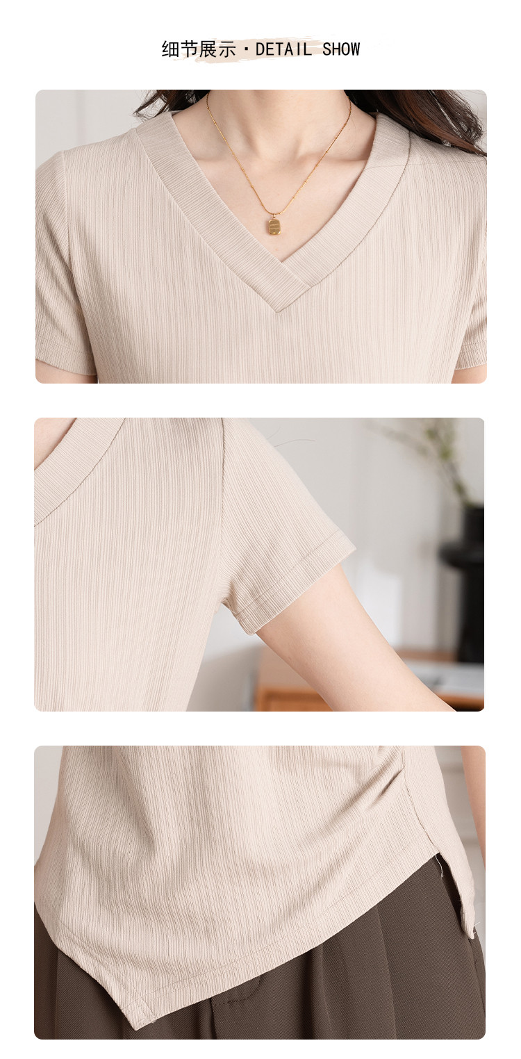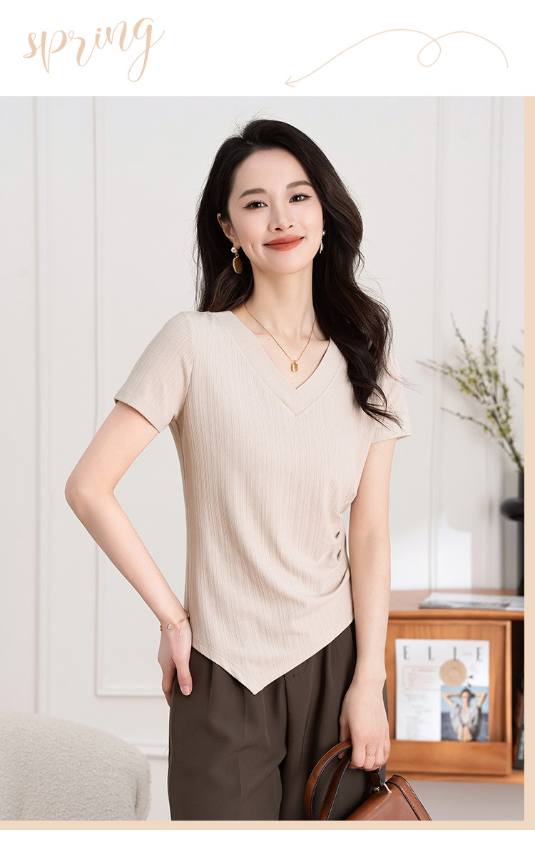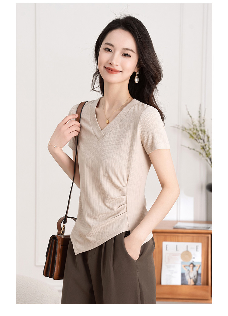 商品名称:不规则褶皱开叉夏季V领短袖T恤女修身透气休闲百搭微弹纯色上衣 369153