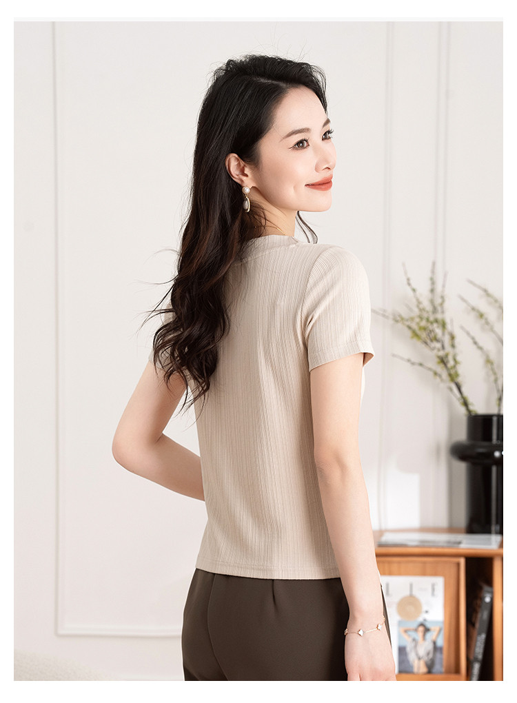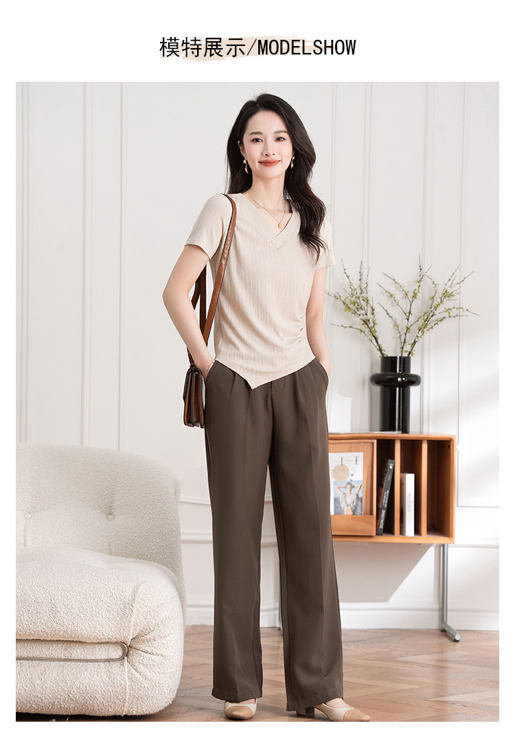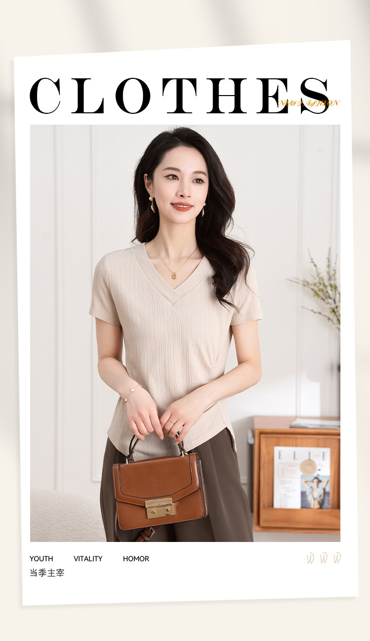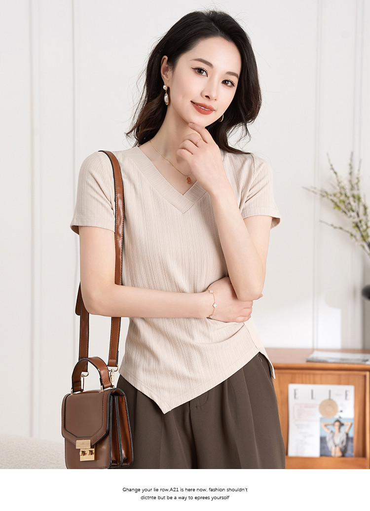 商品名称:不规则褶皱开叉夏季V领短袖T恤女修身透气休闲百搭微弹纯色上衣 369153