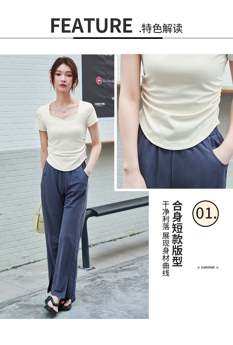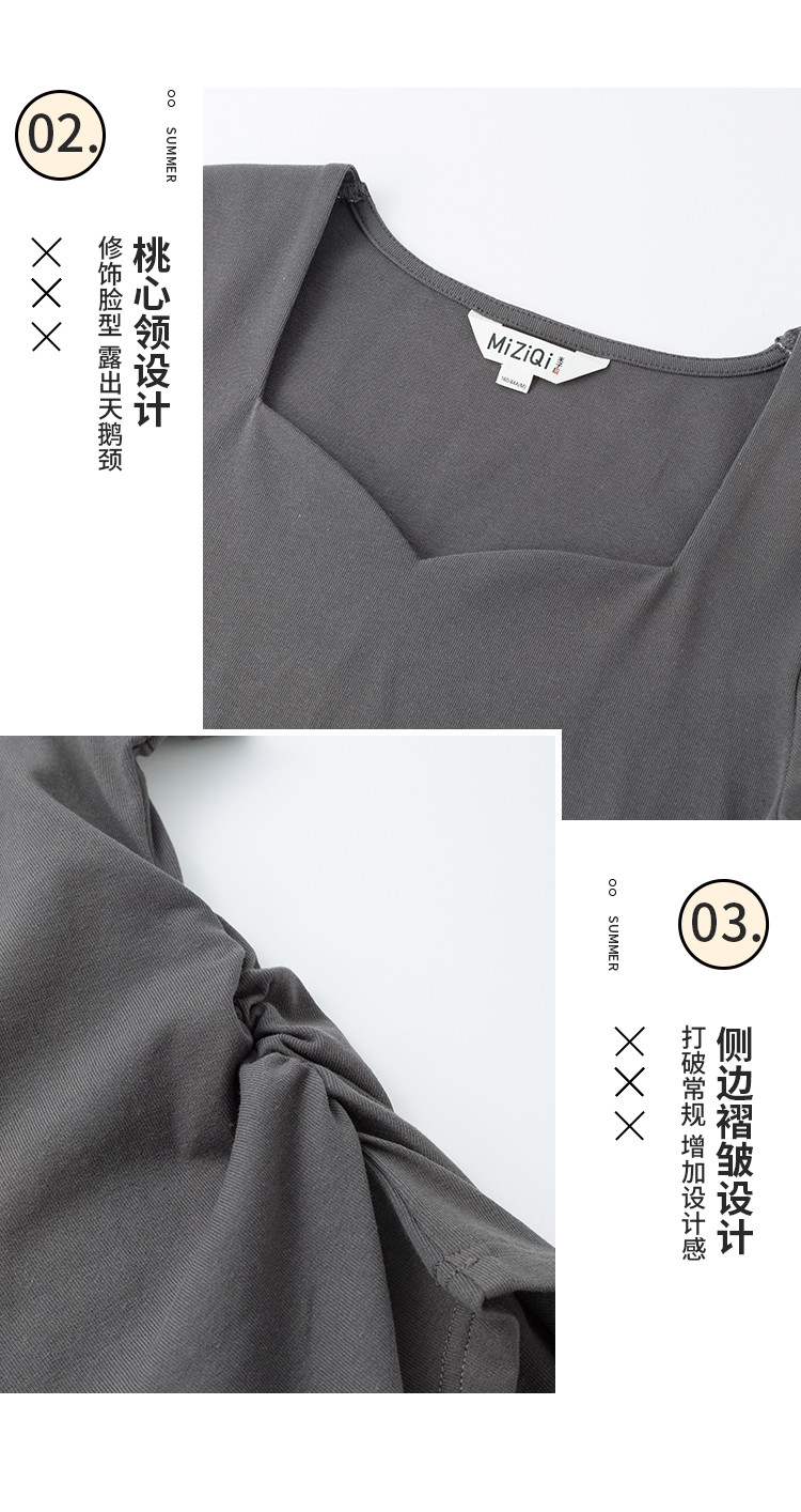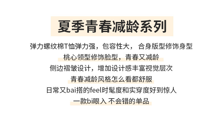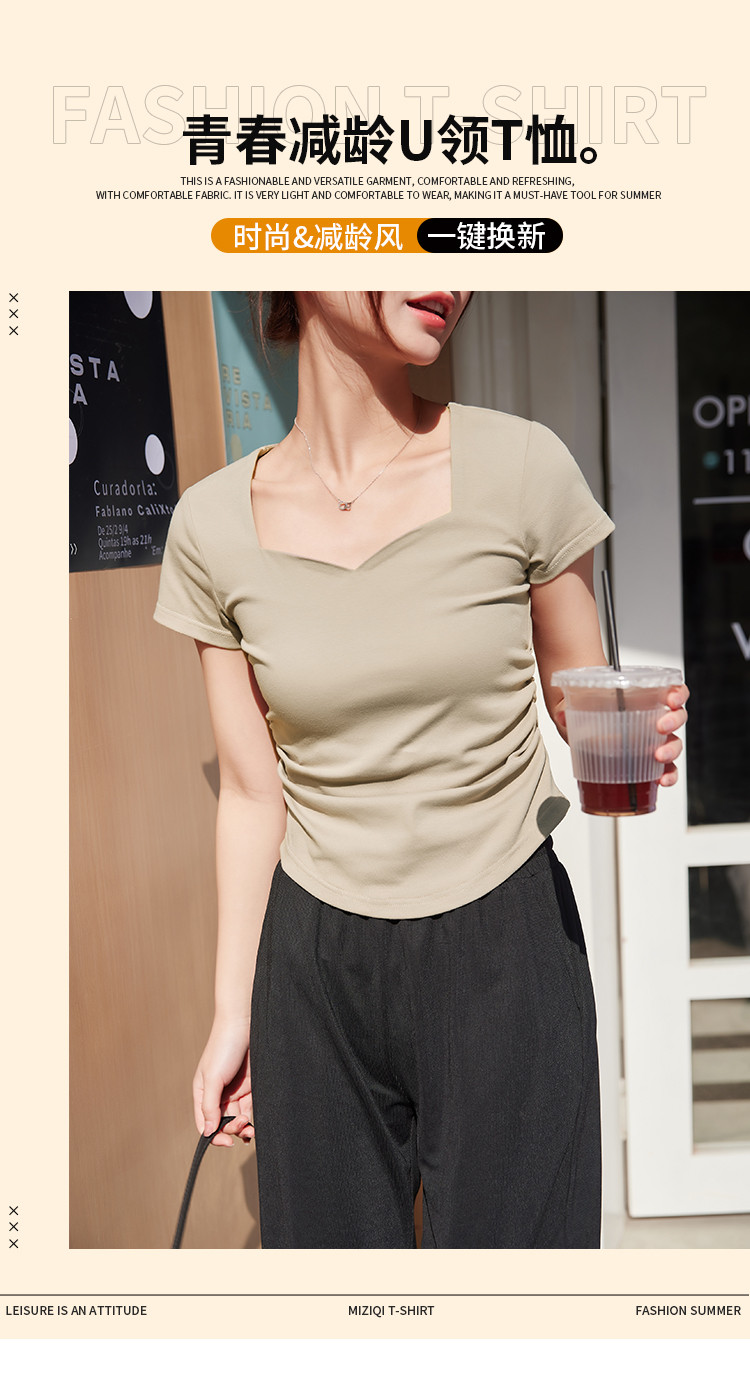 商品名称:米子旗夏季款纯色T恤女侧边褶皱修身短袖上衣 147802