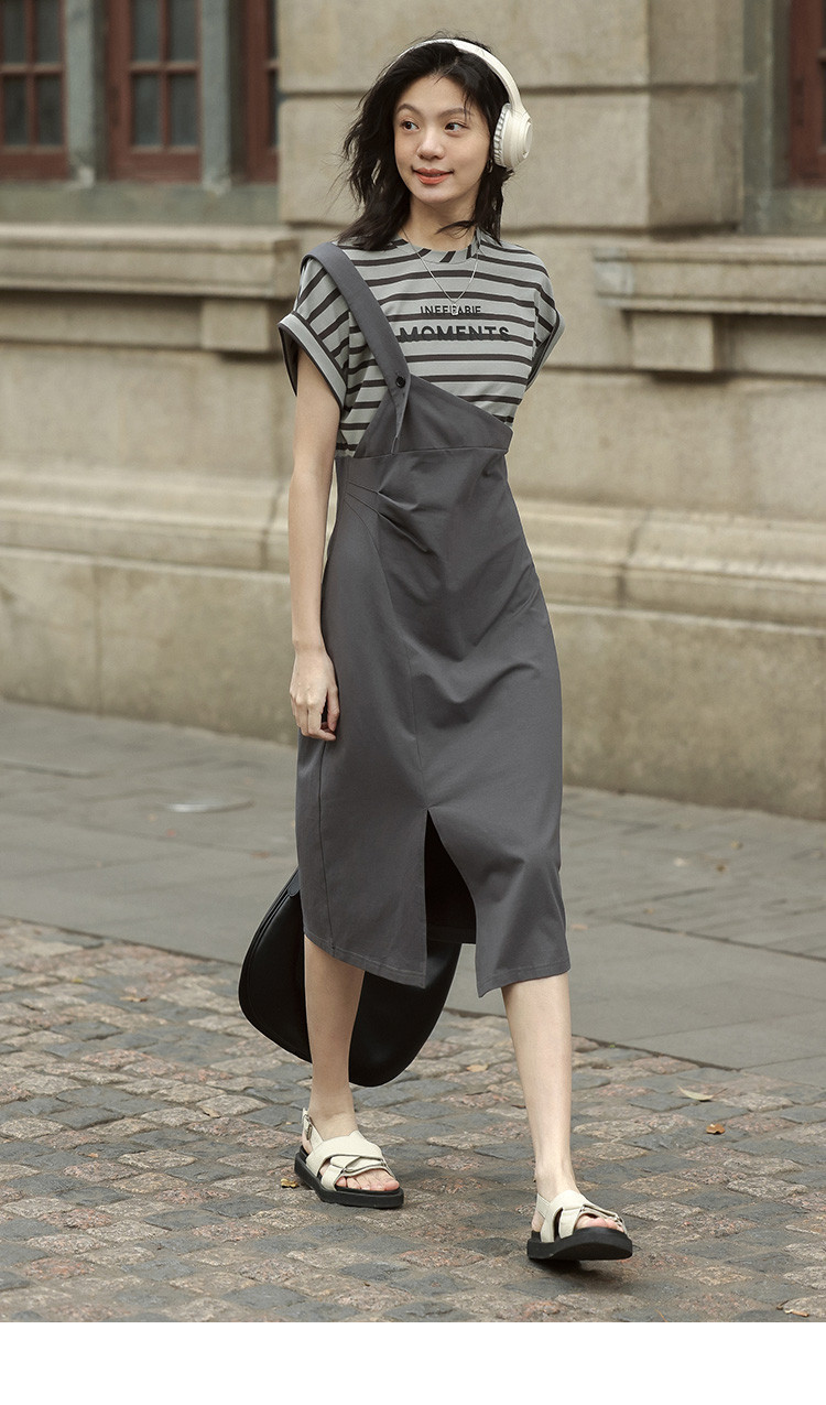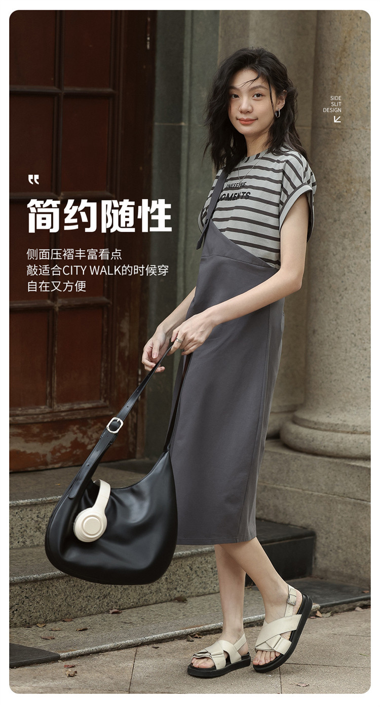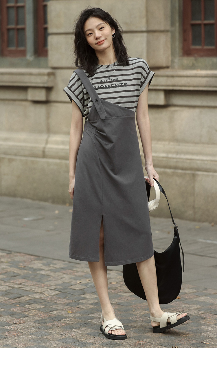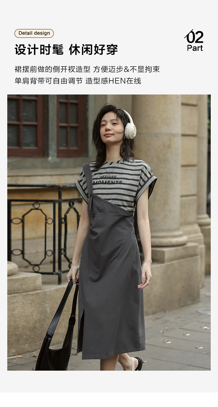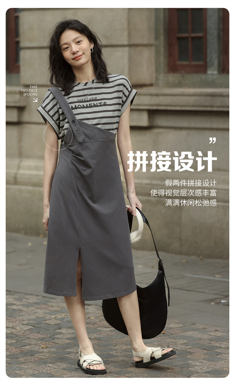 商品名称:【假两件条纹上衣中长裙】夏款圆领套头印花开叉连衣裙 641154
