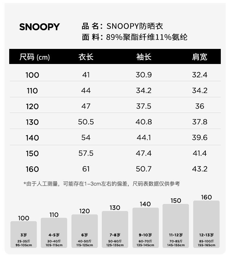 | 尺码 | 衣长(cm) | 肩宽(cm) | 身高(cm) | 袖长(cm) | 适合年龄 | 胸围(cm) | 号型 |