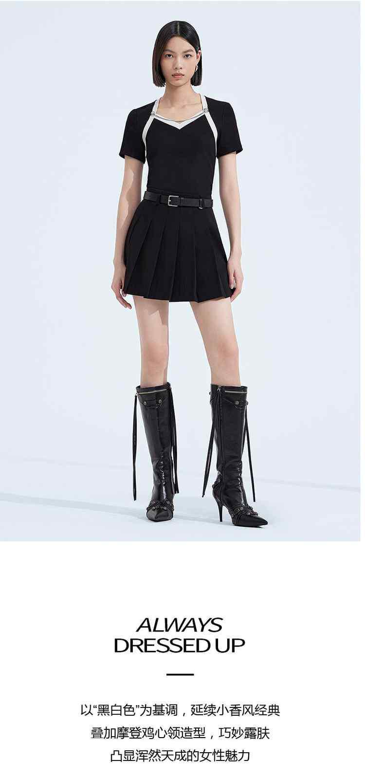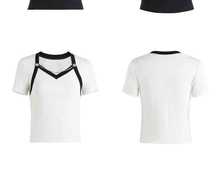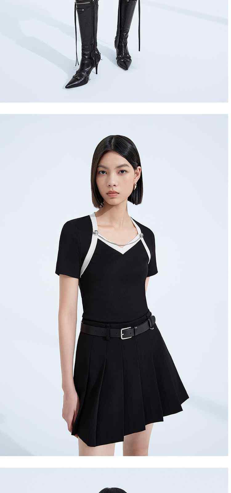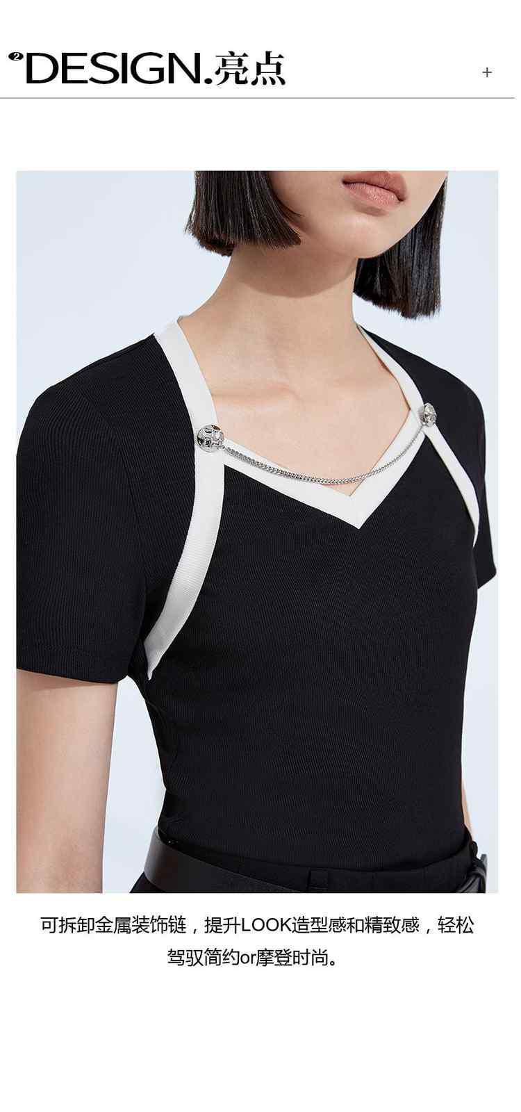 黑标系列 春装饰链鸡心领撞边t恤短袖针织衫女 469647
