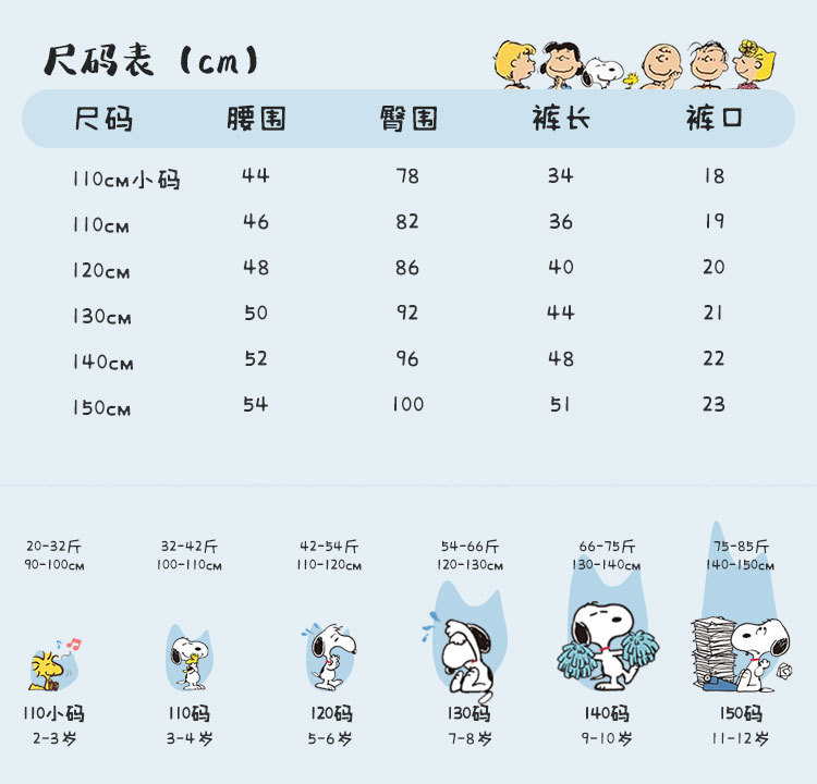 尺码 身高(cm) 腰围(cm) 裤长(cm) 臀围(cm) 适合年龄 号型