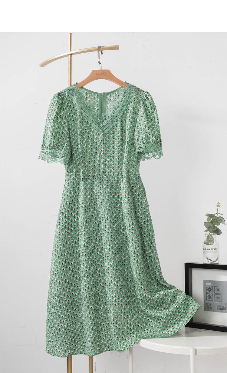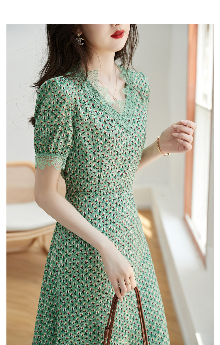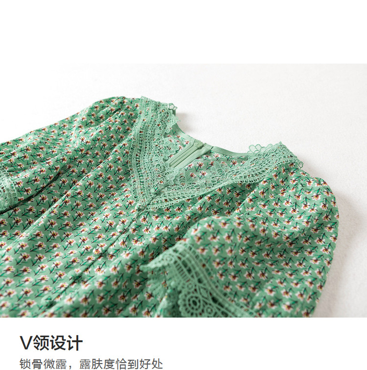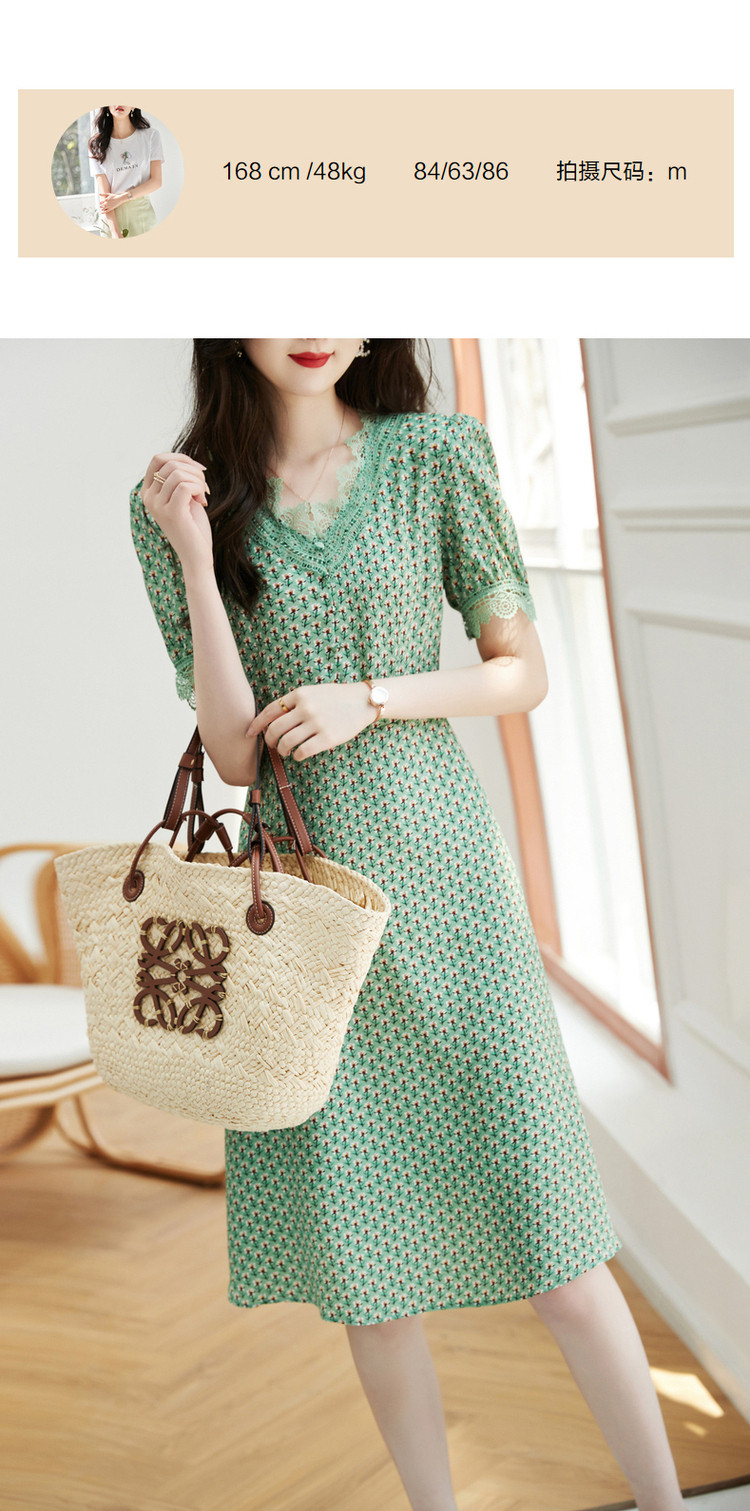 商品名称:【蕾丝拼接V领茶歇裙】夏短袖印花a字收腰修身连衣裙女 245953