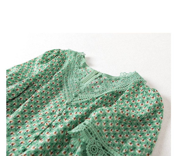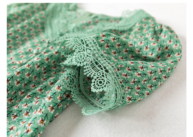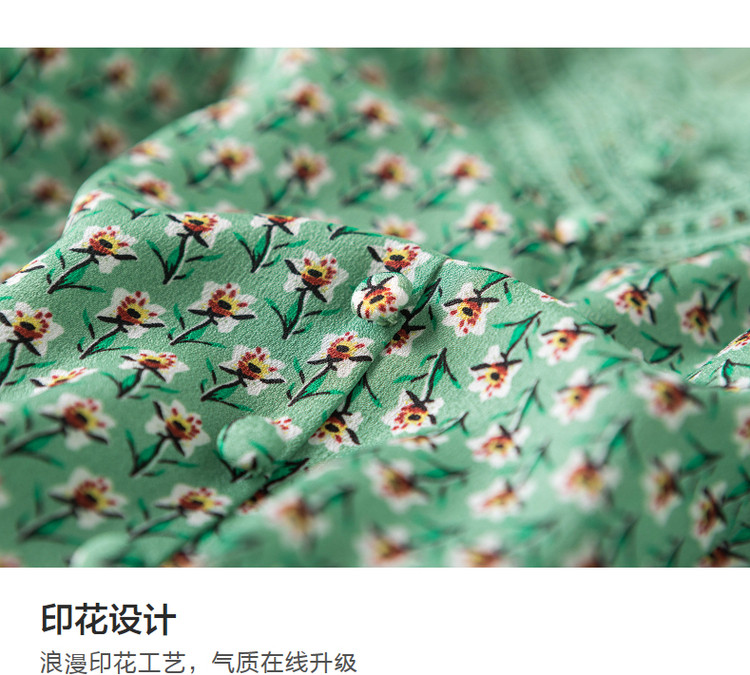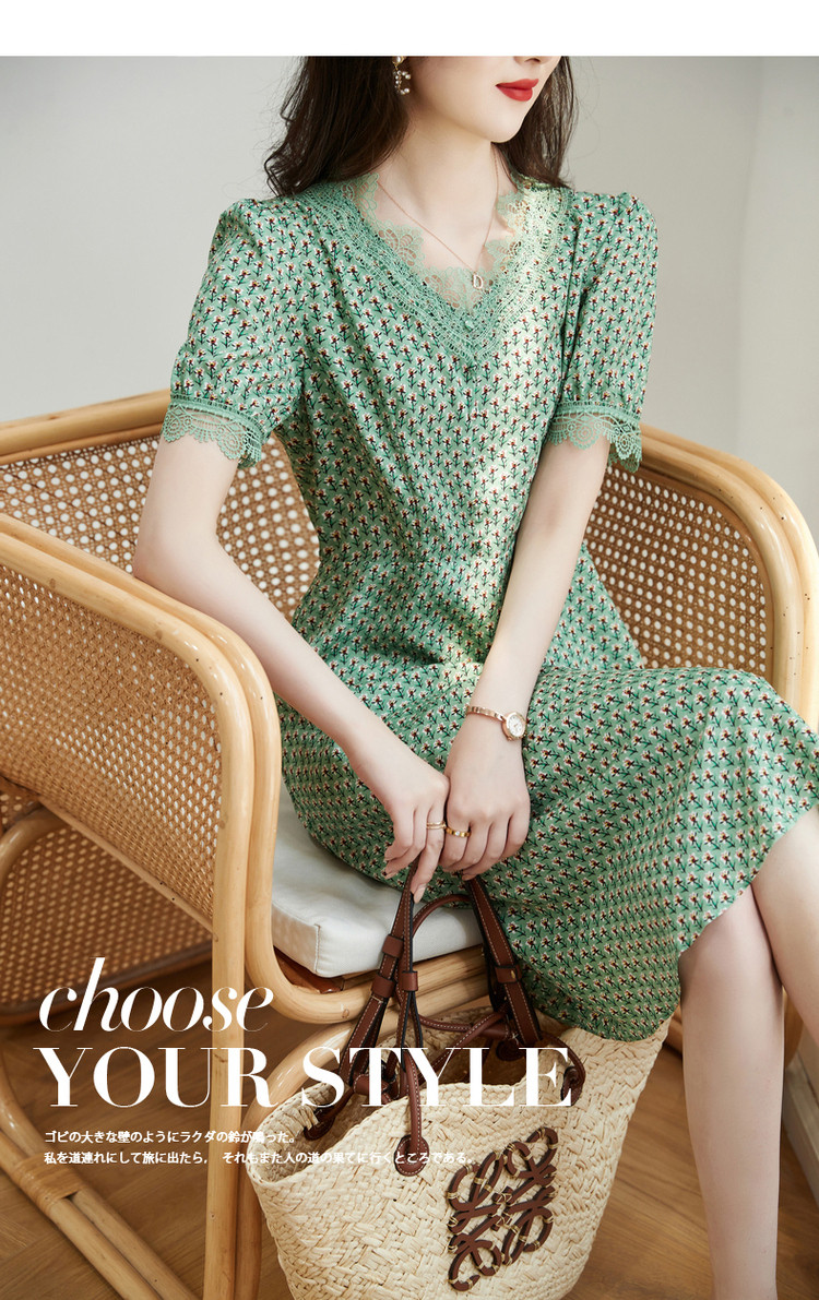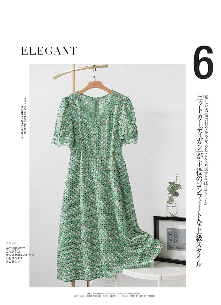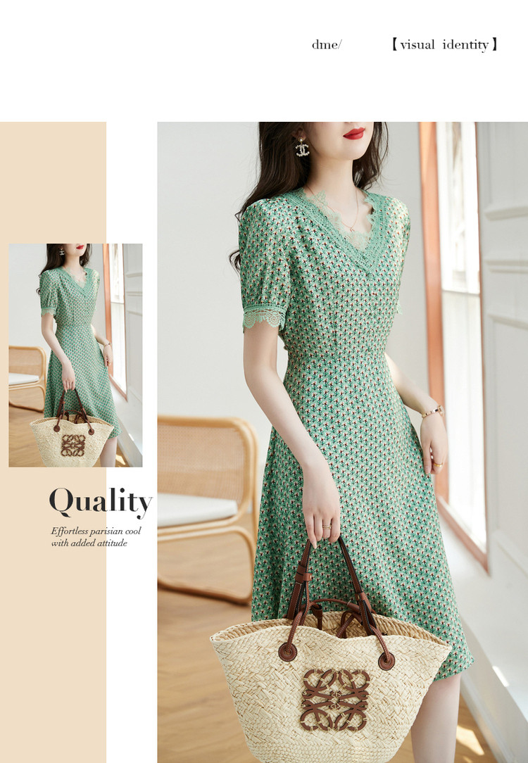 商品名称:【蕾丝拼接V领茶歇裙】夏短袖印花a字收腰修身连衣裙女 245953