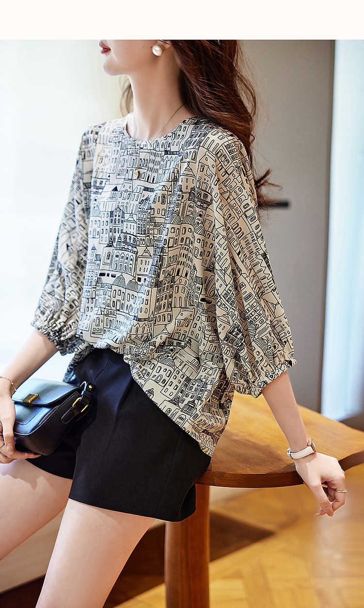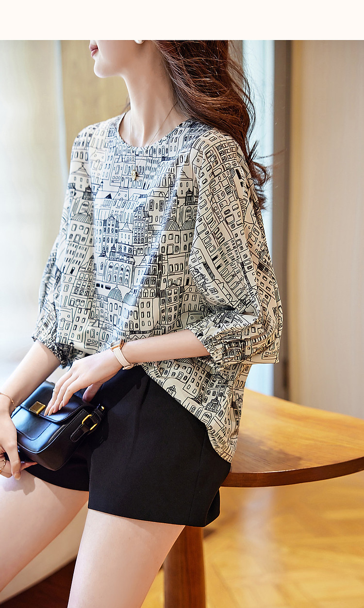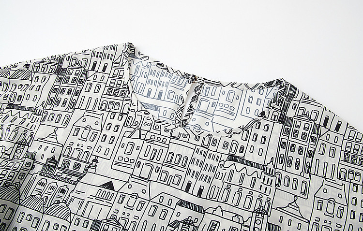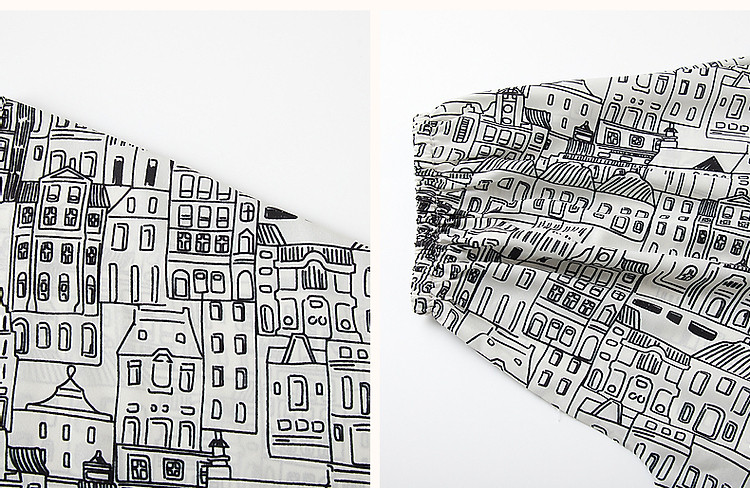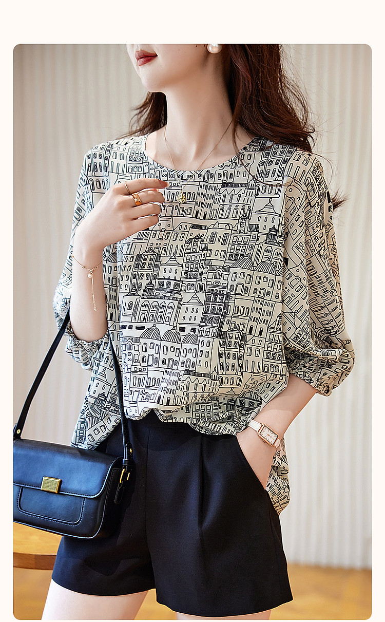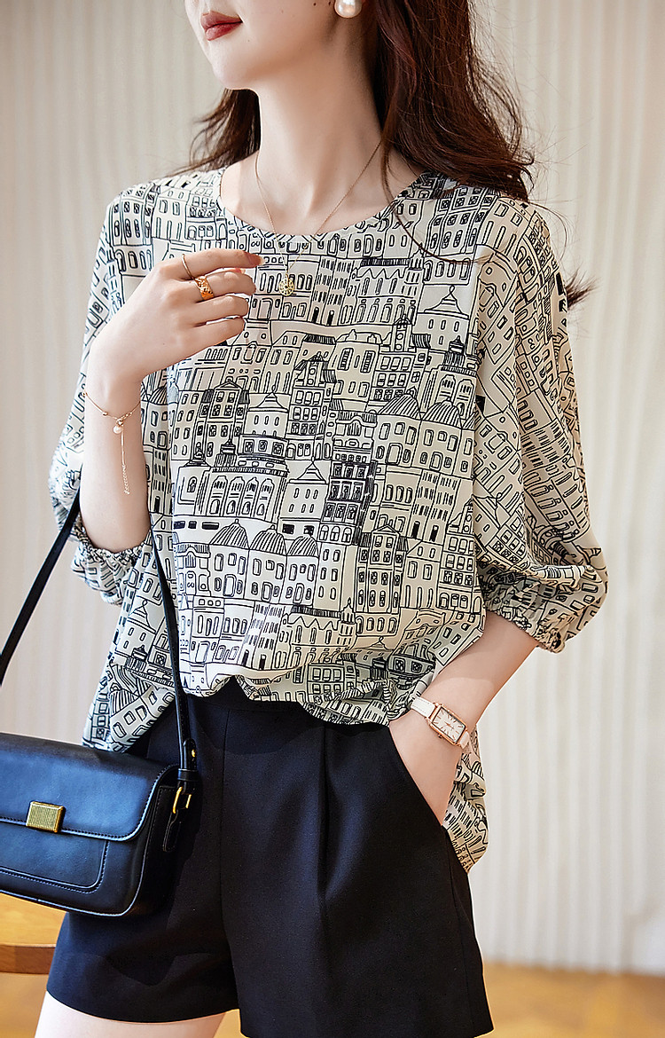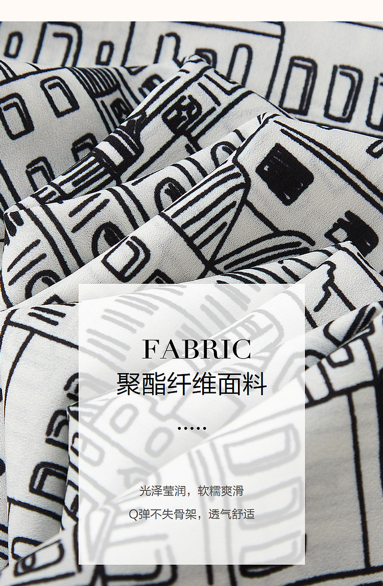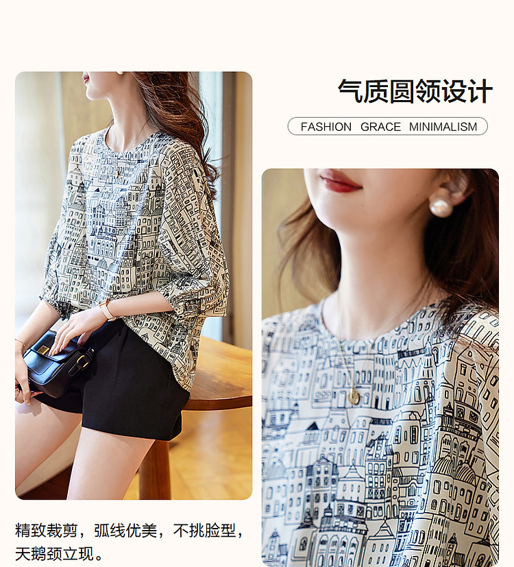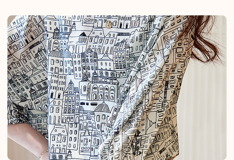 商品名称:【漫游城市】夏设计感线条建筑印花衬衫舒滑复合丝花瑶衬衣女上衣 942017