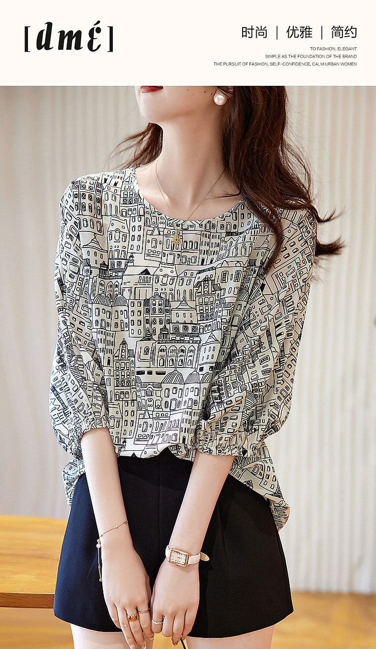 【漫游城市】夏设计感线条建筑印花衬衫舒滑复合丝花瑶衬衣女上衣 942017
