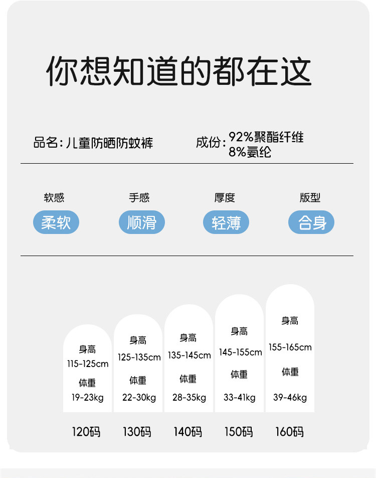 商品名称:儿童裤子儿童防蚊裤夏季薄款防遮阳晒中大童洋气男女童百搭裤子潮 145183