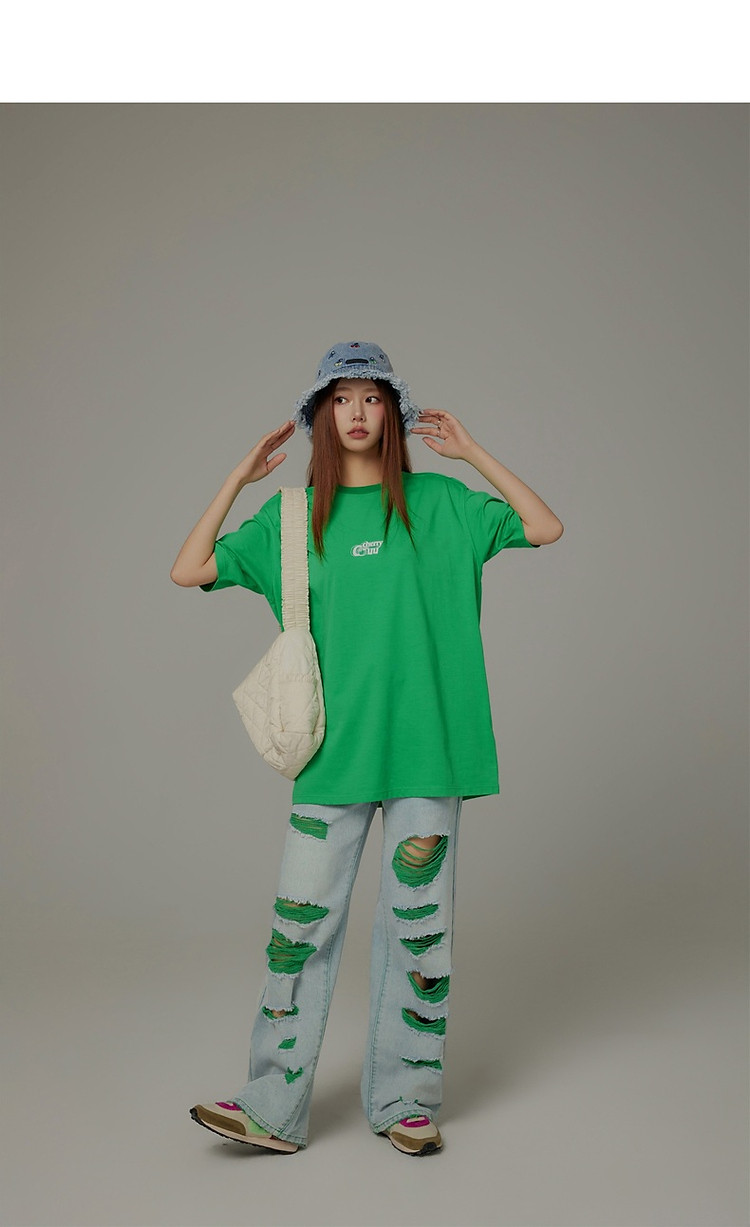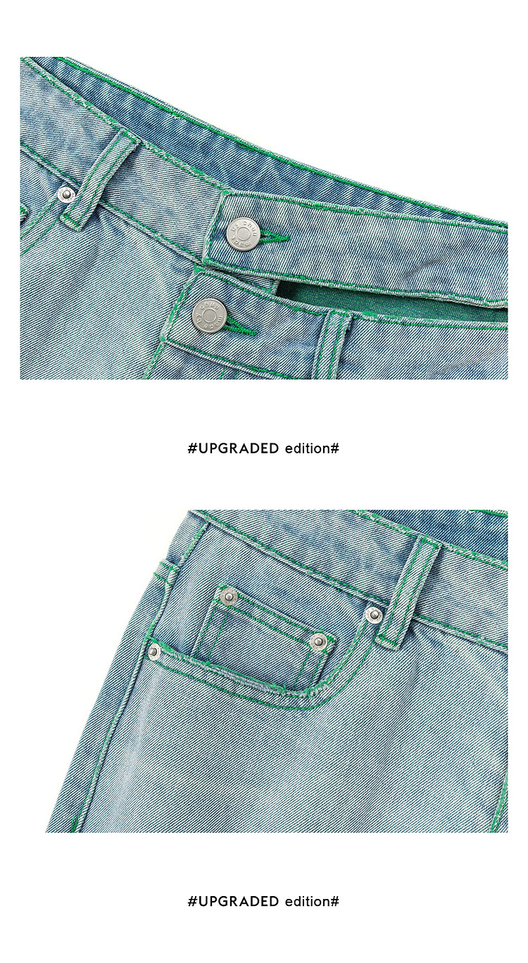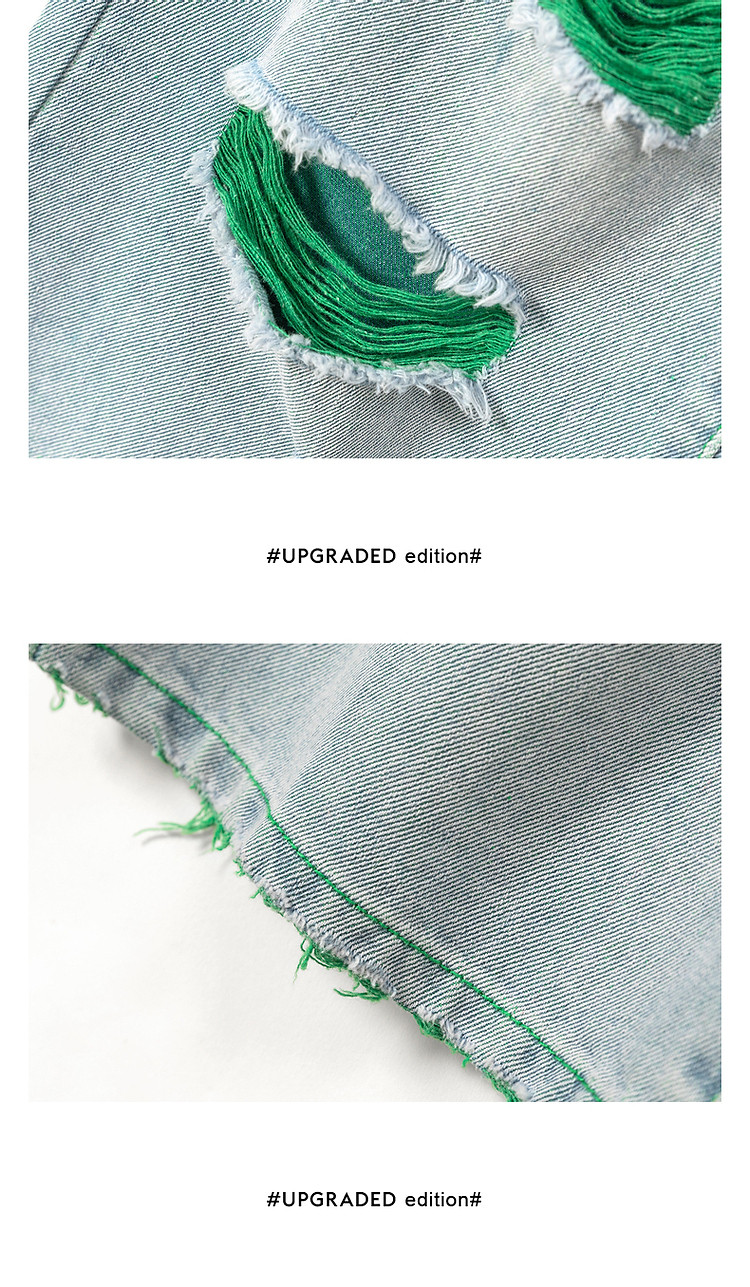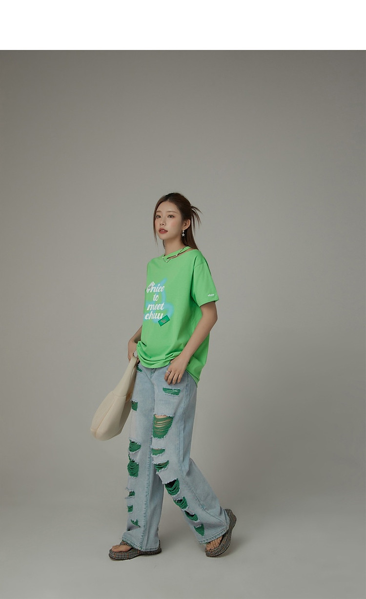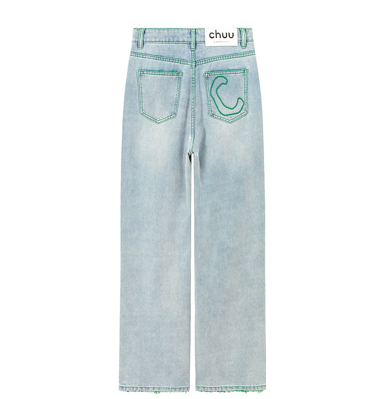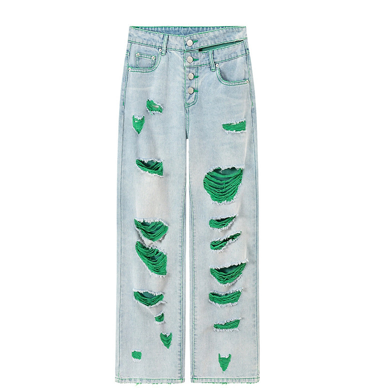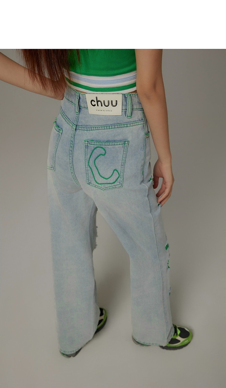 CHUU撞色破洞阔腿牛仔裤女夏单排扣镂空磨破长裤 267411