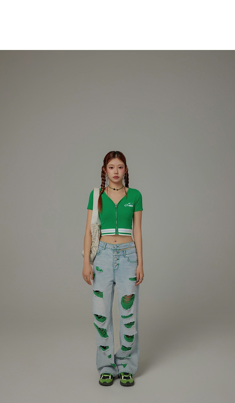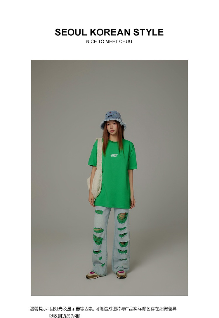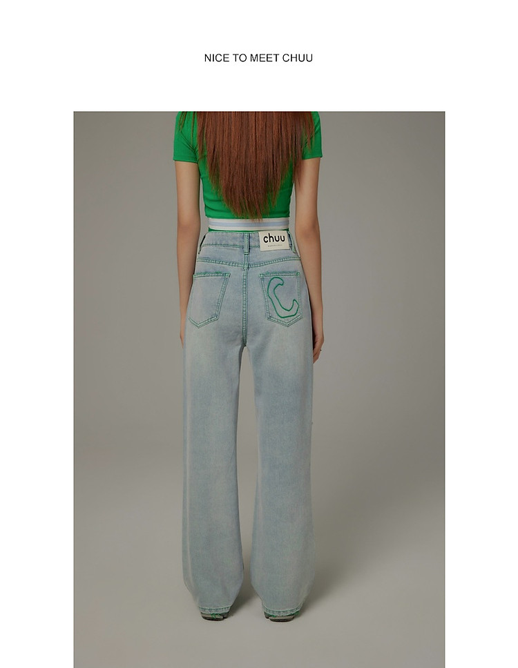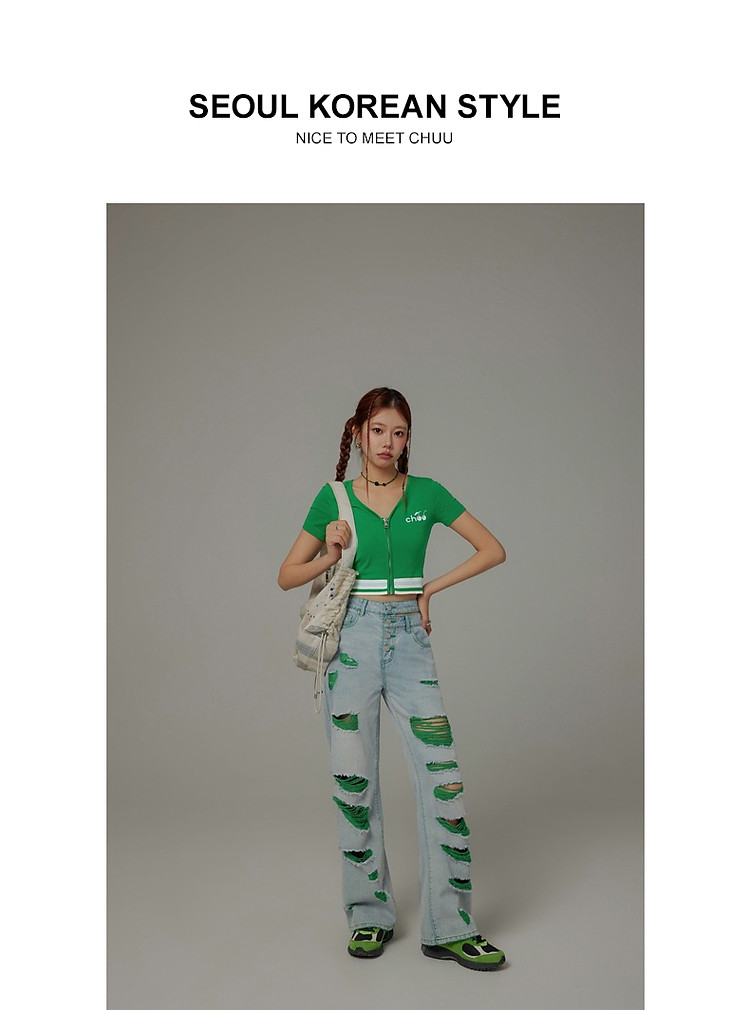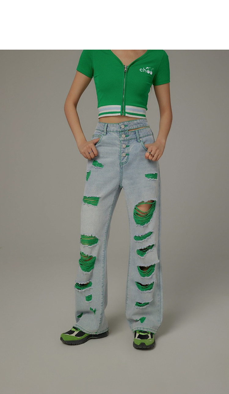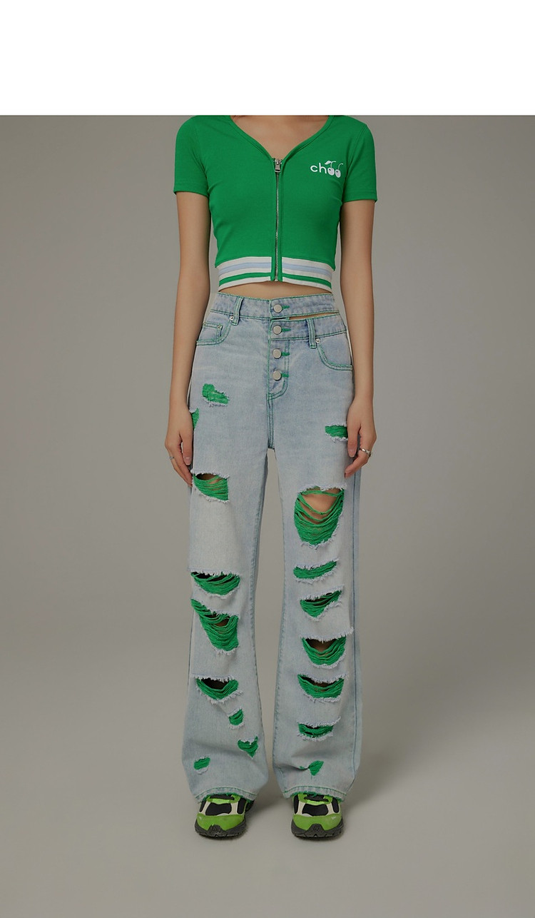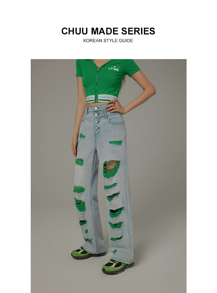 商品名称:CHUU撞色破洞阔腿牛仔裤女夏单排扣镂空磨破长裤 267411