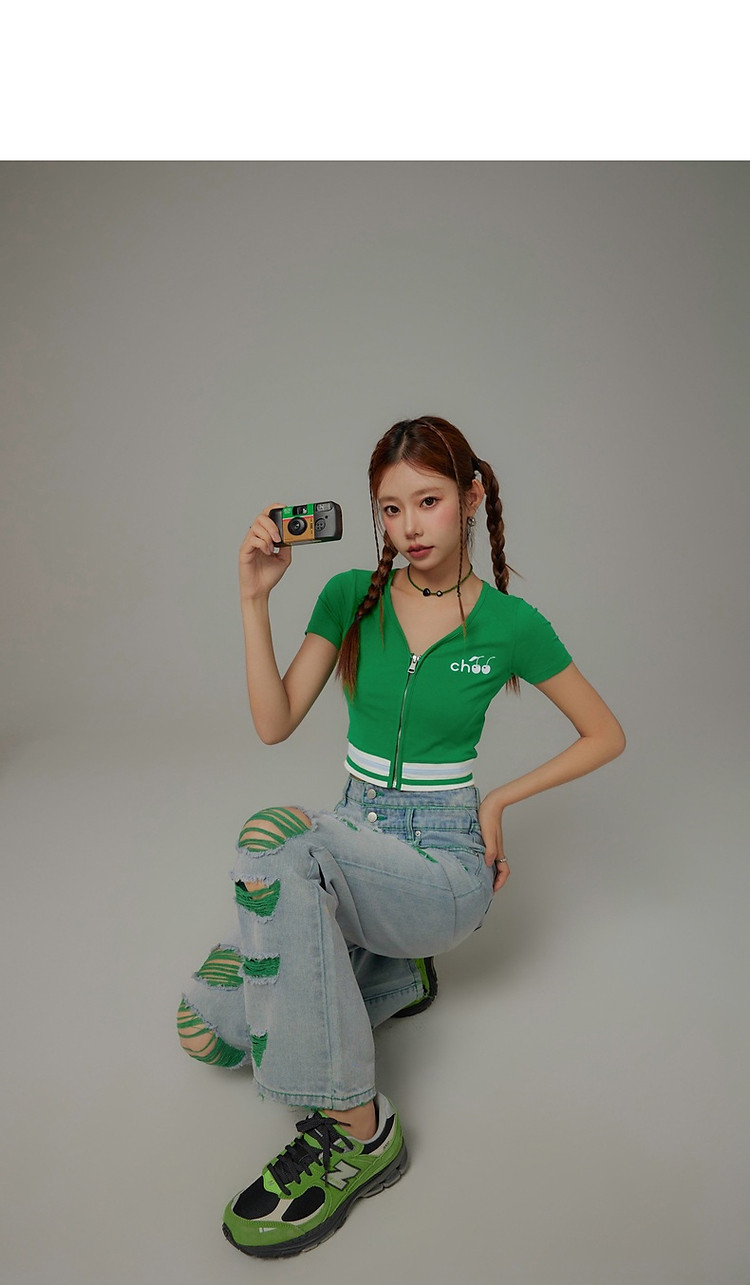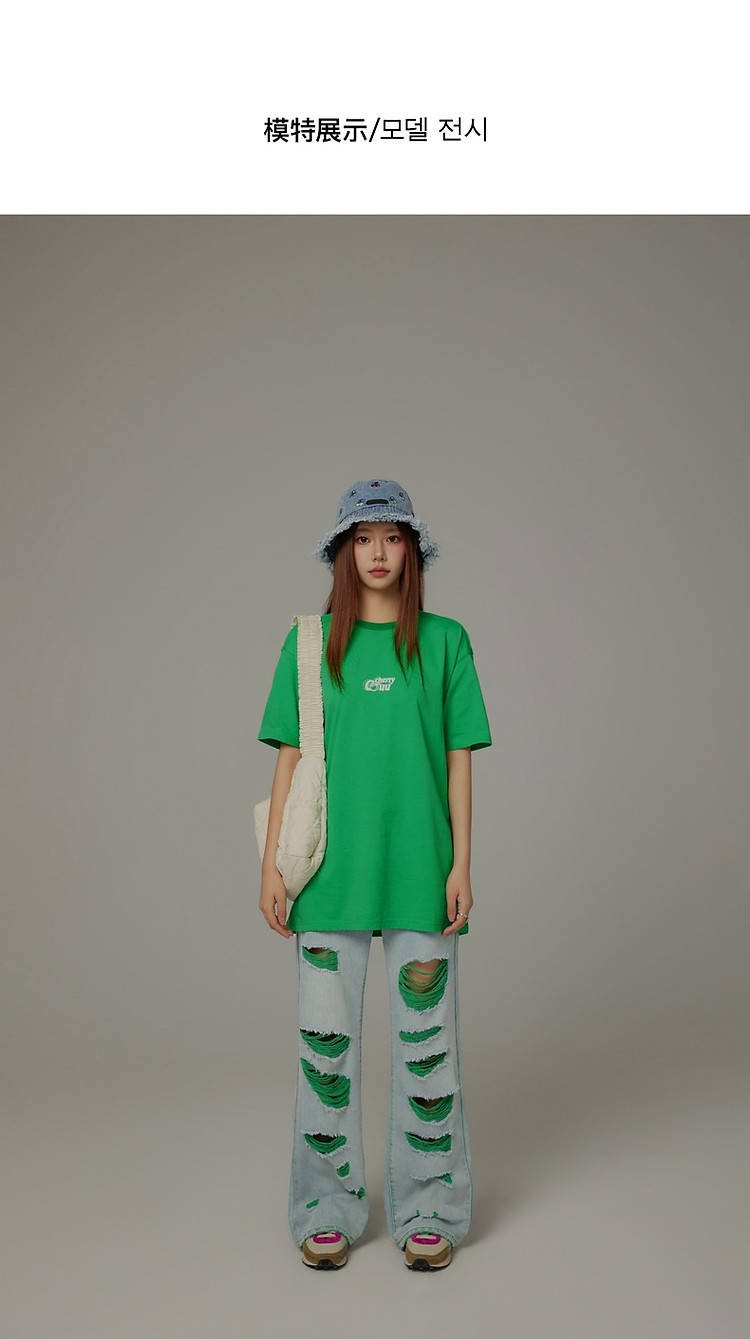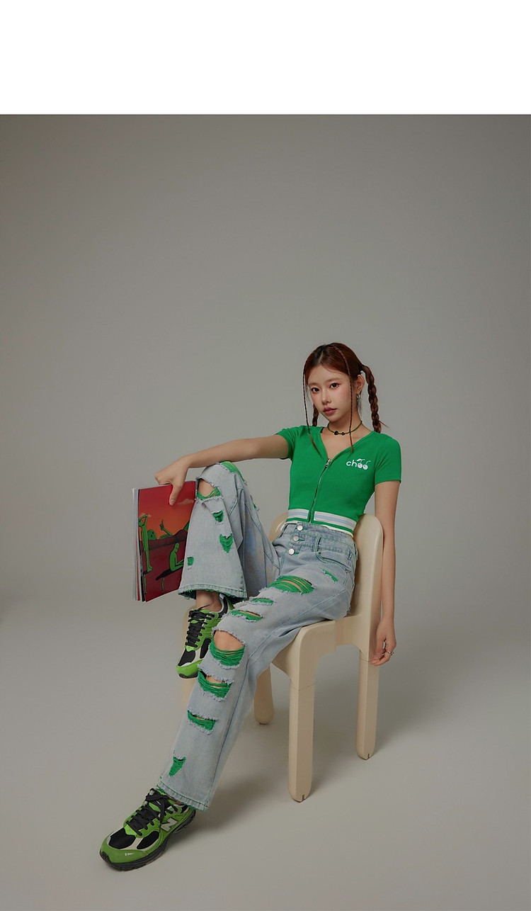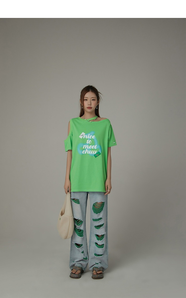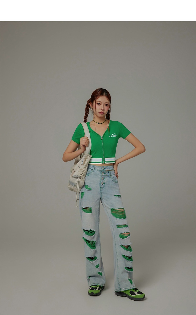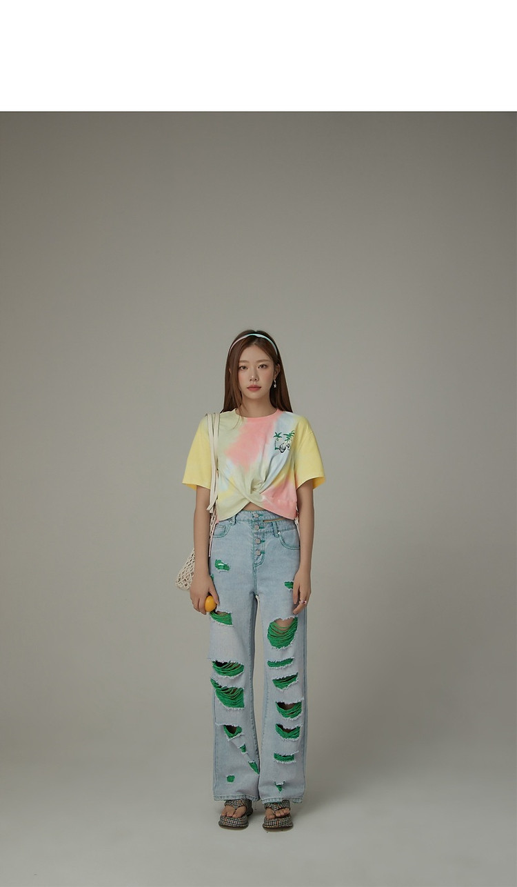 商品名称:CHUU撞色破洞阔腿牛仔裤女夏单排扣镂空磨破长裤 267411