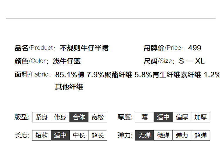 商品名称:【不规则棉质牛仔a字半身裙】夏中腰休闲半身裙女 142913