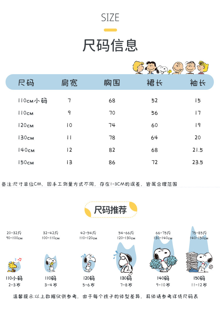 | 尺码 | 裙长(cm) | 肩宽(cm) | 身高(cm) | 袖长(cm) | 适合年龄 | 胸围(cm) | 号型 |