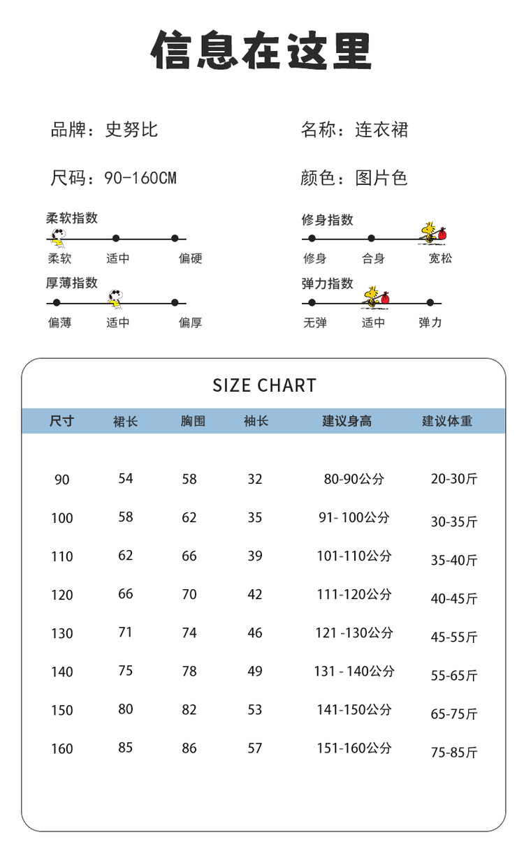 | 尺码 | 裙长(cm) | 身高(cm) | 袖长(cm) | 适合年龄 | 胸围(cm) | 号型 |
