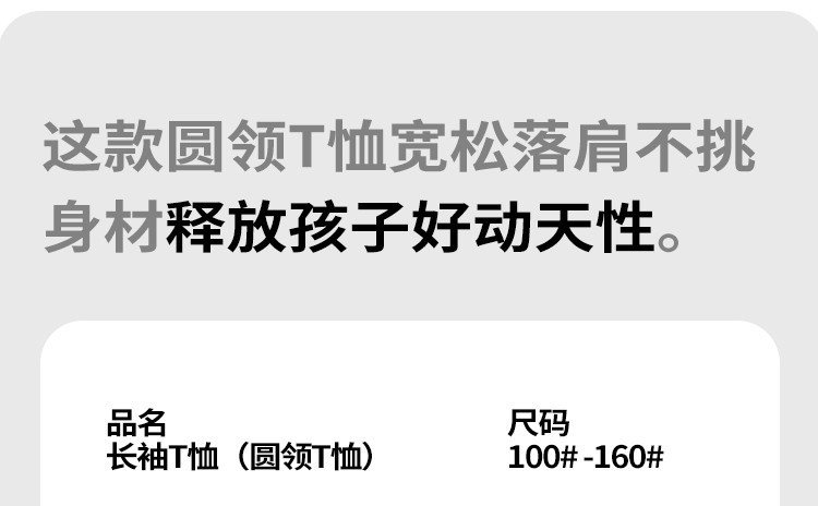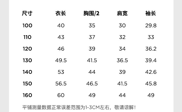 | 尺码 | 衣长(cm) | 肩宽(cm) | 袖长(cm) | 适合年龄 | 胸围(cm) | 号型 |