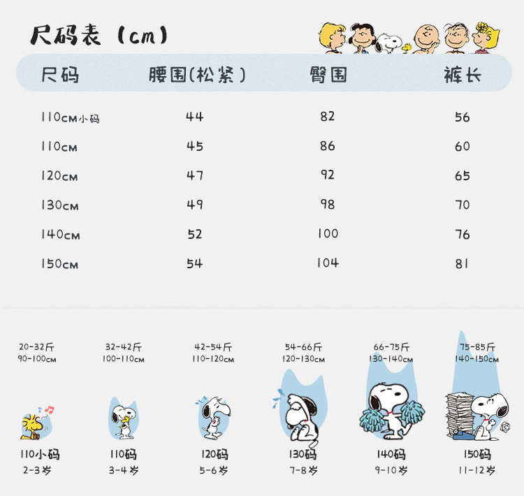 | 尺码 | 身高(cm) | 腰围(cm) | 裤长(cm) | 臀围(cm) | 适合年龄 | 号型 |