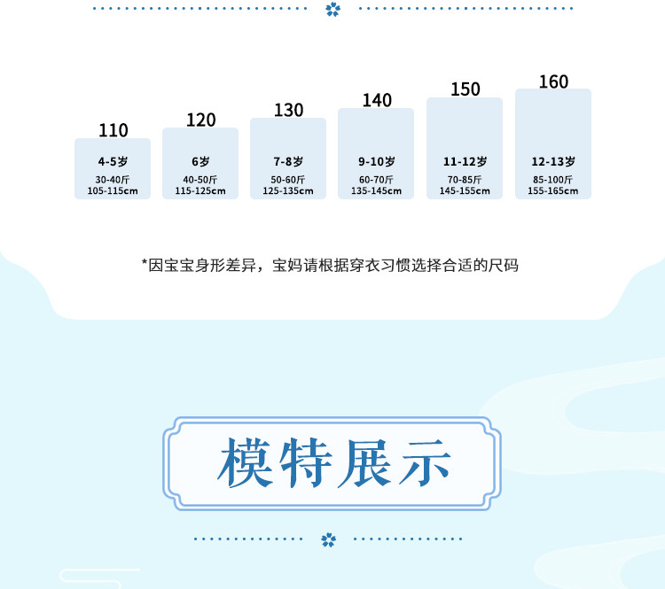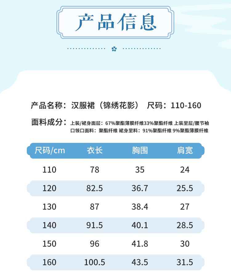 | 尺码 | 裙长(cm) | 肩宽(cm) | 身高(cm) | 袖长(cm) | 适合年龄 | 胸围(cm) | 号型 |