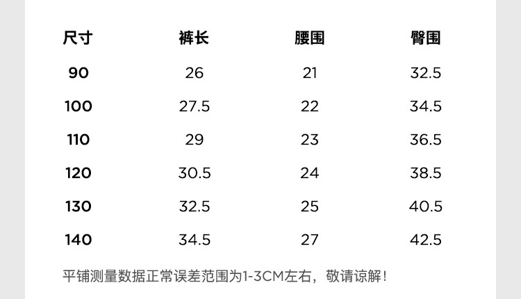 | 尺码 | 身高(cm) | 腰围(cm) | 裤长(cm) | 臀围(cm) | 适合年龄 | 号型 |
