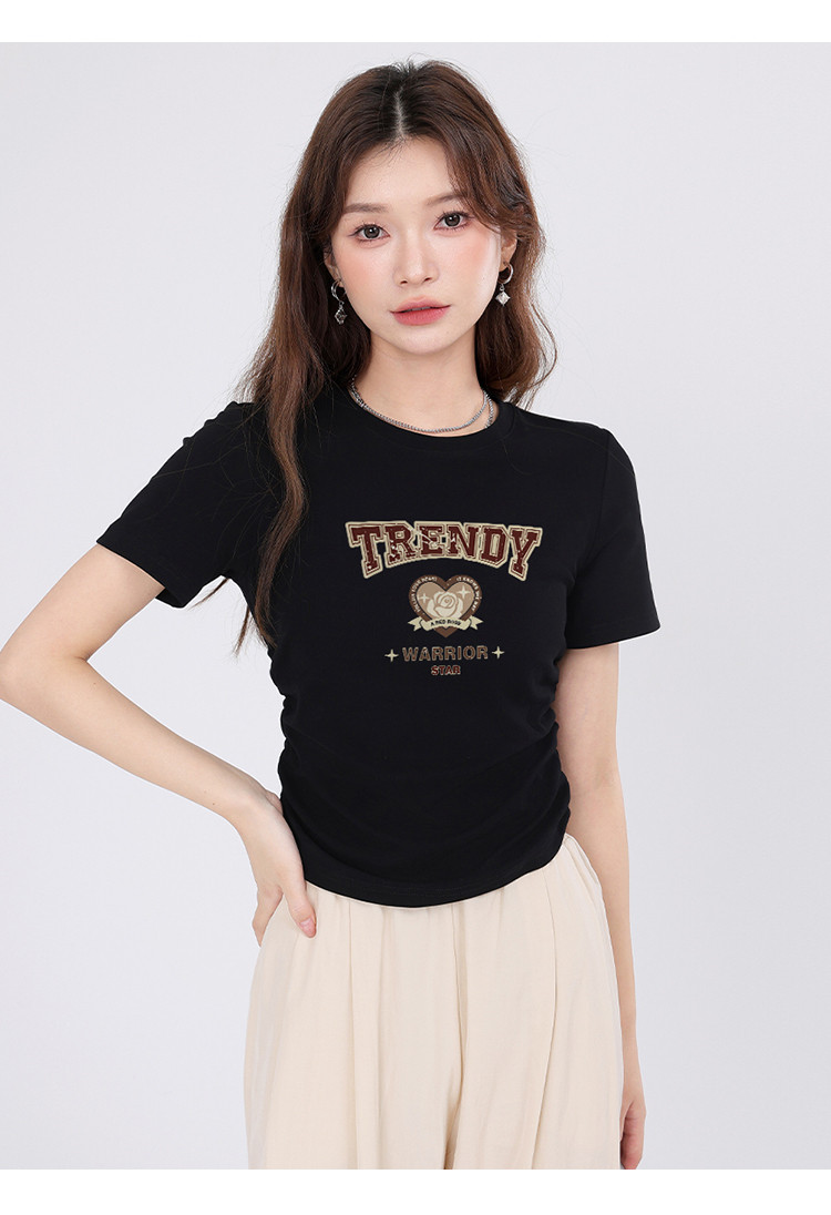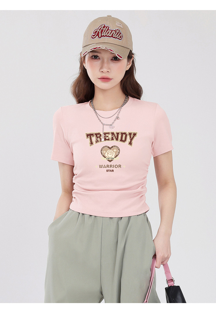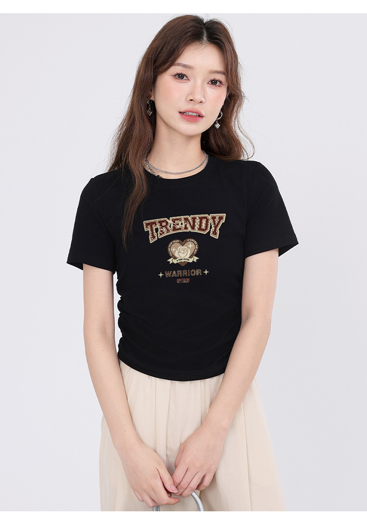 【女装正肩】女式短款小个子T恤紧身显瘦夏季小众抽褶设计感短袖 555283