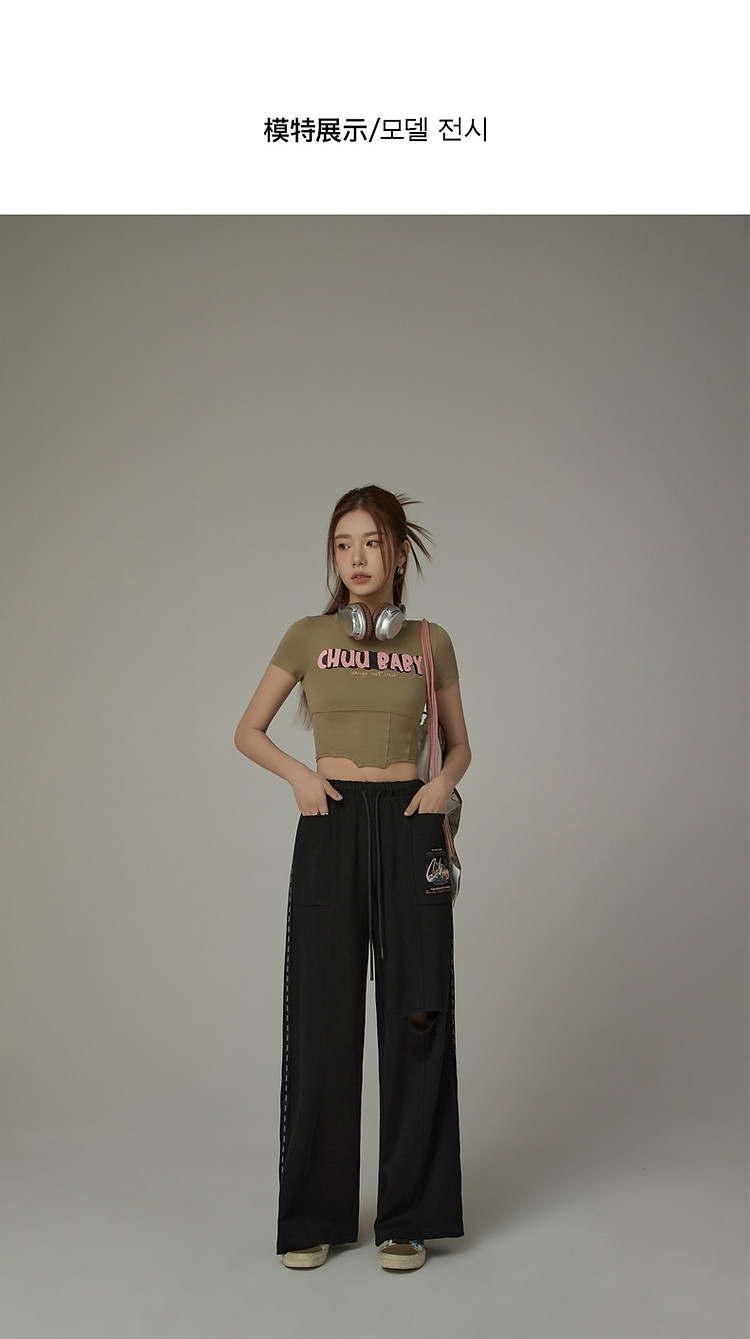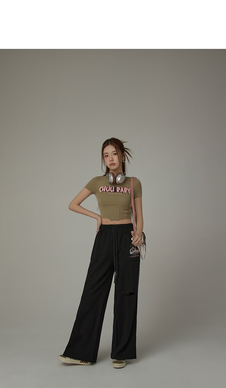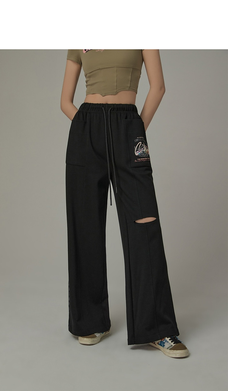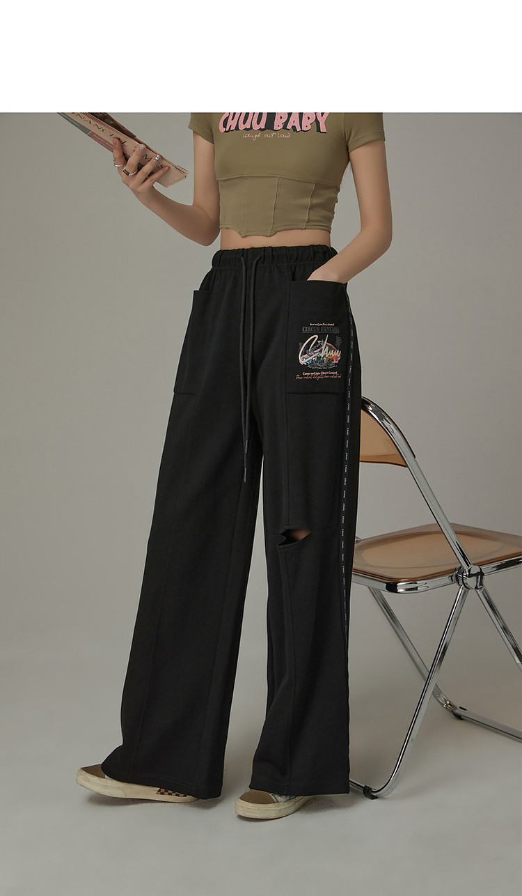 字母印花休闲裤女夏松紧腰系带宽松阔腿裤子 504979