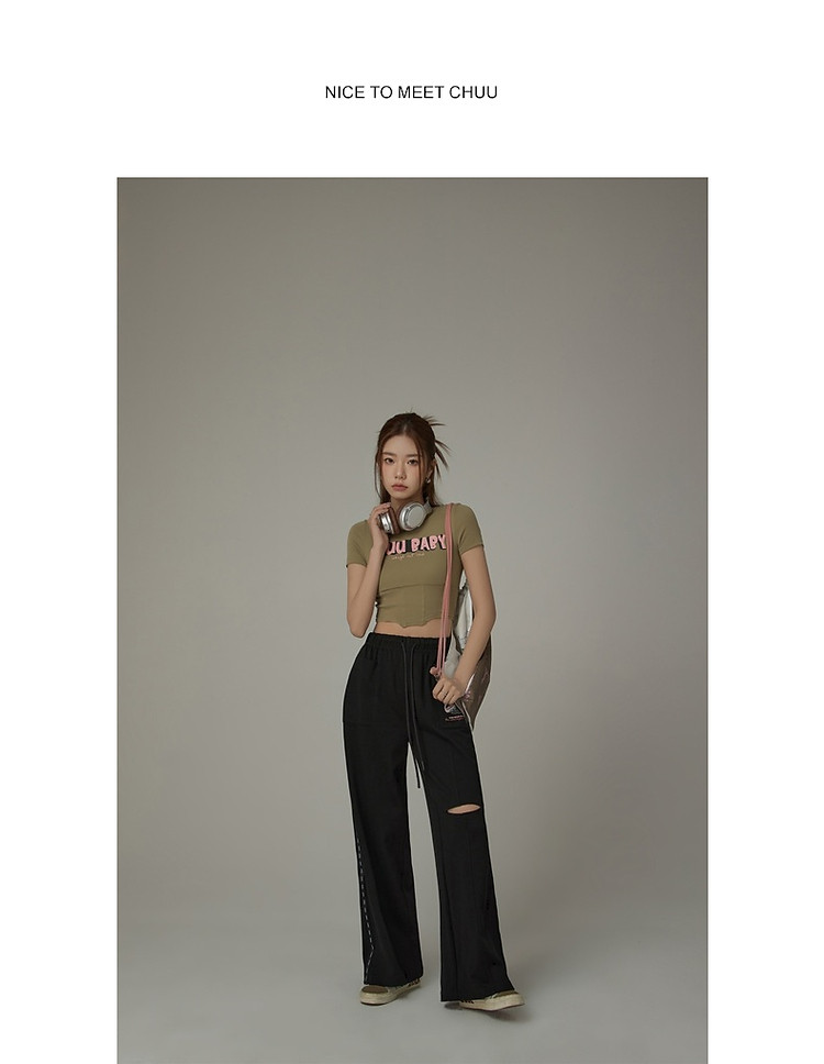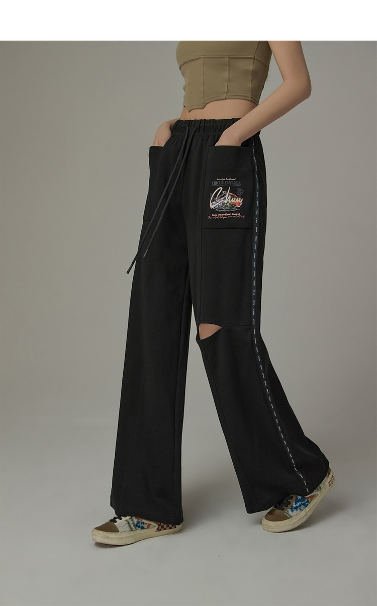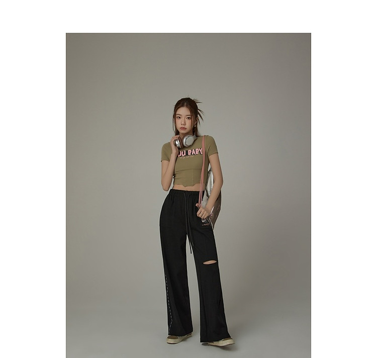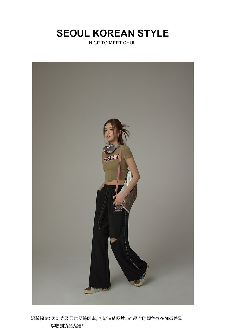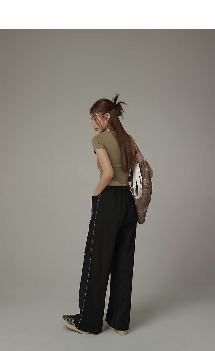 字母印花休闲裤女夏松紧腰系带宽松阔腿裤子 504979