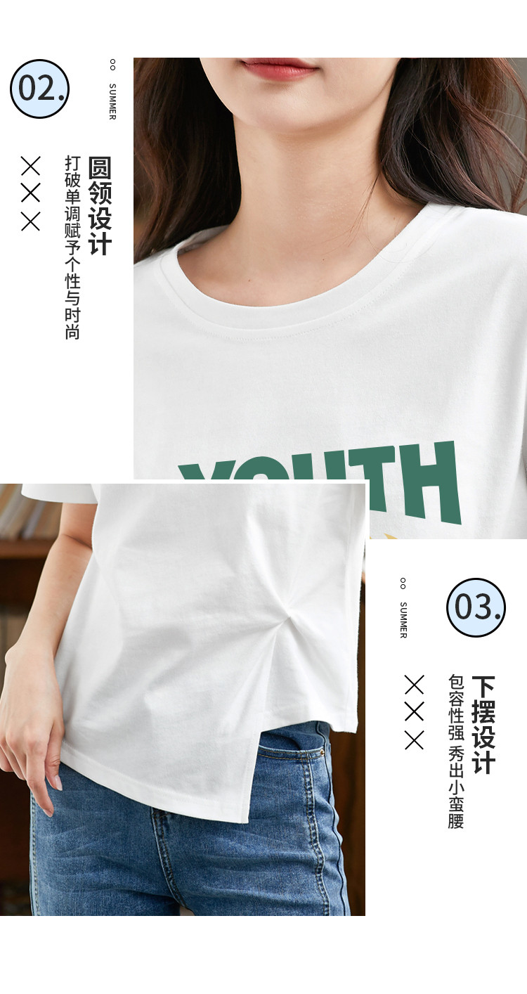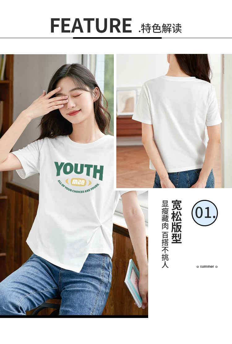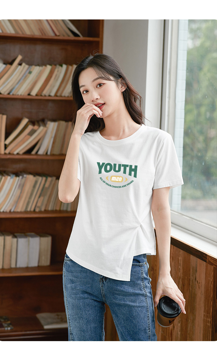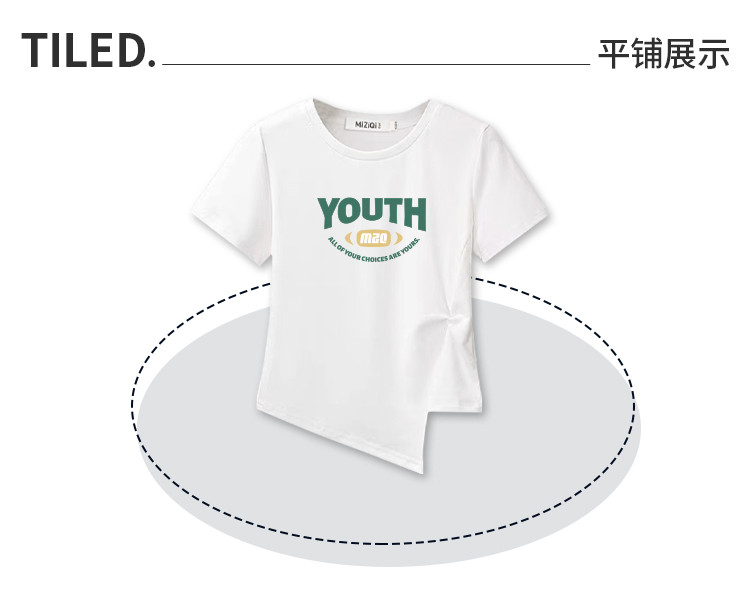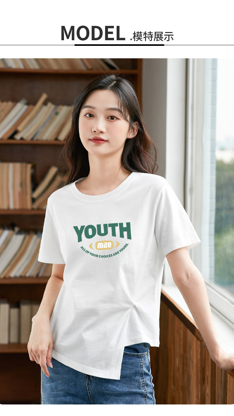 商品名称:米子旗夏季圆领印花女式T恤不规则设计宽松减龄短袖上衣 231514