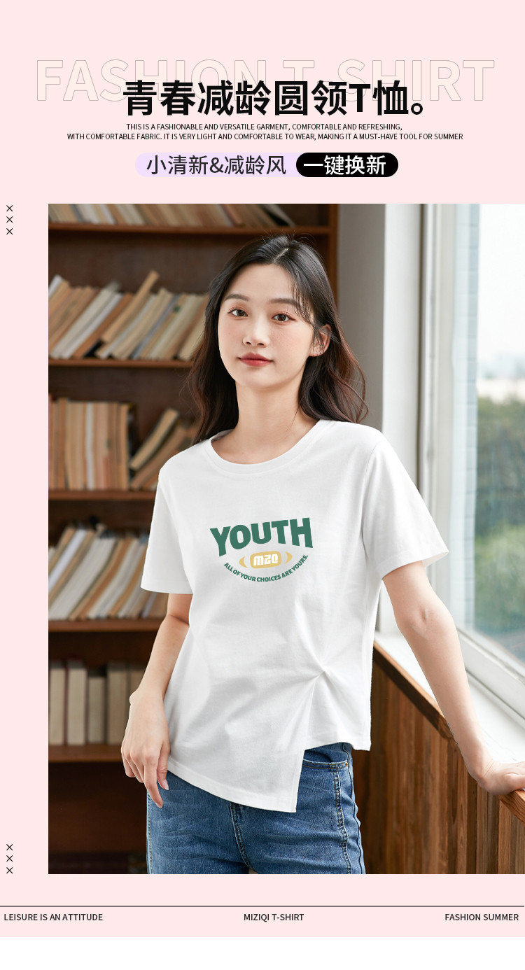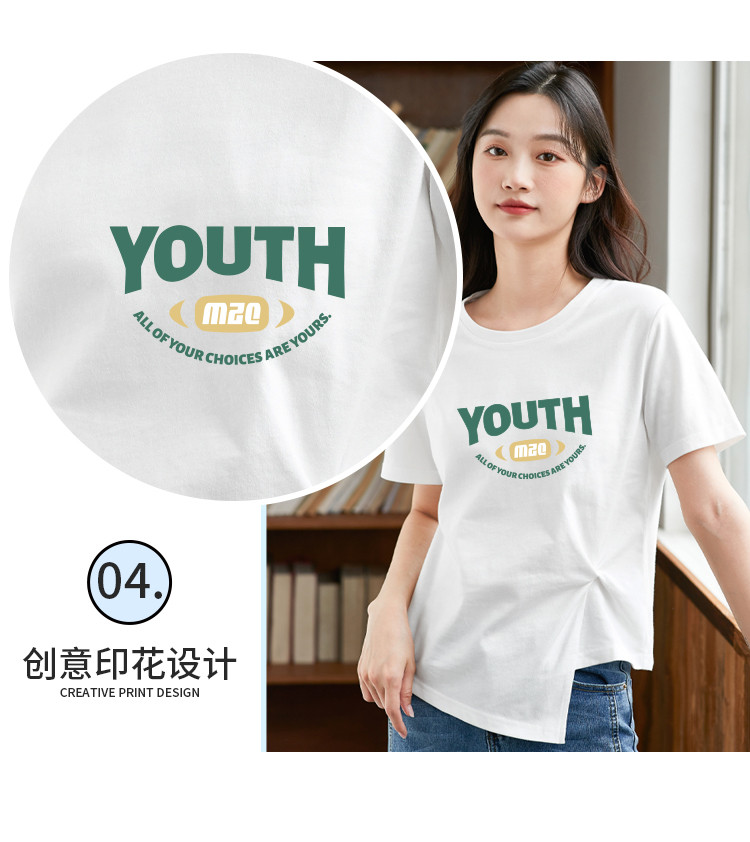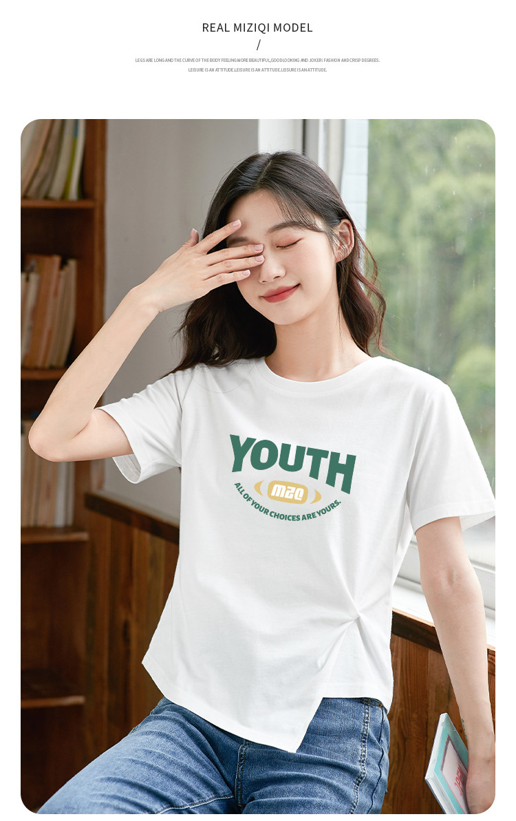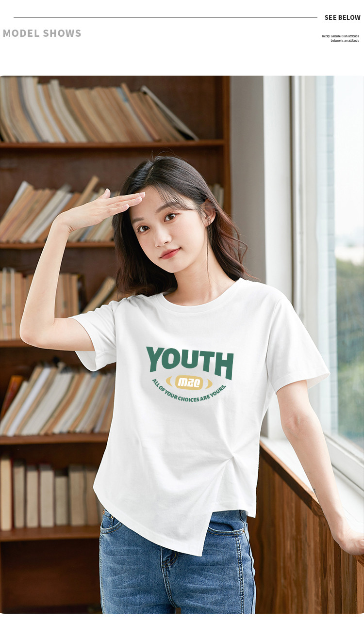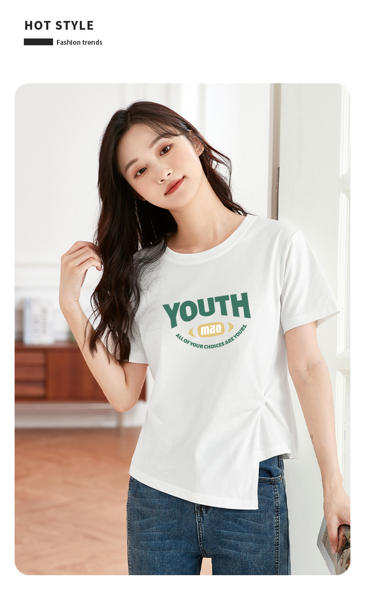 商品名称:米子旗夏季圆领印花女式T恤不规则设计宽松减龄短袖上衣 231514