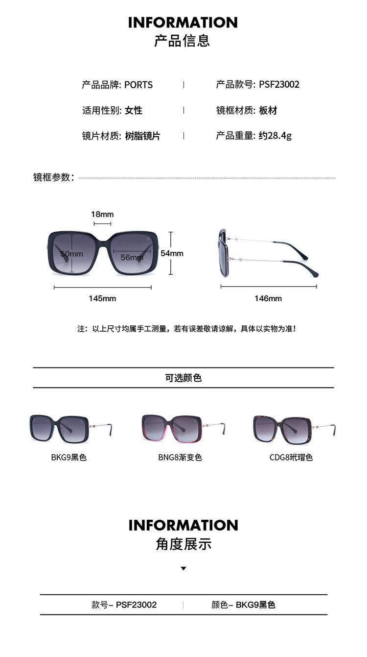 商品名称:PORTS女款日常板材经典小方框太阳镜PSF23002 168842