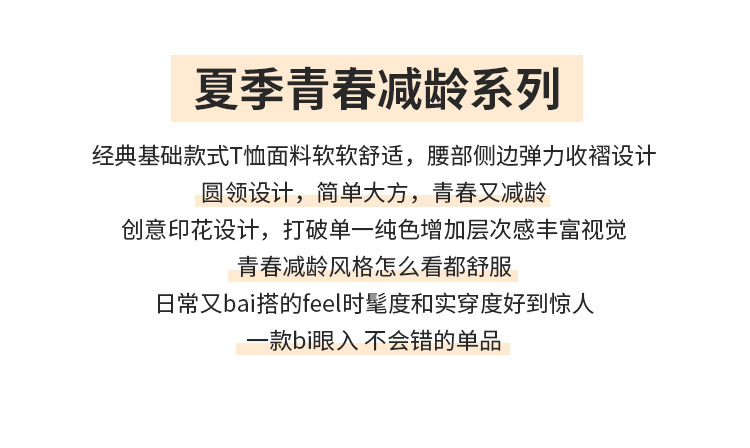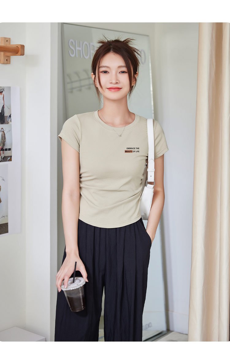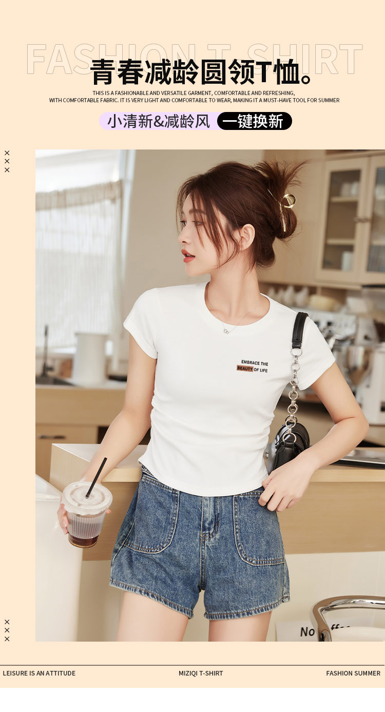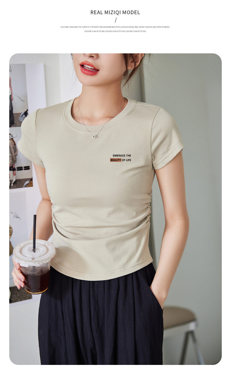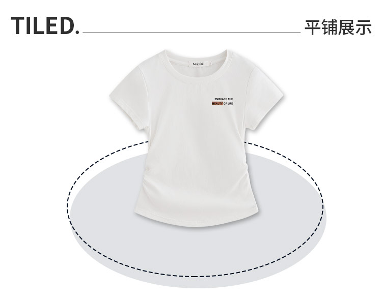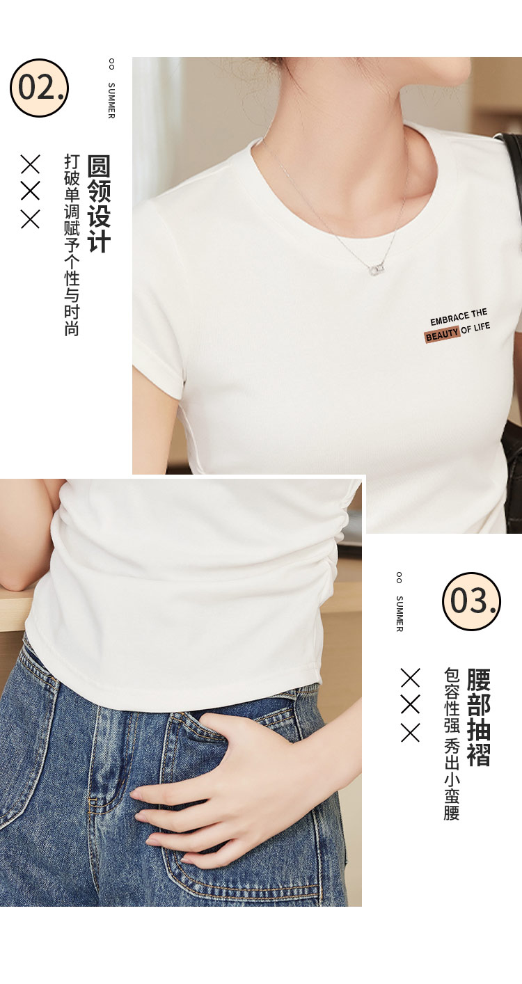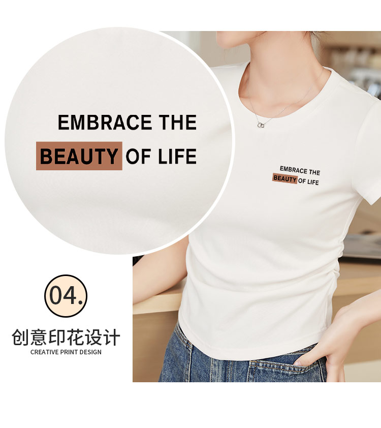商品名称:米子旗夏季圆领印花女式T恤侧边抽褶设计短款修身正肩短袖上衣 822362