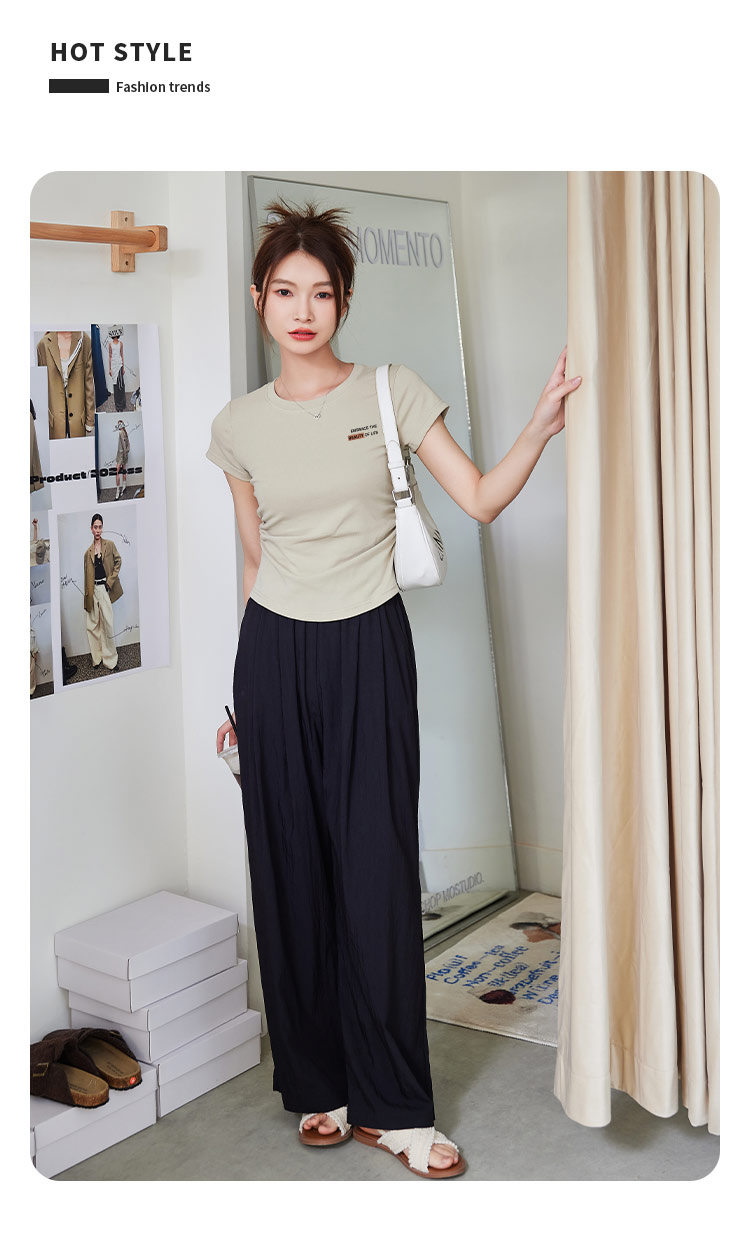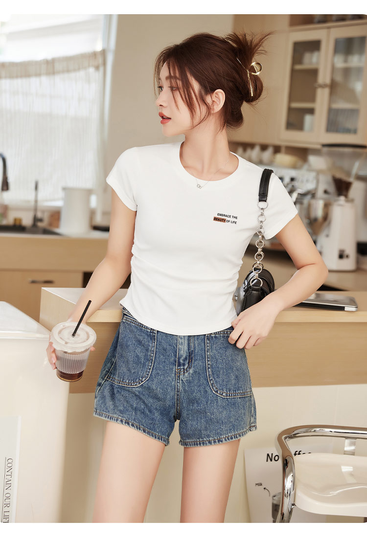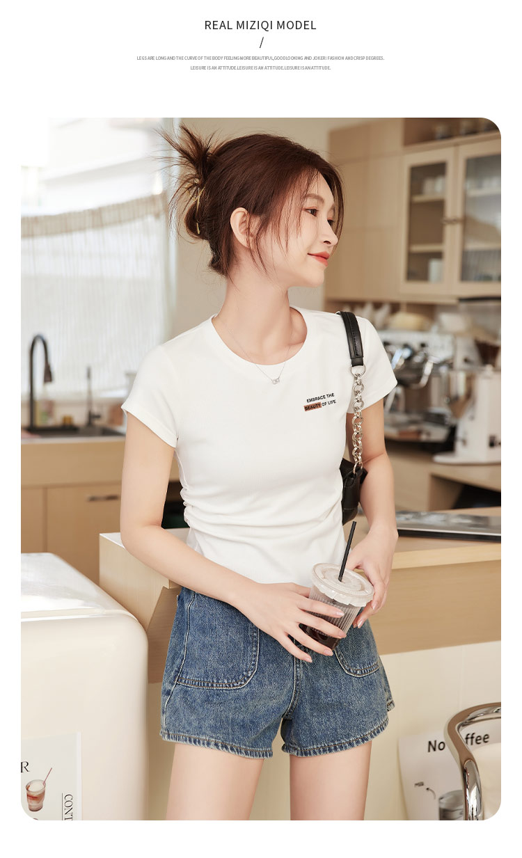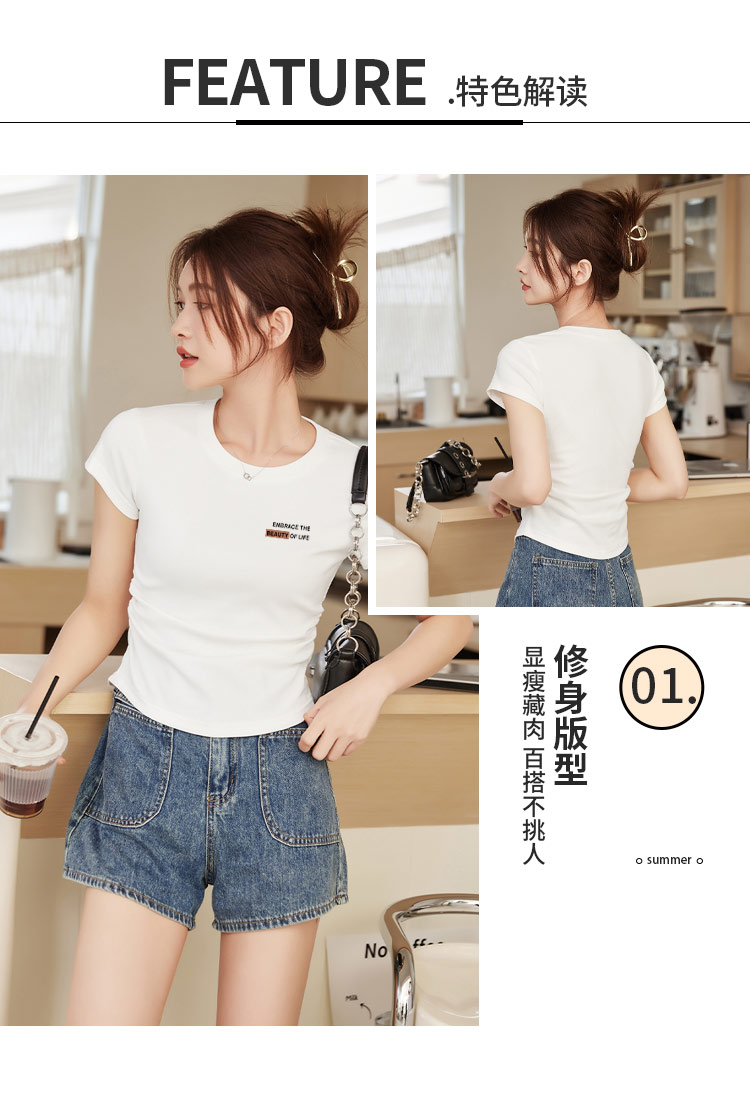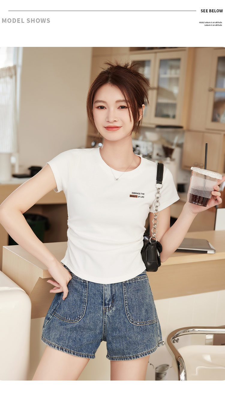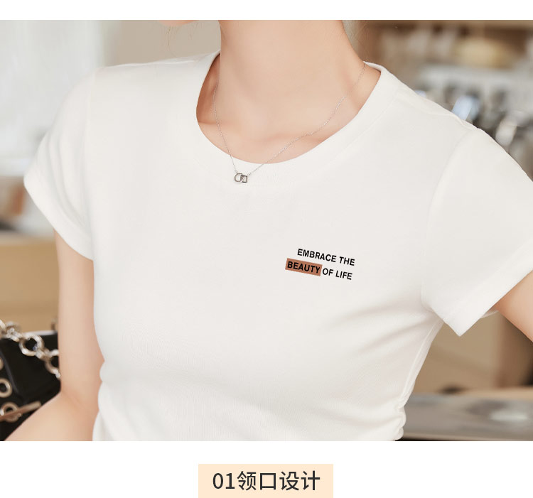 商品名称:米子旗夏季圆领印花女式T恤侧边抽褶设计短款修身正肩短袖上衣 822362