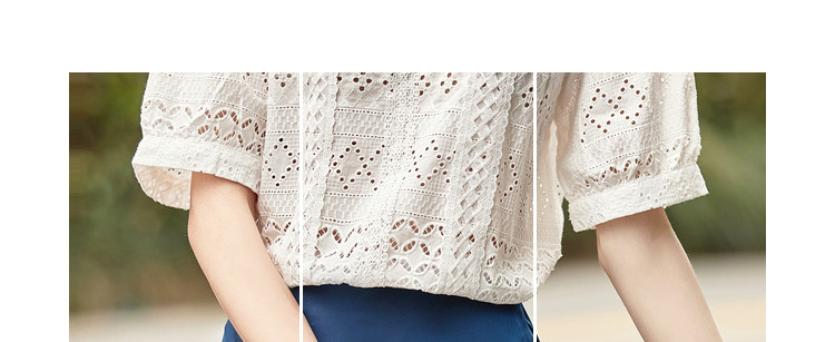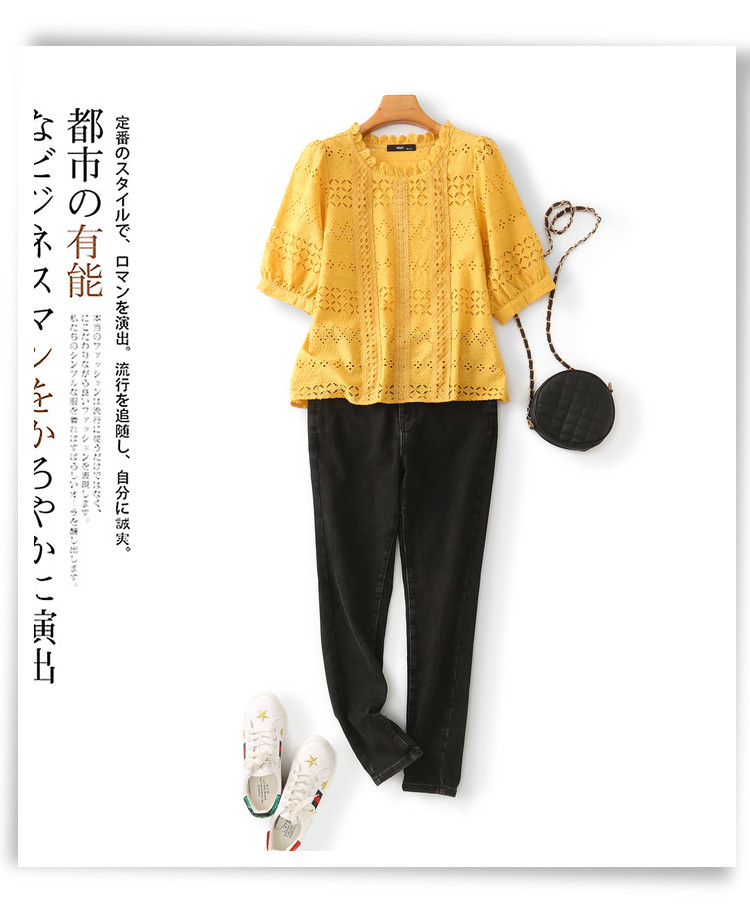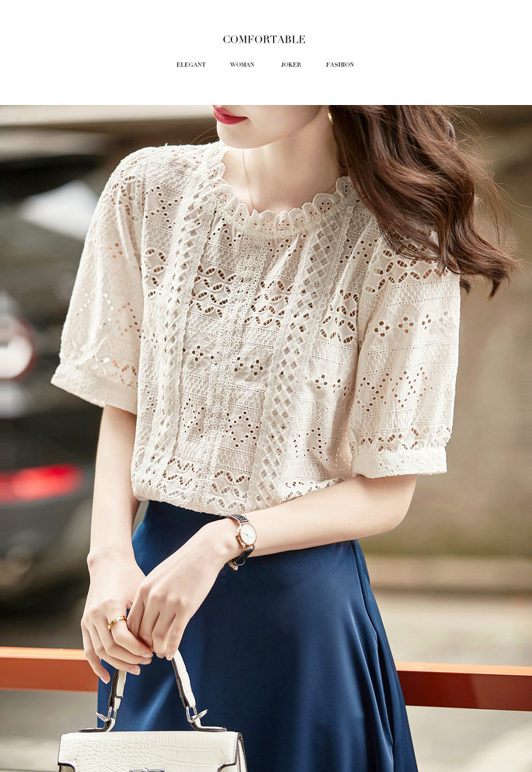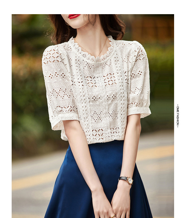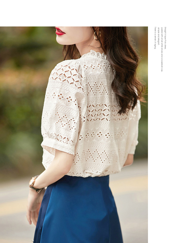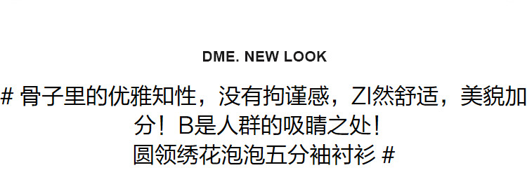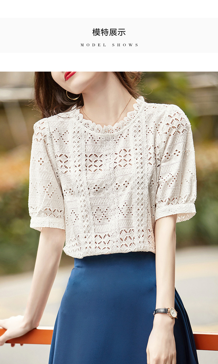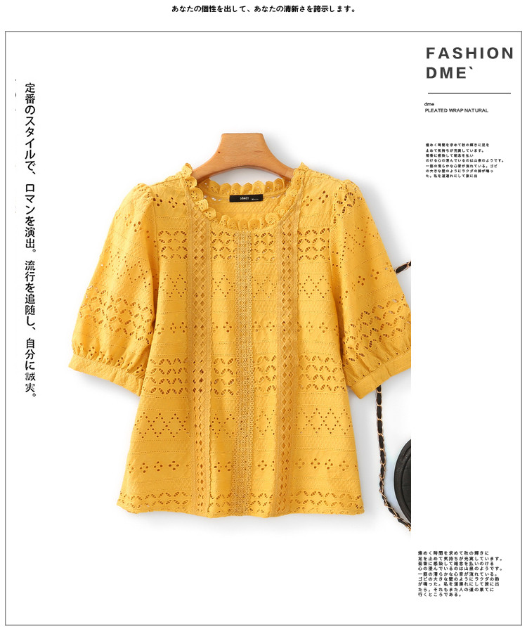 【棉布打孔绣花】夏圆领泡泡五分袖衬衣女式上衣 592641