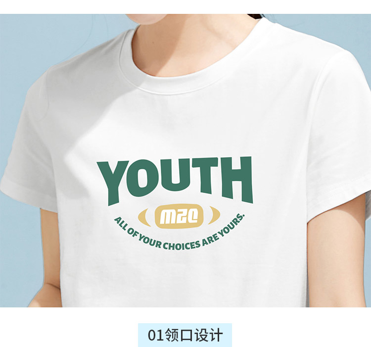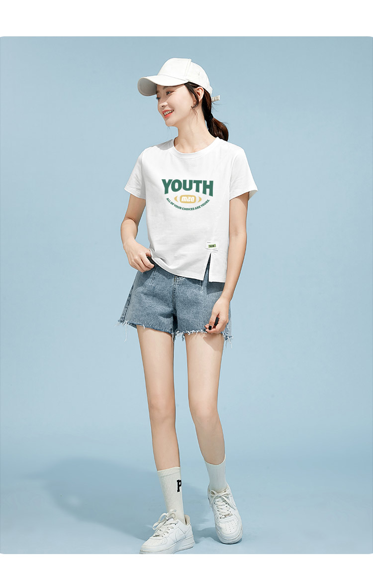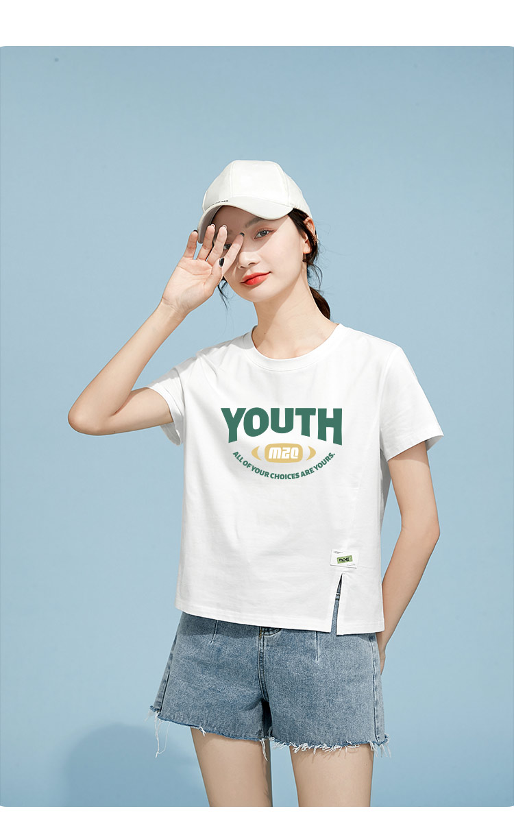 米子旗夏季圆领字母印花女式T恤下摆开叉设计宽松显瘦短袖上衣 073562