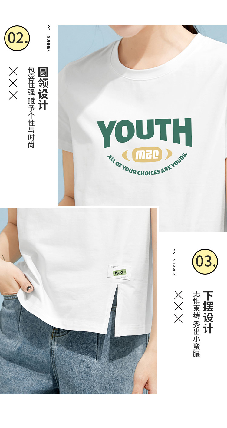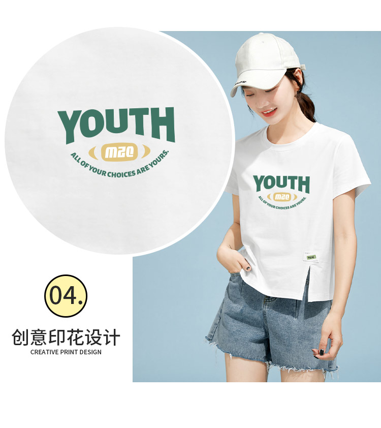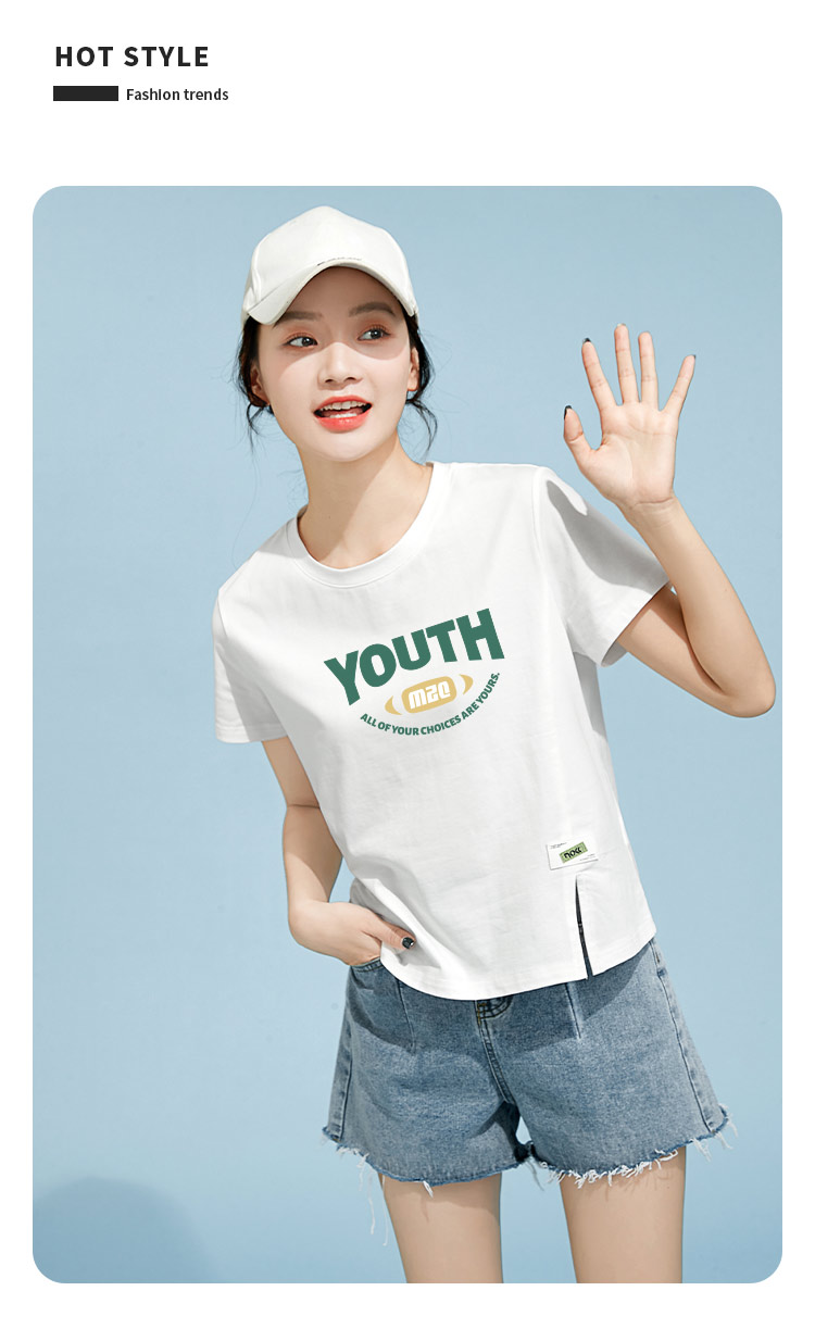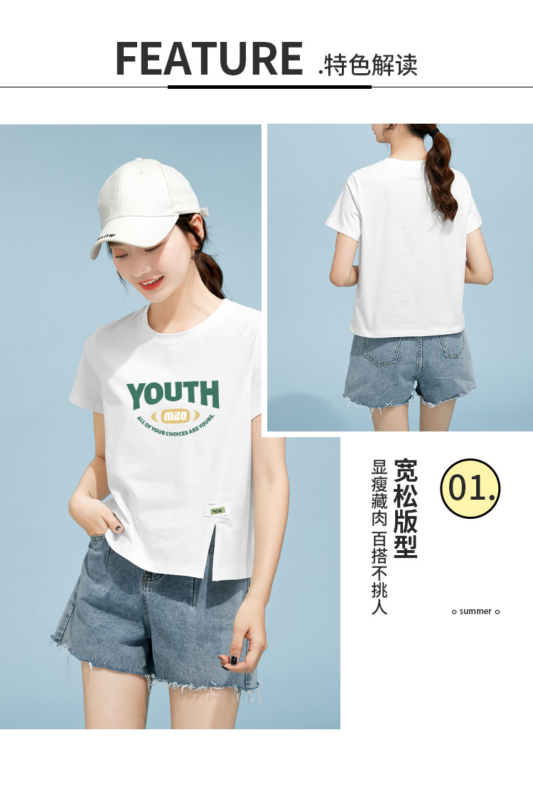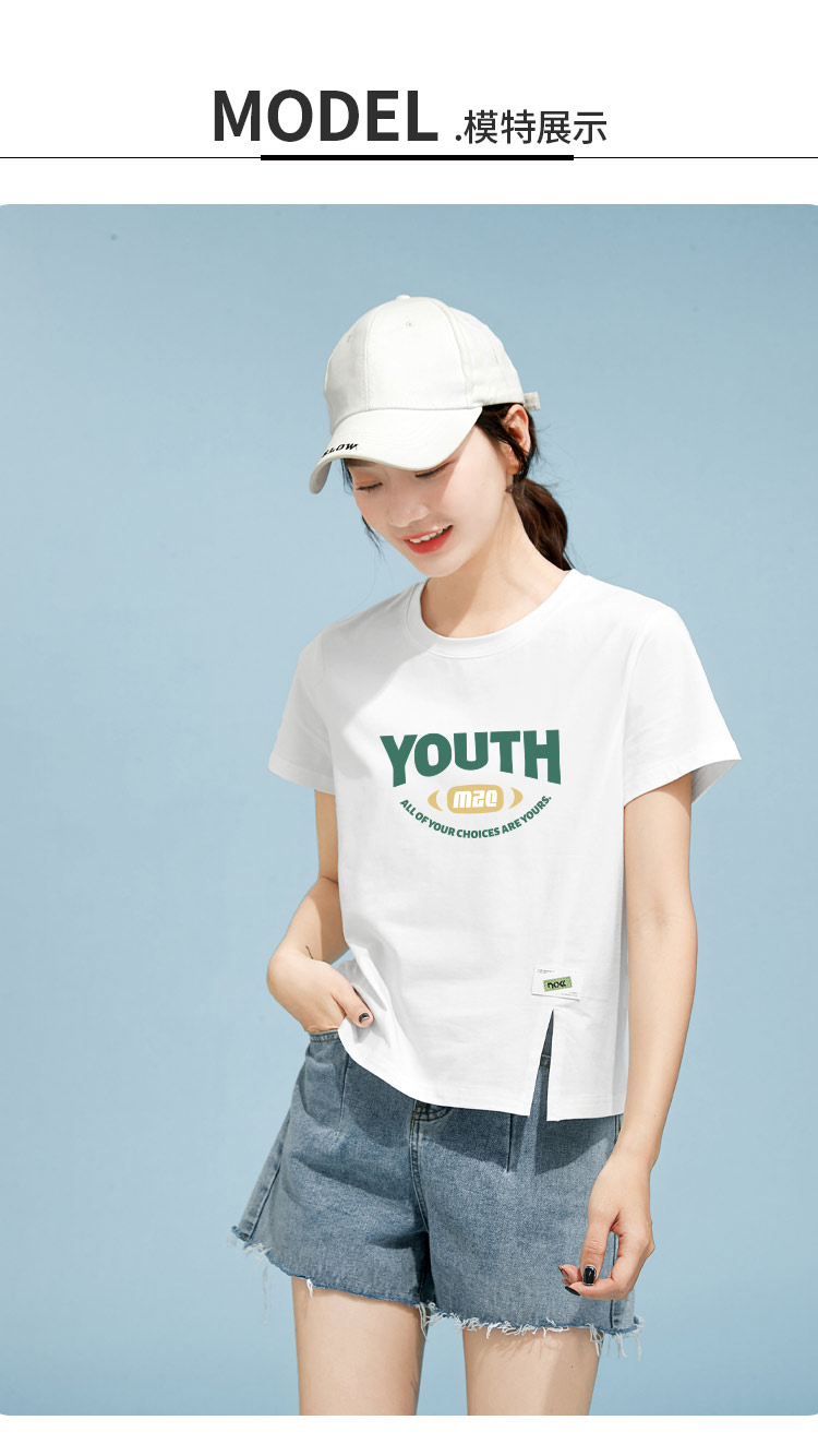 商品名称:米子旗夏季圆领字母印花女式T恤下摆开叉设计宽松显瘦短袖上衣 073562