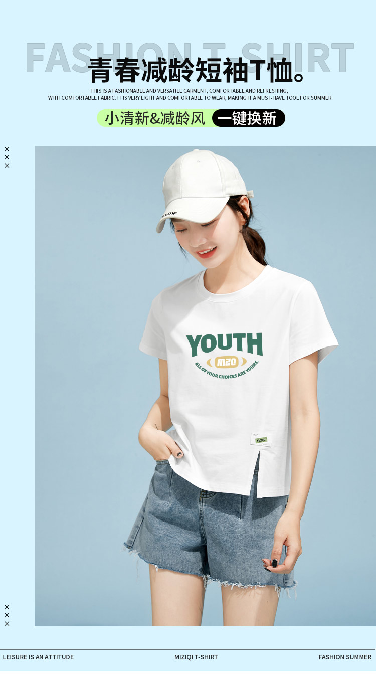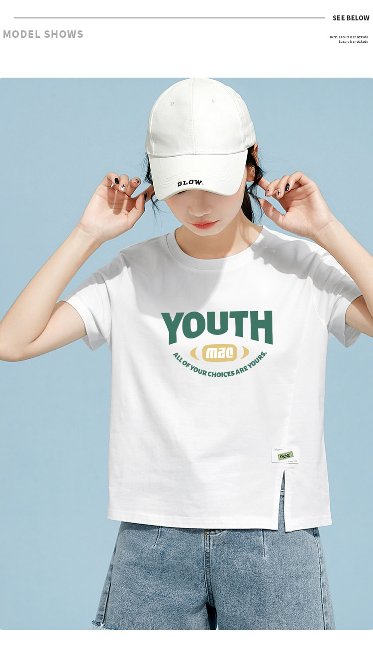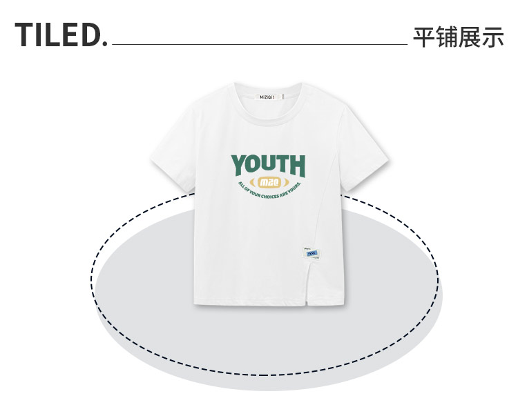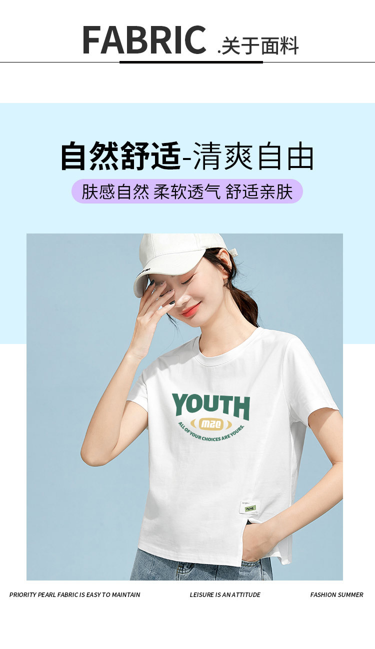 商品名称:米子旗夏季圆领字母印花女式T恤下摆开叉设计宽松显瘦短袖上衣 073562