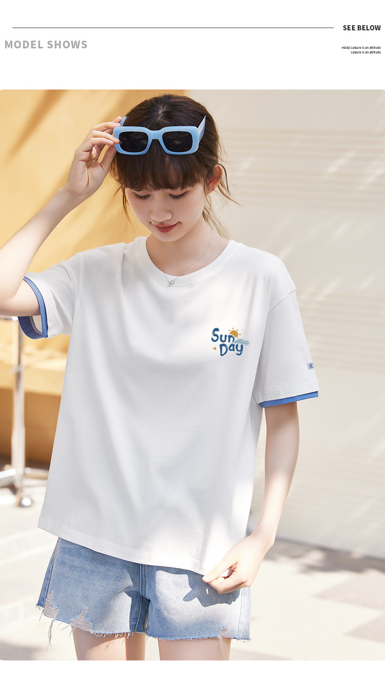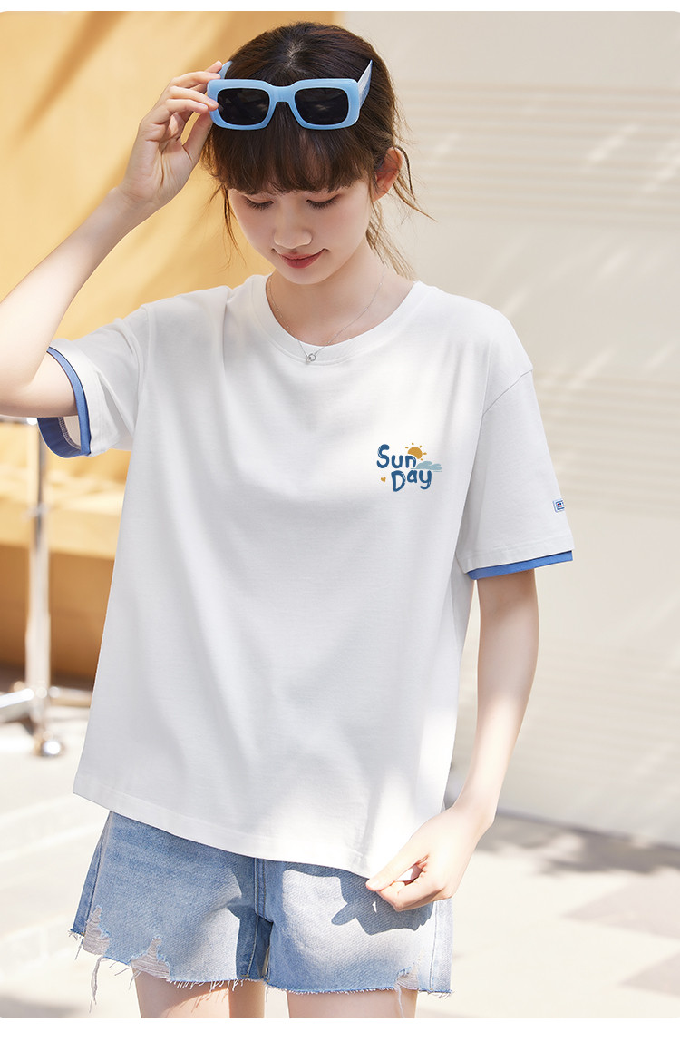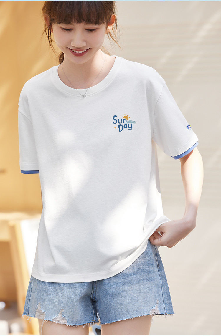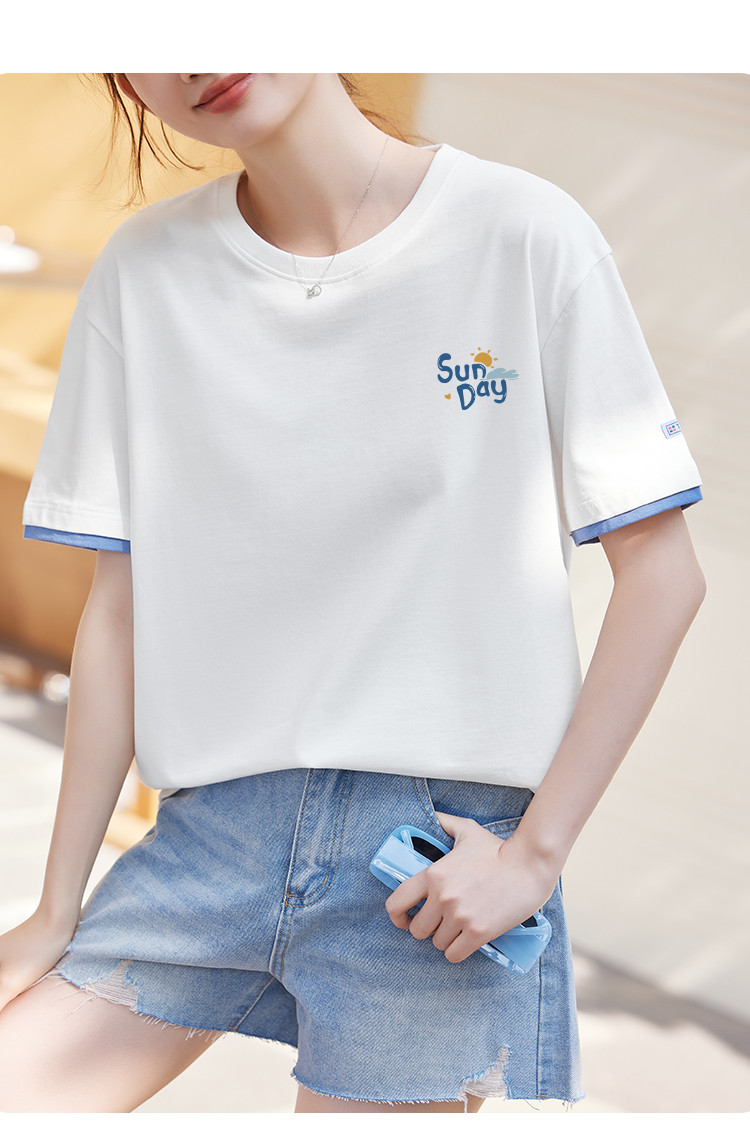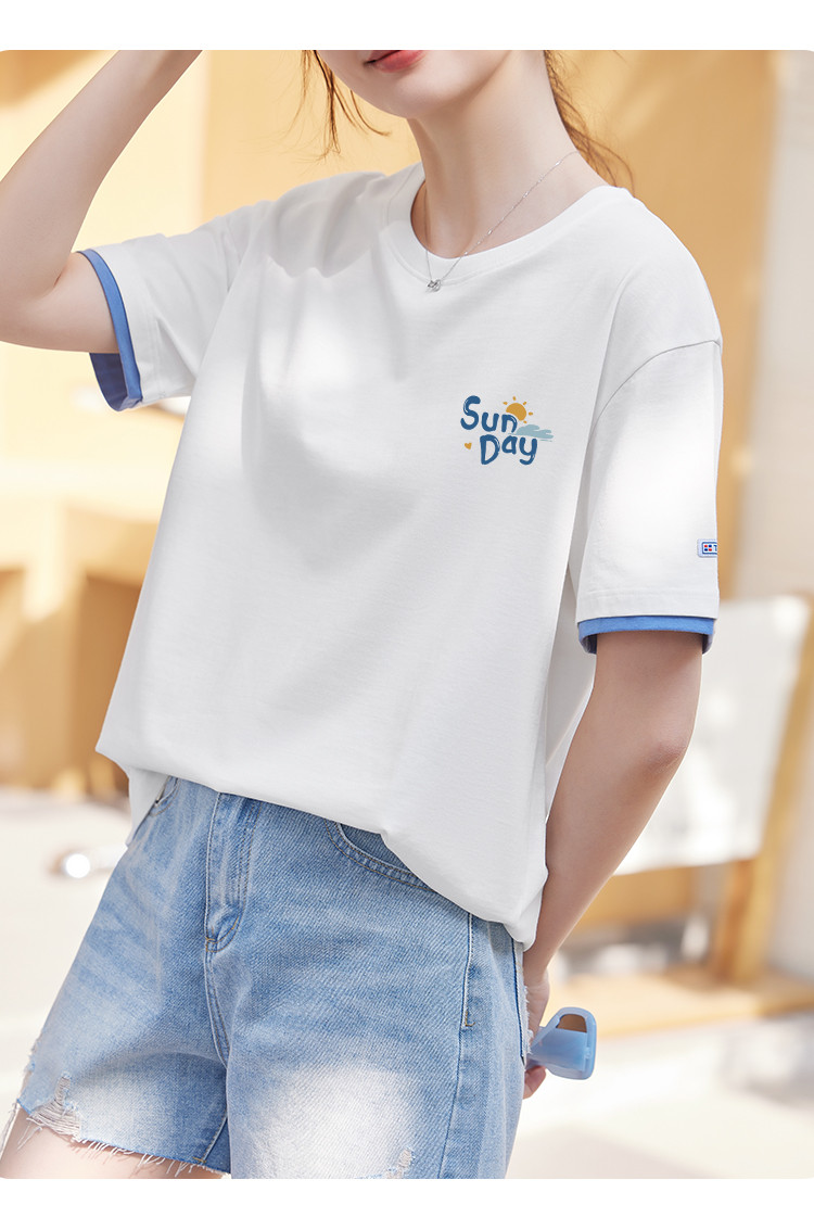 商品名称:米子旗夏季圆领袖口撞色设计T恤女创意印花宽松休闲短袖上衣 967642