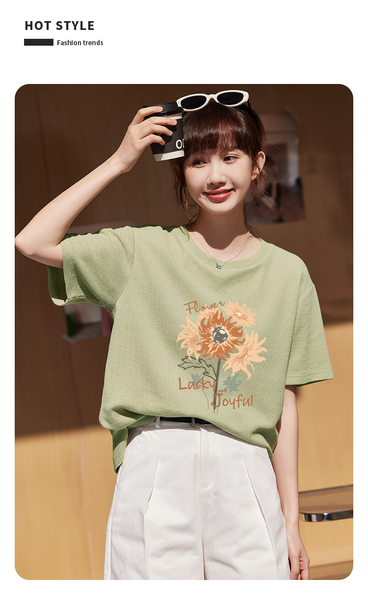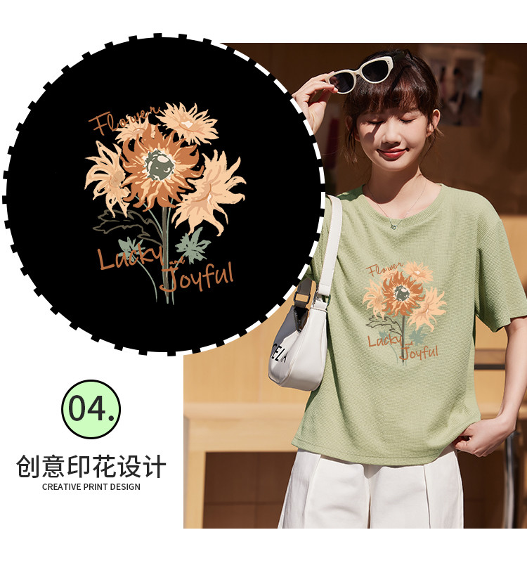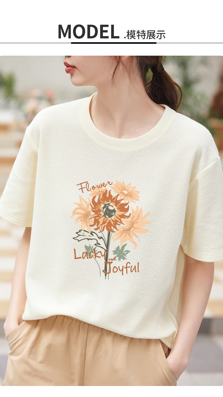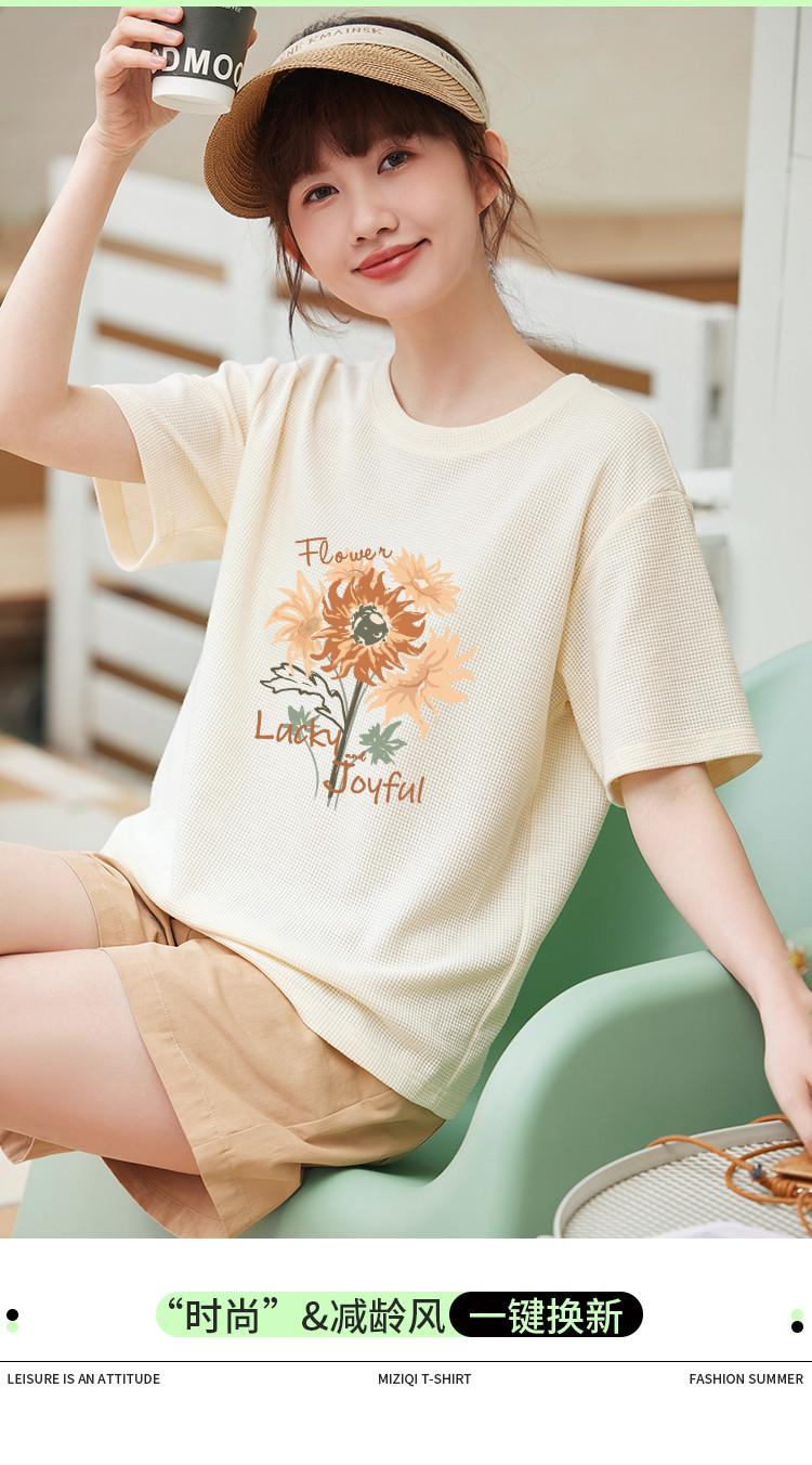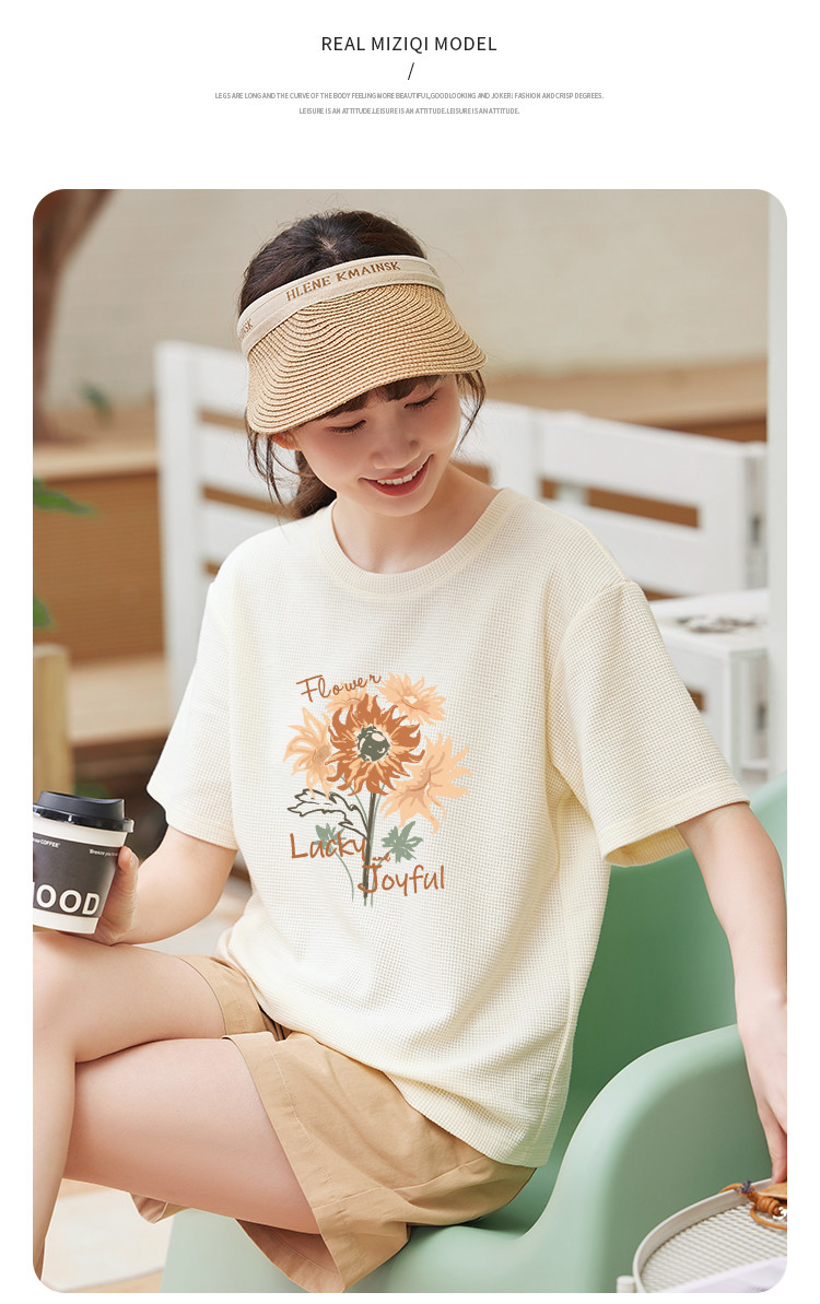 商品名称:米子旗夏装款向日葵印花T恤女宽松休闲华夫格短袖上衣 114010