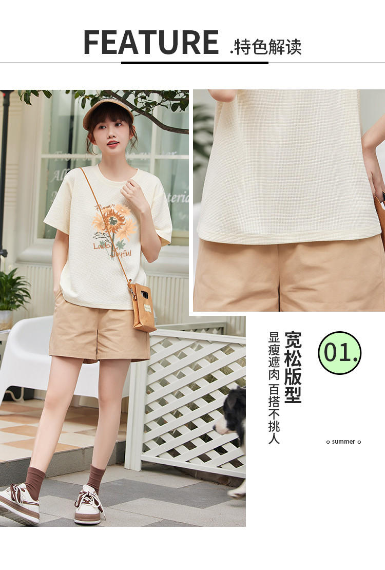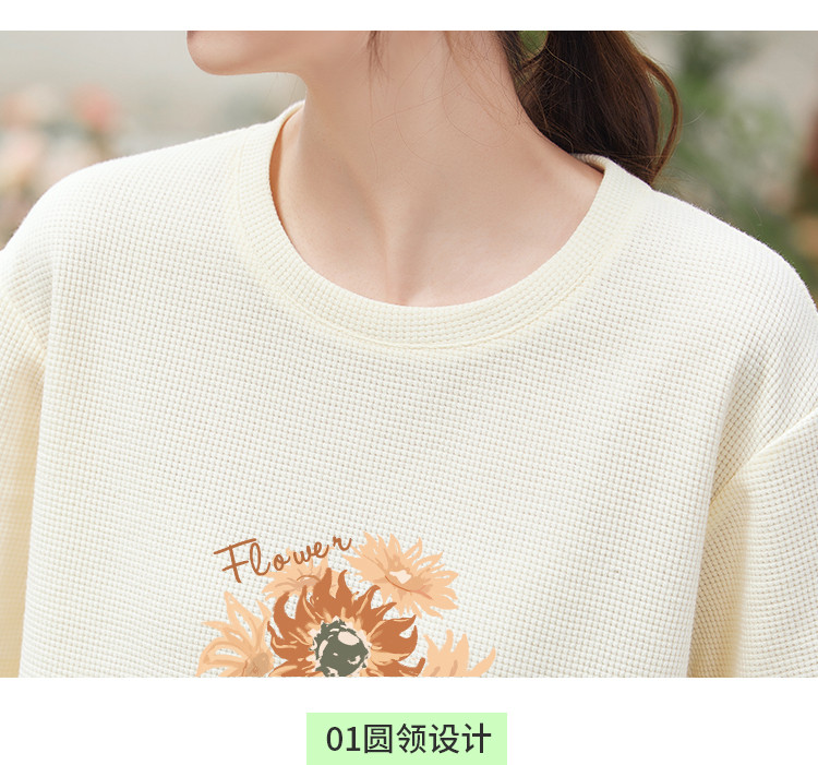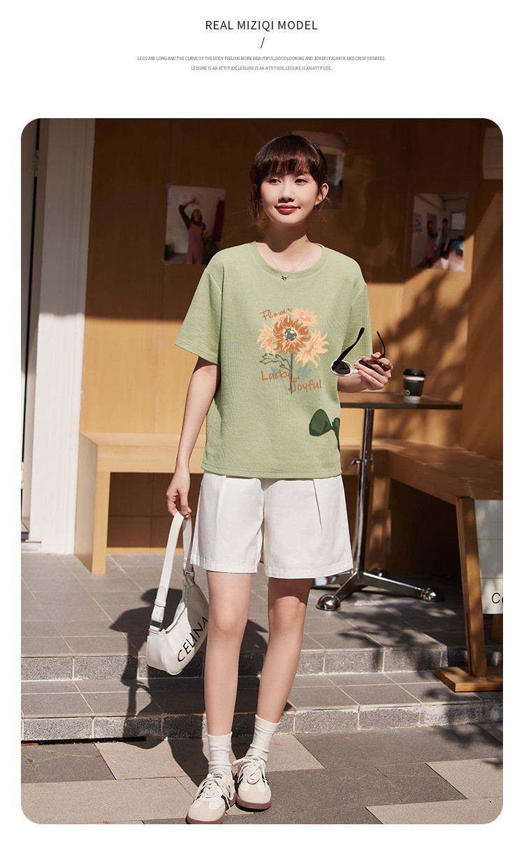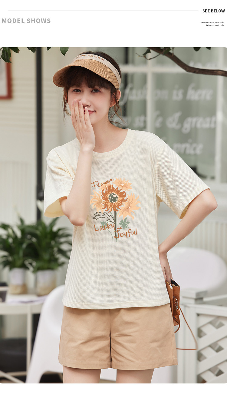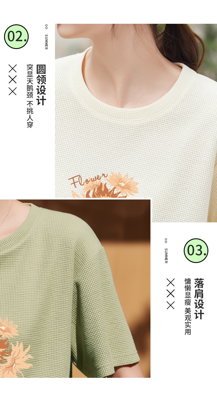 商品名称:米子旗夏装款向日葵印花T恤女宽松休闲华夫格短袖上衣 114010