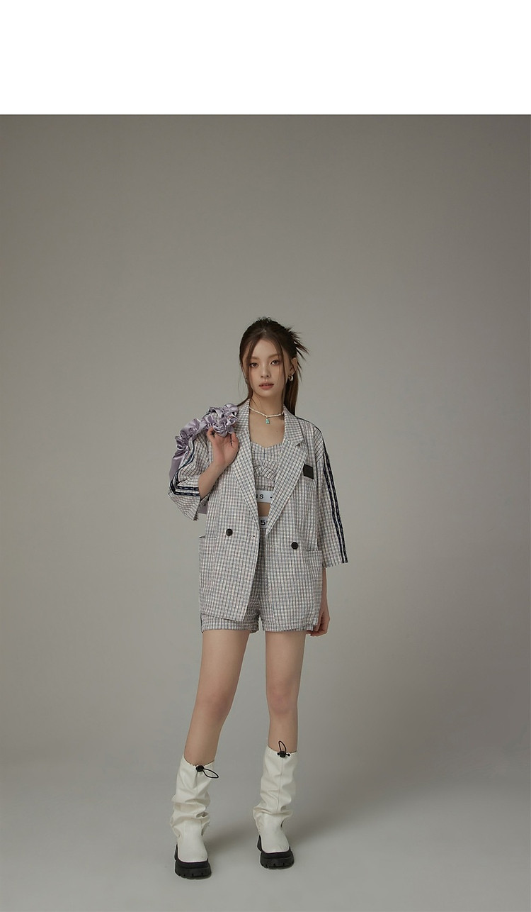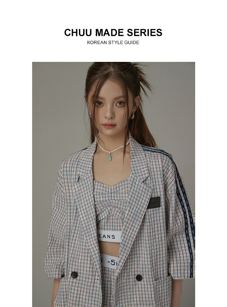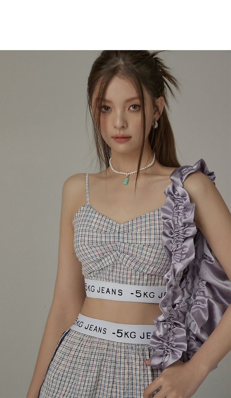 CHUU字母格子吊带女夏时尚拉链拼接短款无袖背心上衣 896595