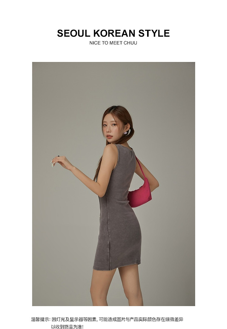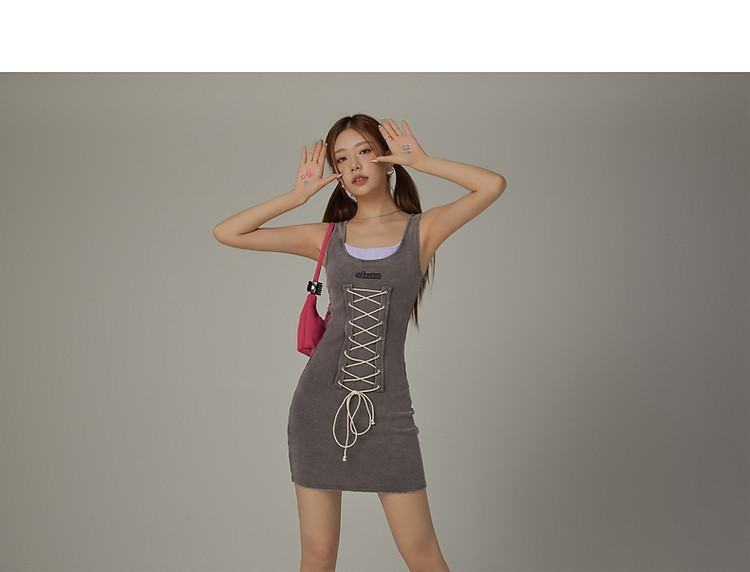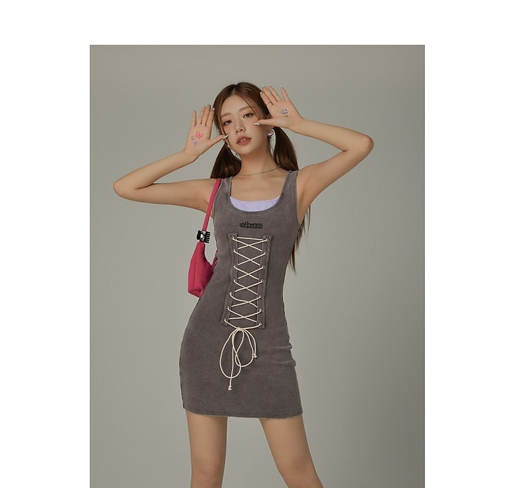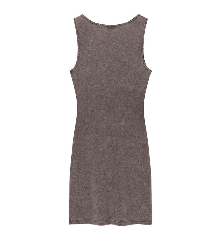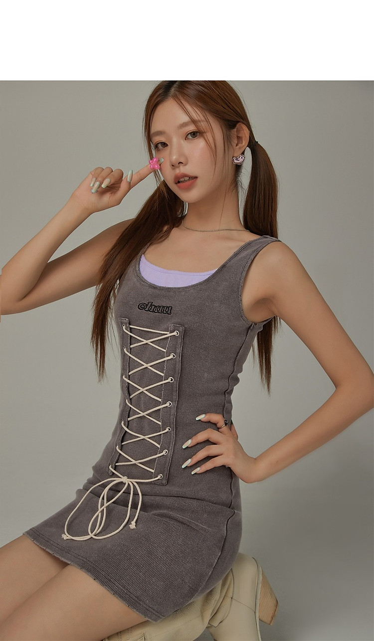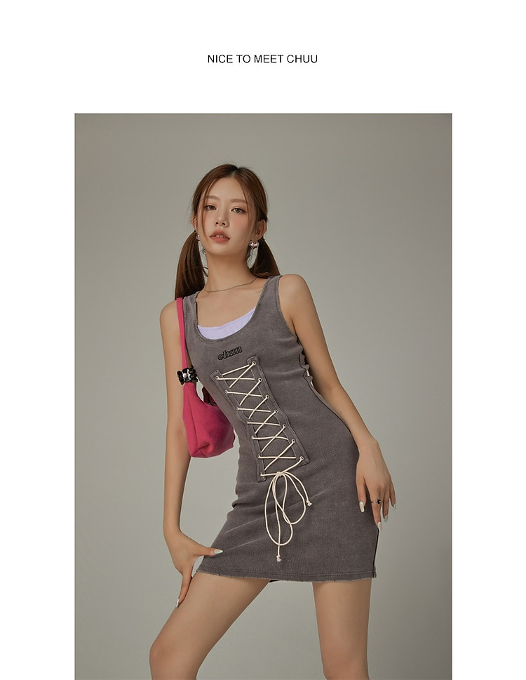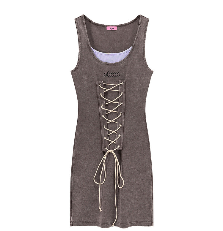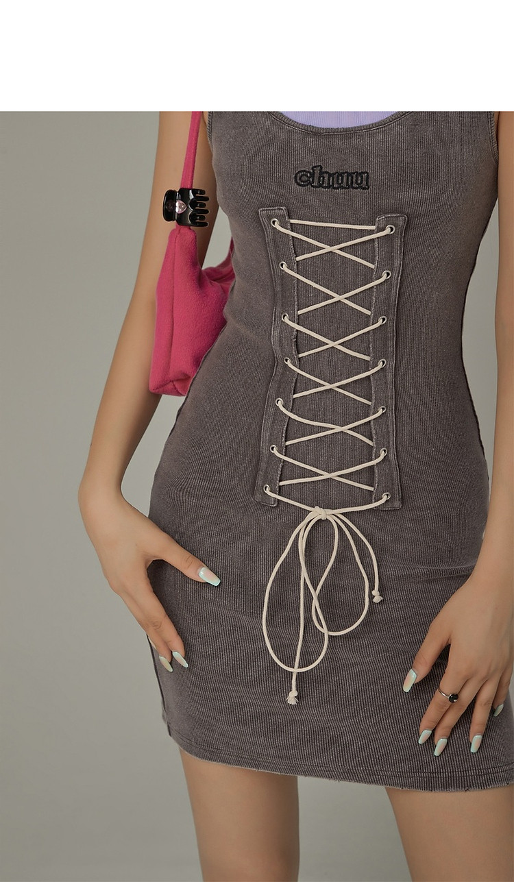 商品名称:拼接字母连衣裙女春秋磨破系带无袖背心裙时尚短裙 648083