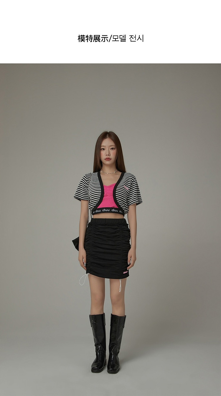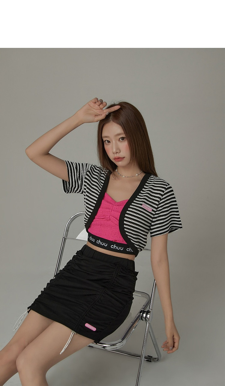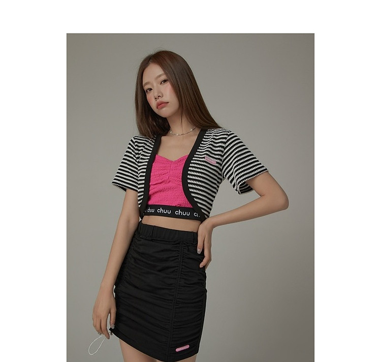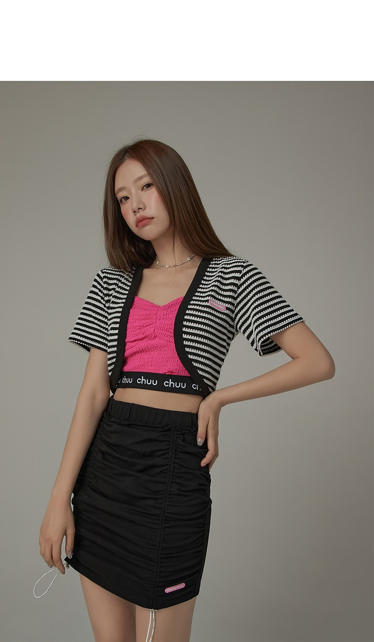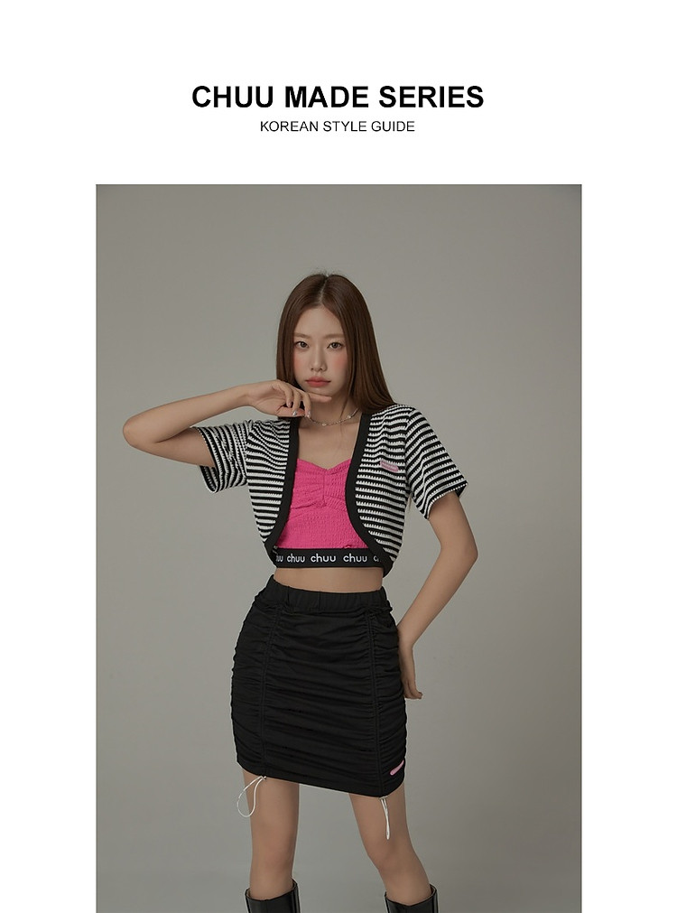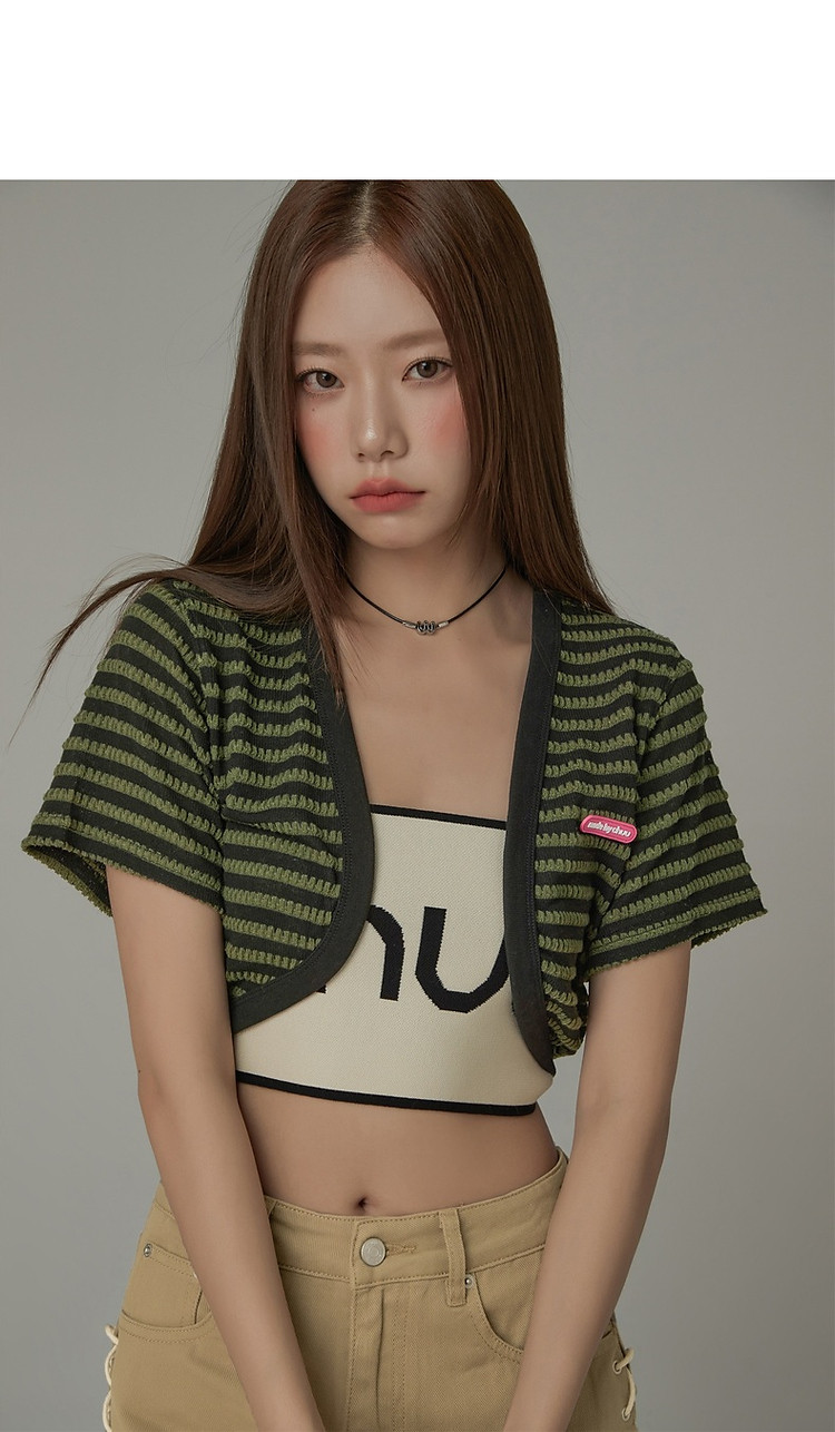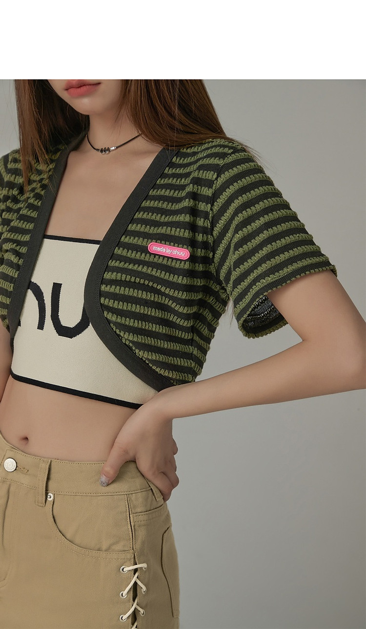CHUU条纹撞色短外套女士春夏贴标短袖开衫短外套 478483