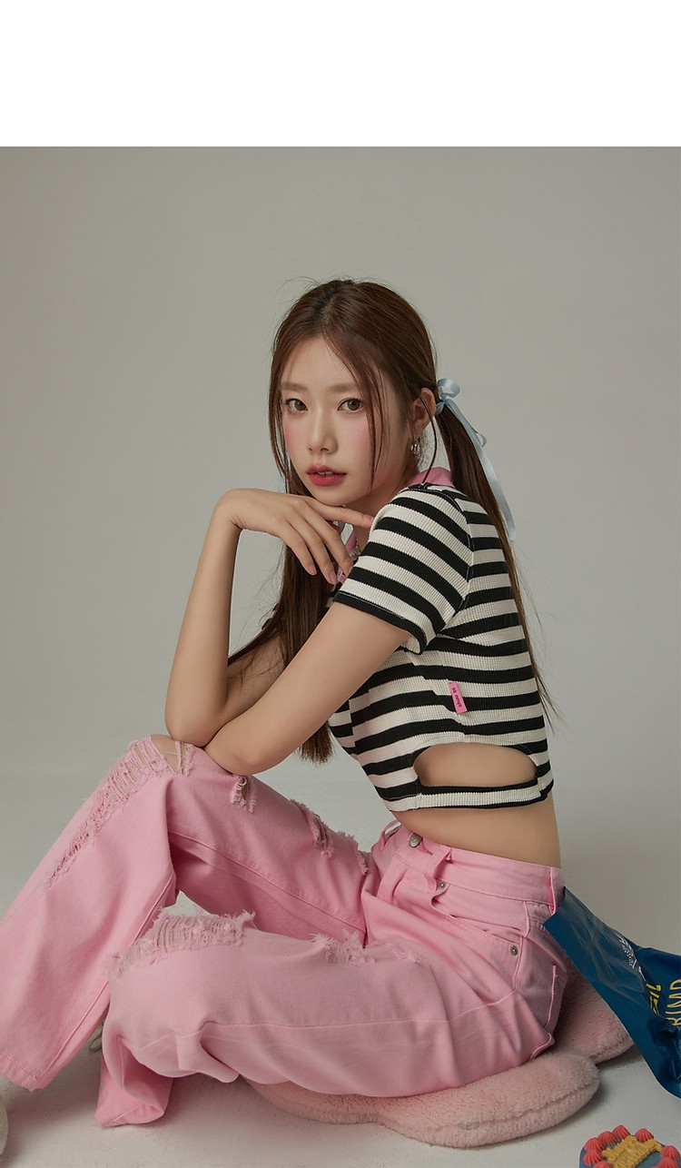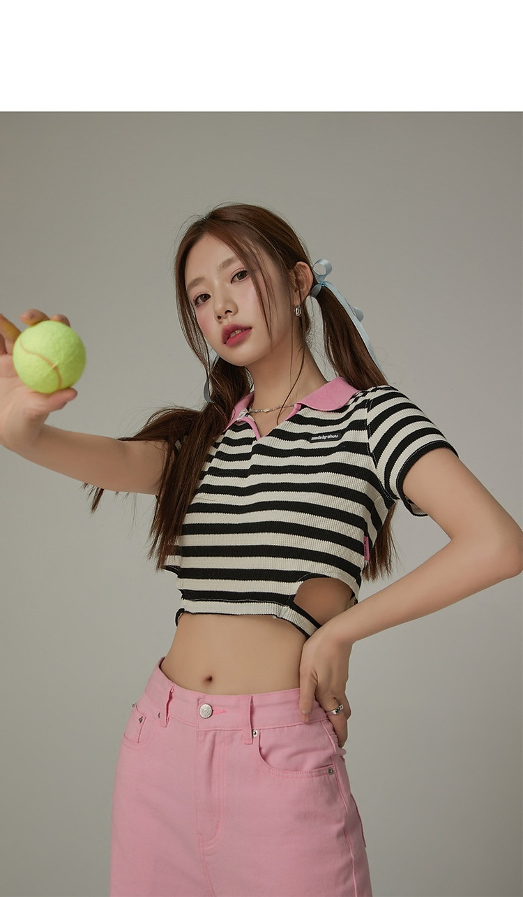 黑白条纹T恤女春夏小个子甜辣露脐镂空短袖上衣 859731