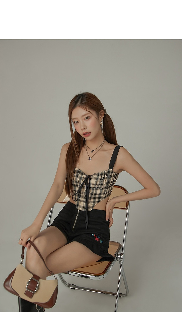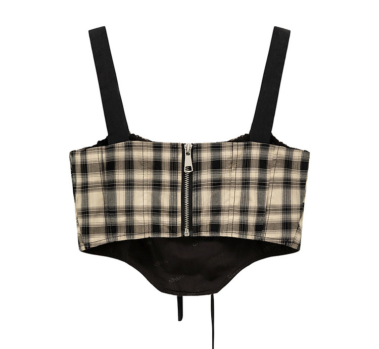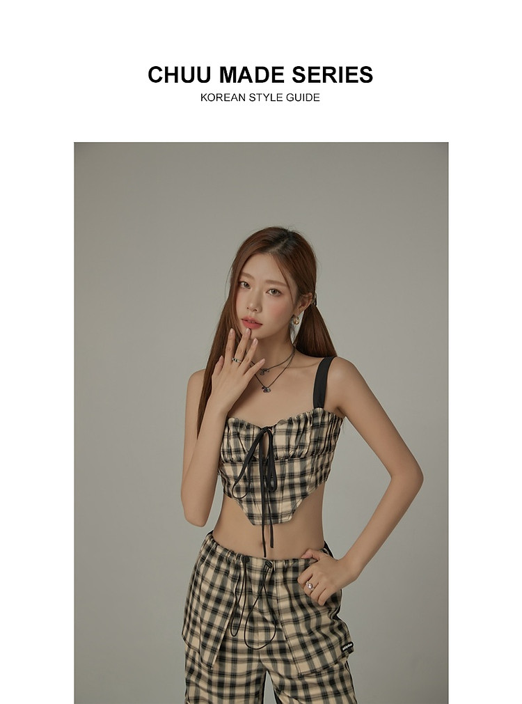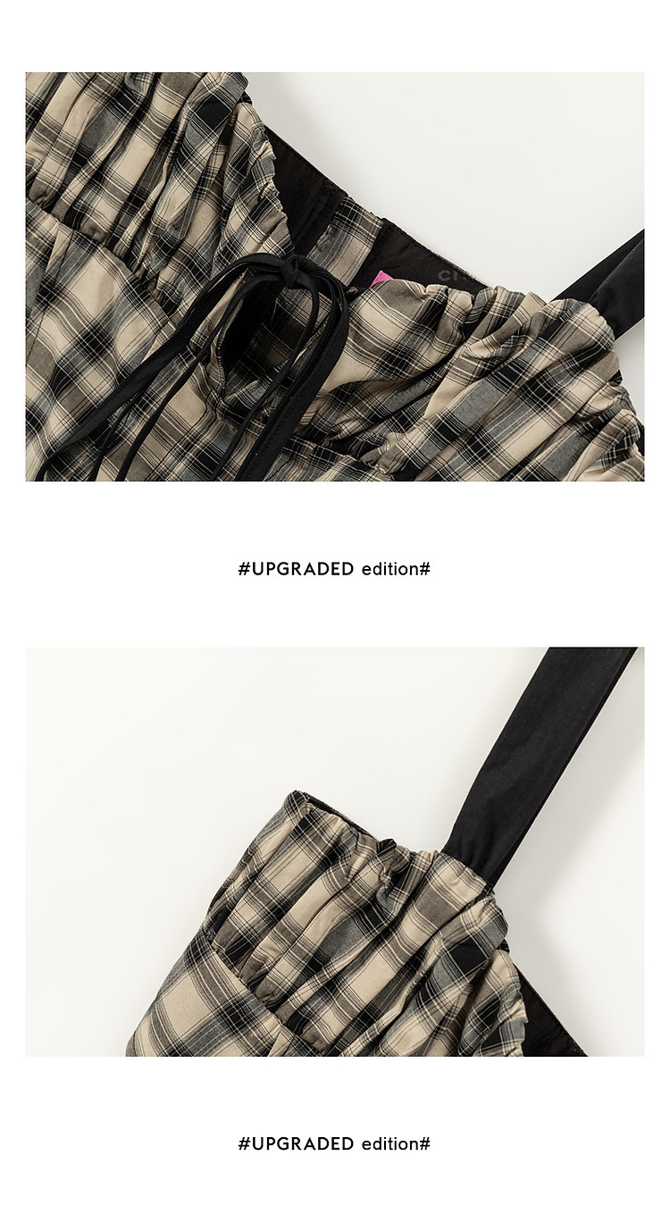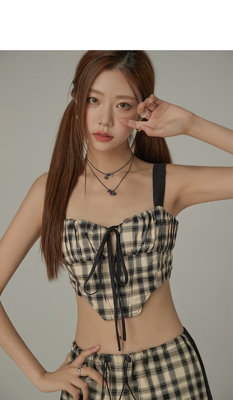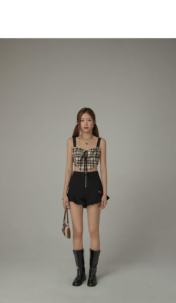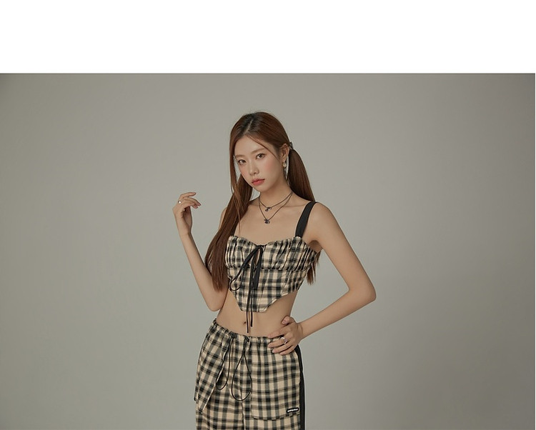 商品名称:格纹系带小背心女春夏甜辣抽褶小个子不规则爱心吊带 924947
