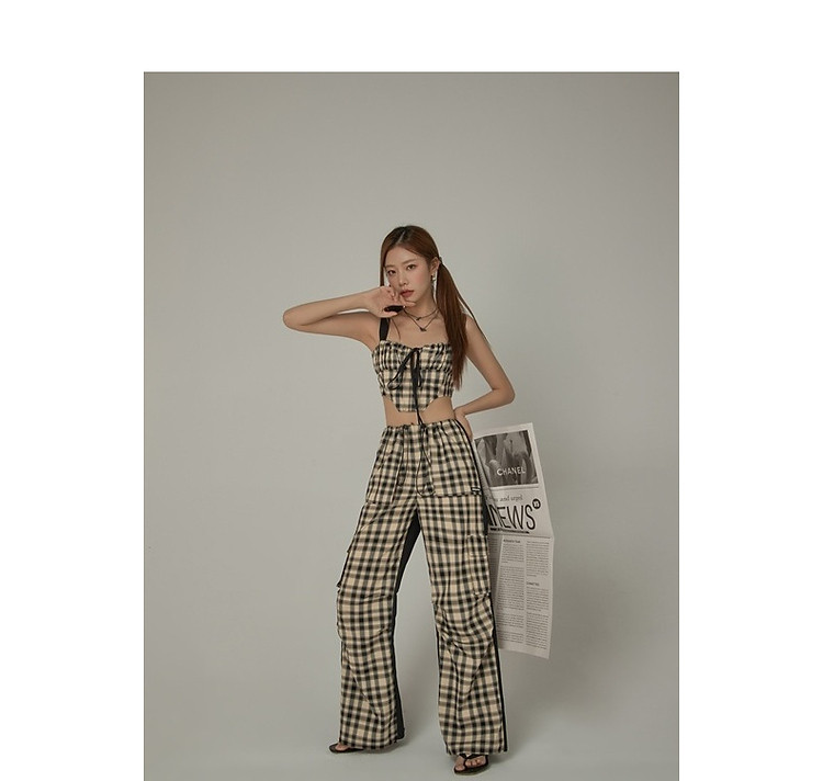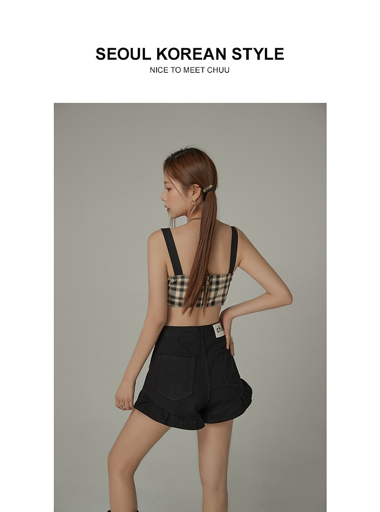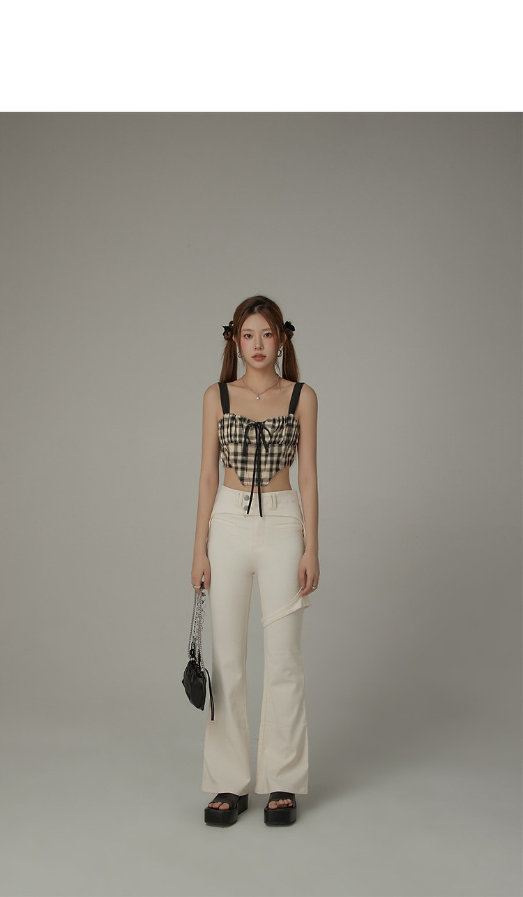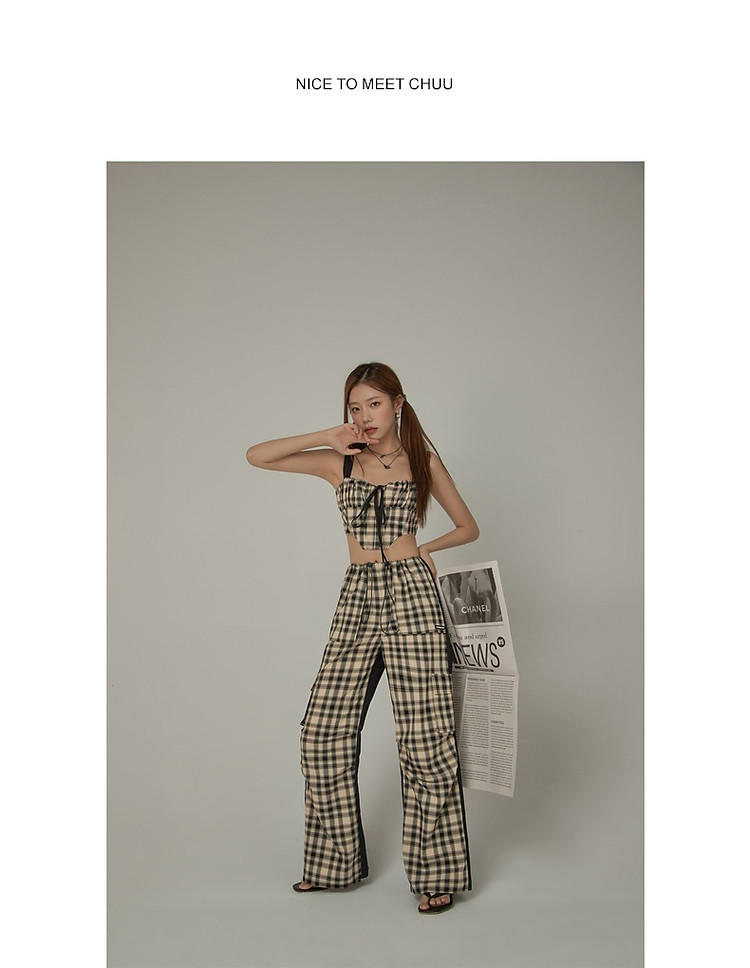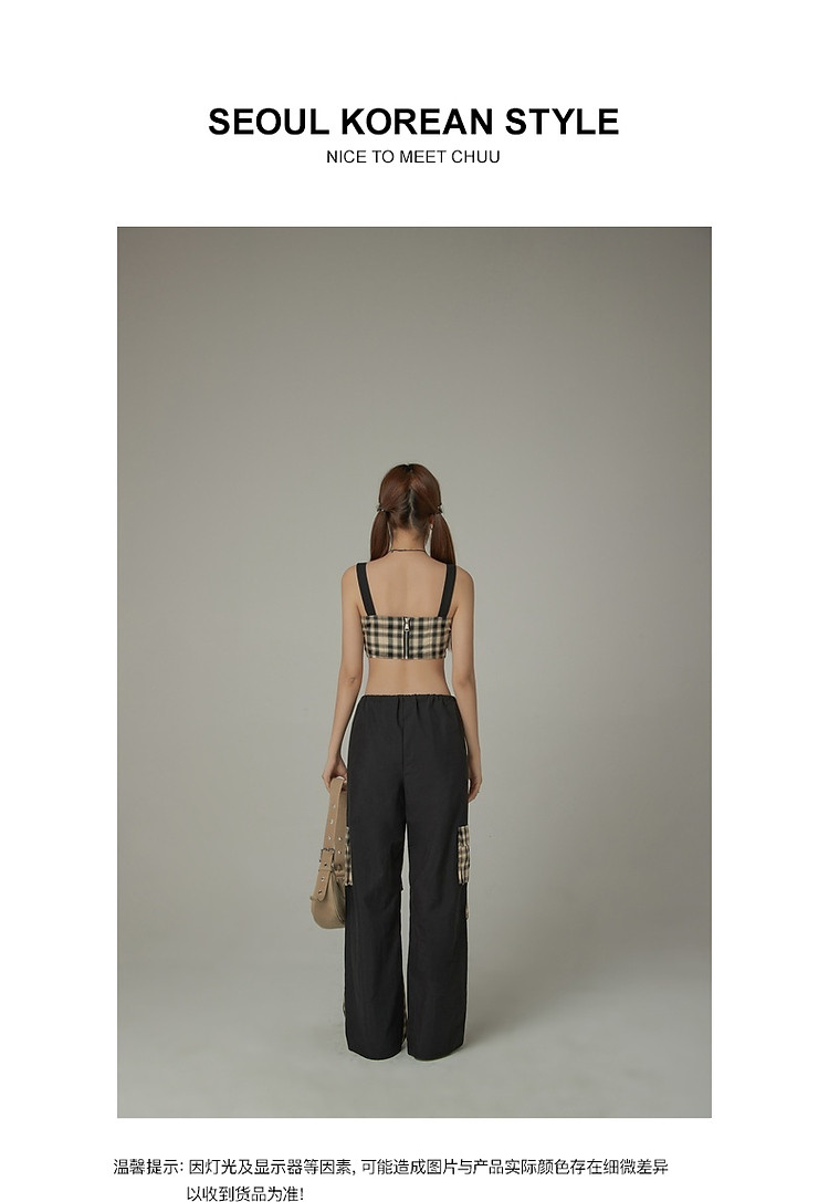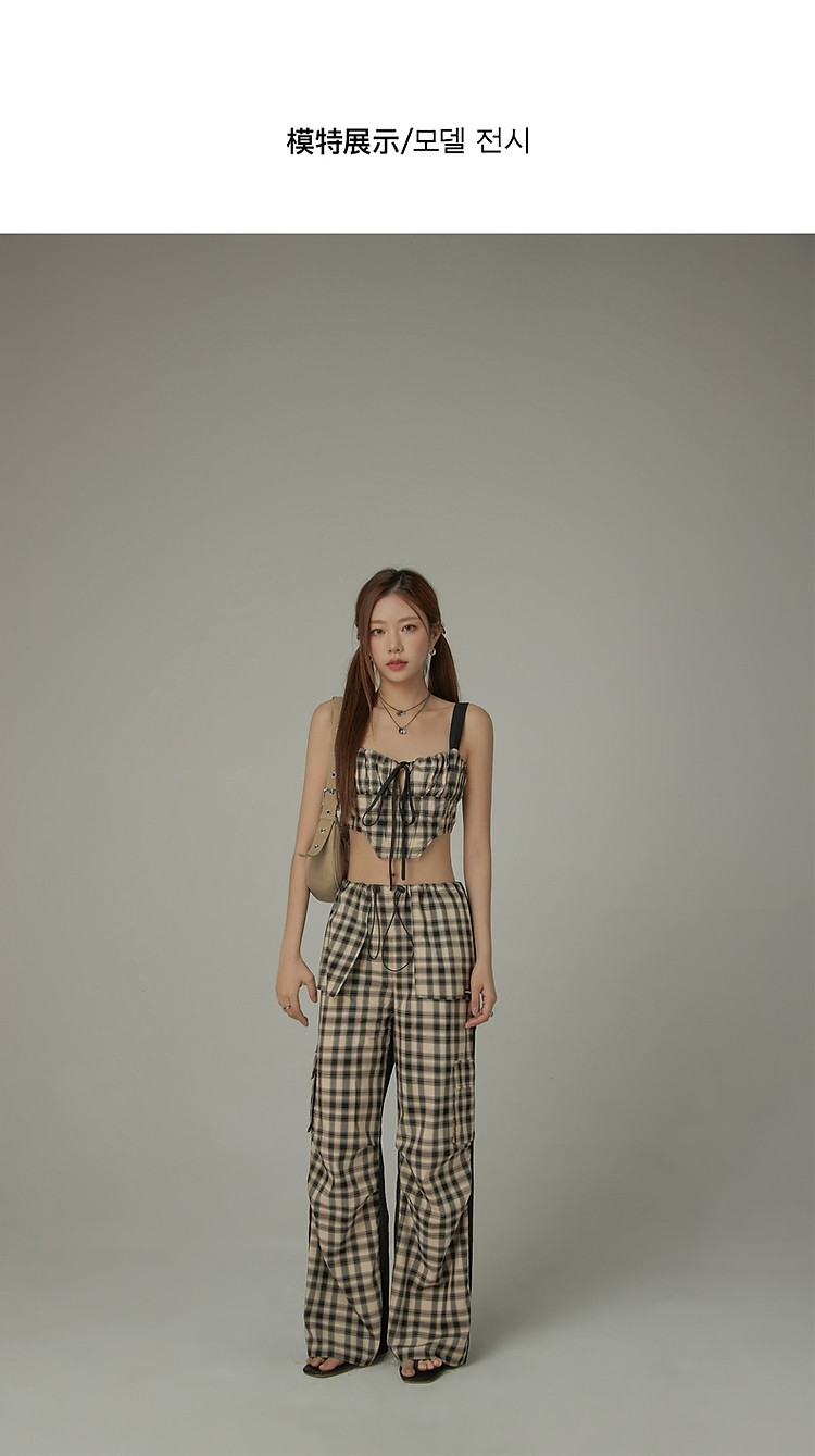 商品名称:格纹系带小背心女春夏甜辣抽褶小个子不规则爱心吊带 924947