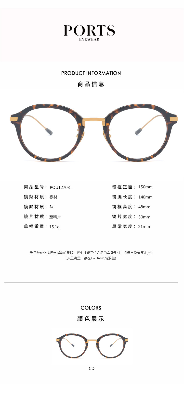 商品名称:PORTS女款日常复古休闲板材钛眼镜架POU12708 383818