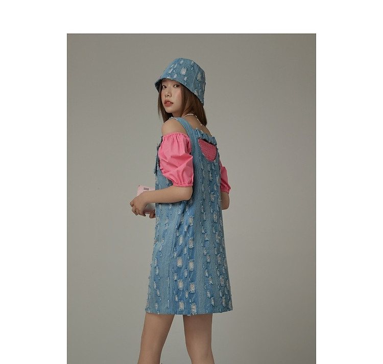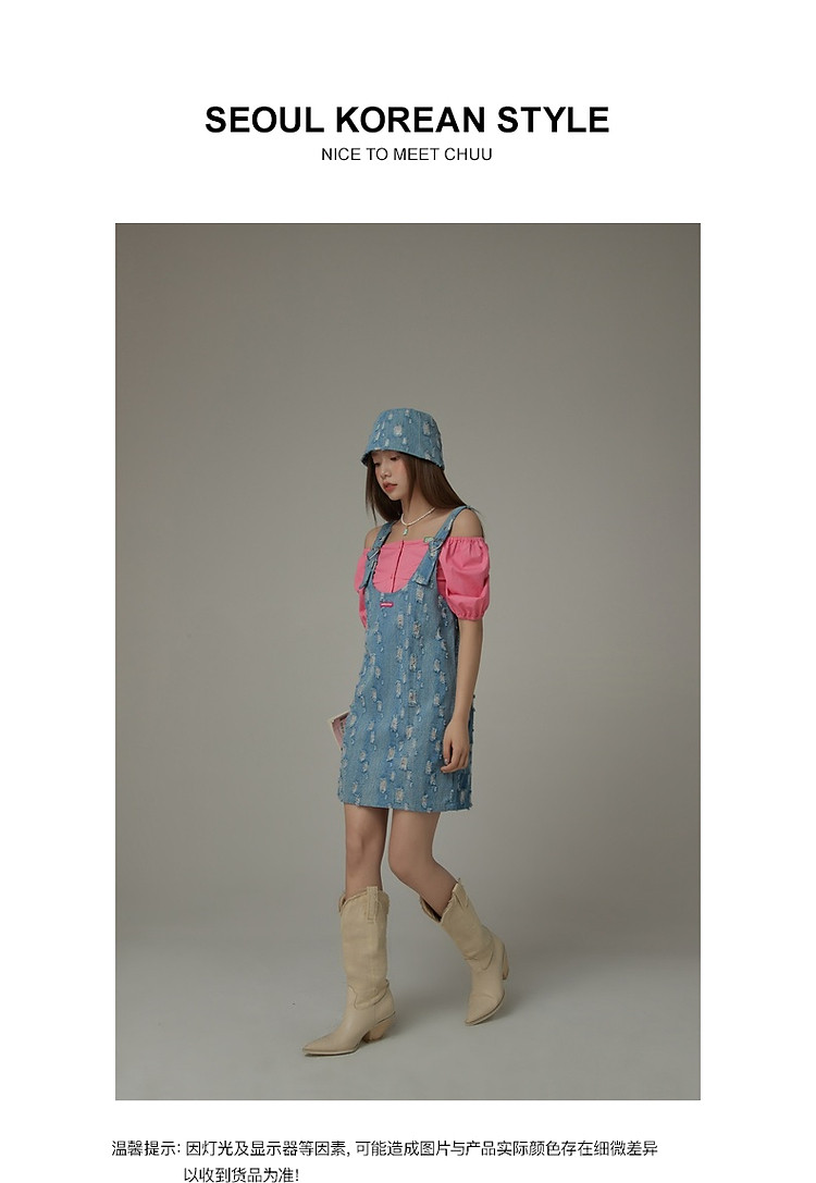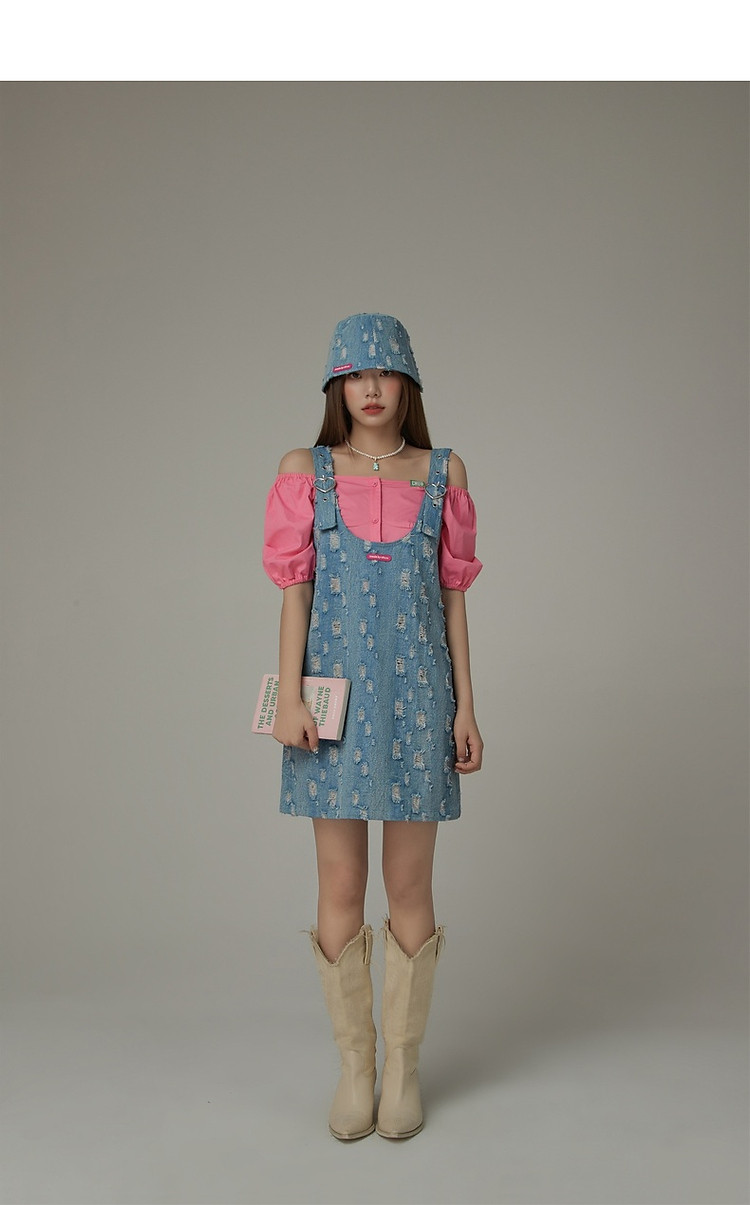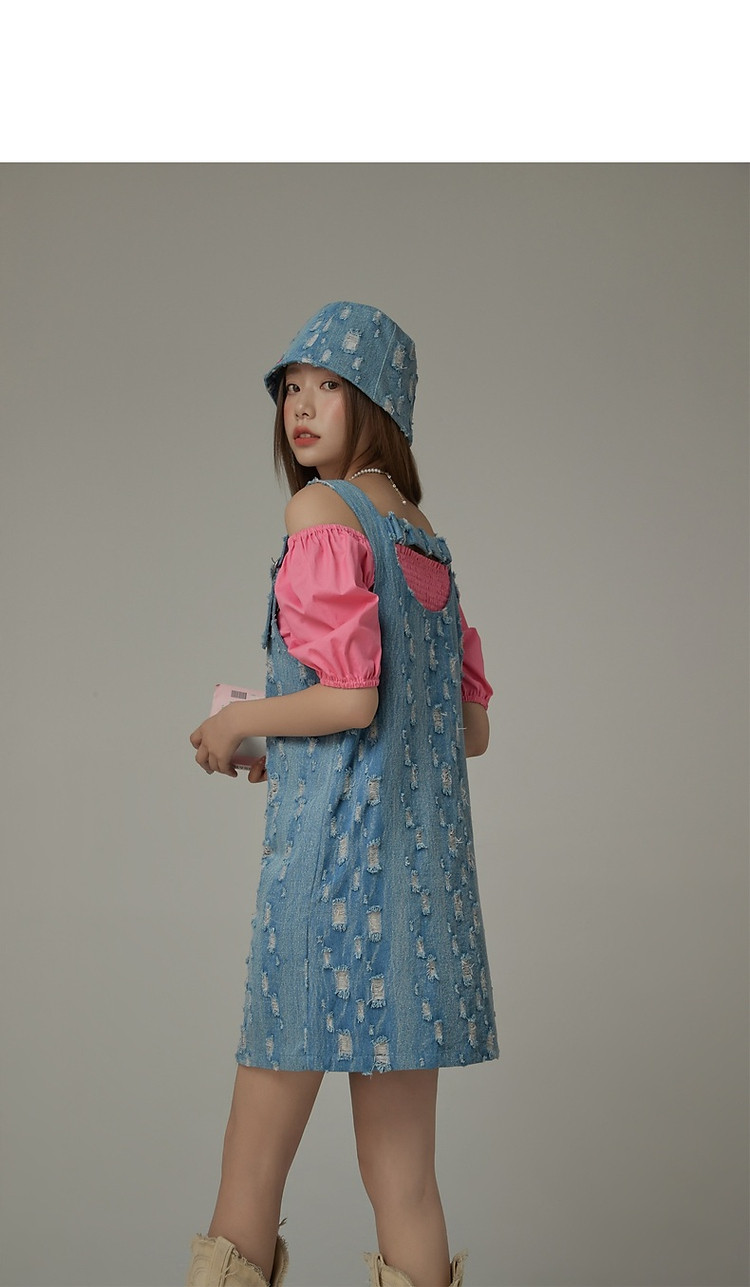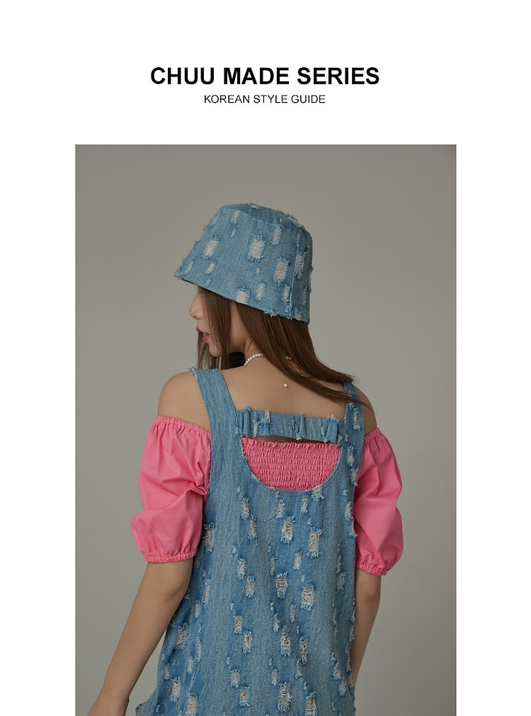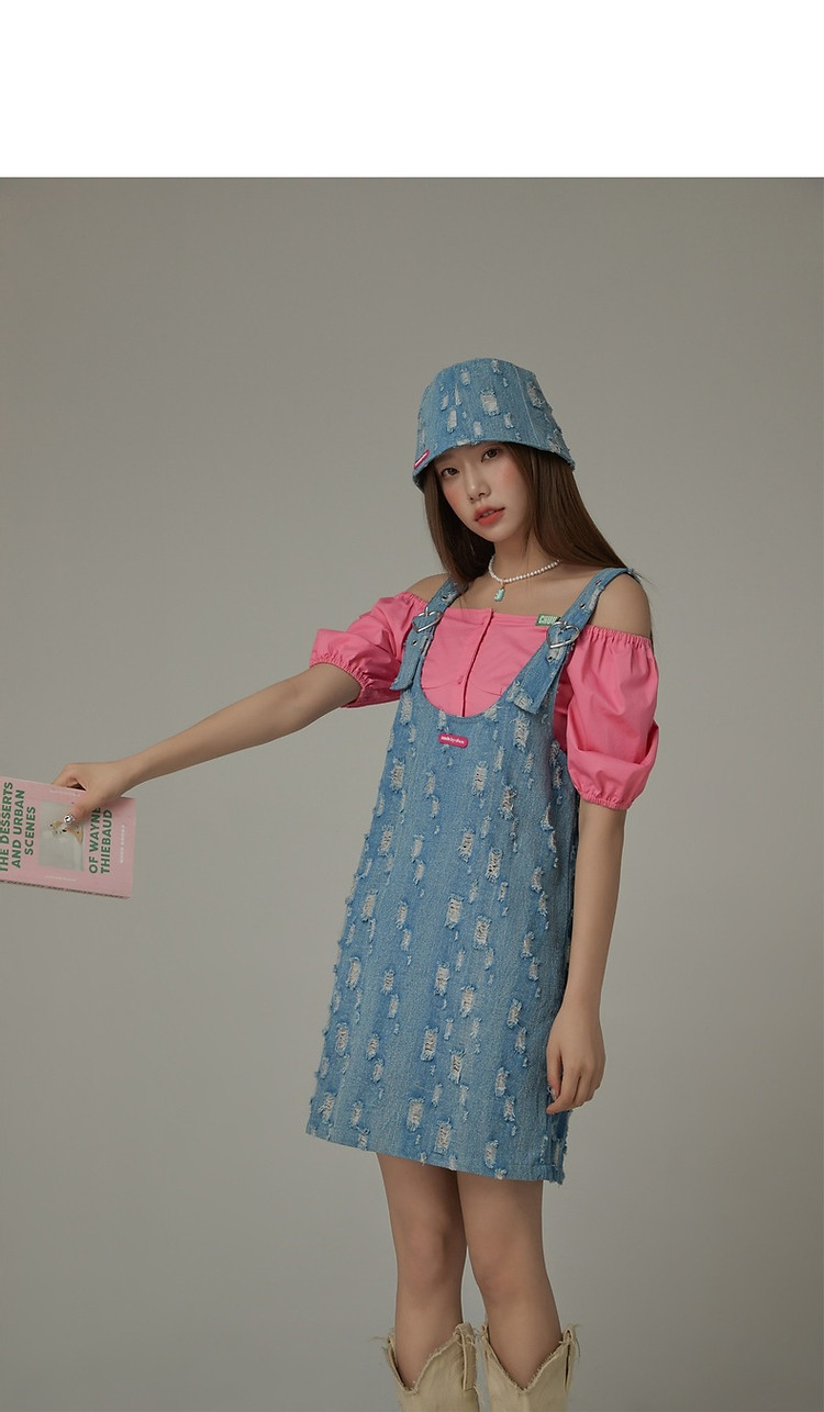 商品名称:宽松直筒连衣裙女夏设计感破洞牛仔背带裙短裙子 054099