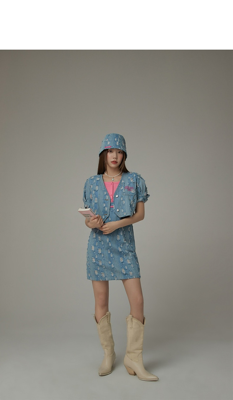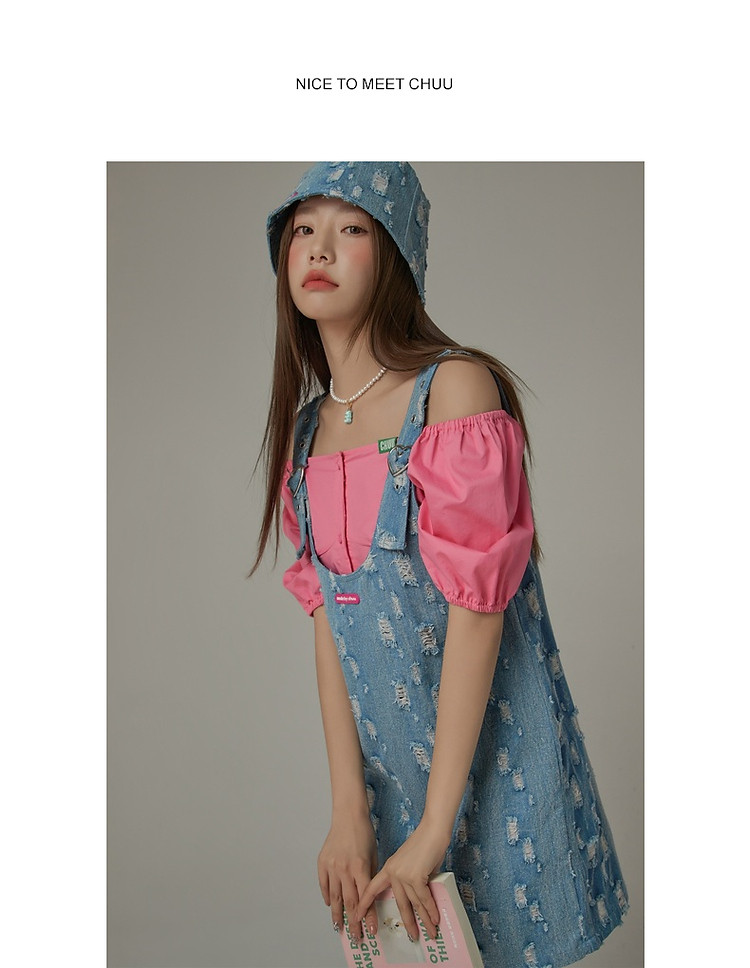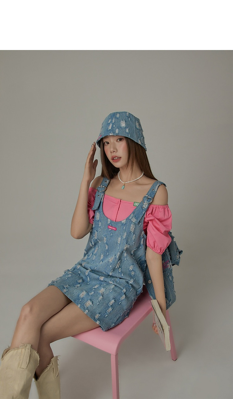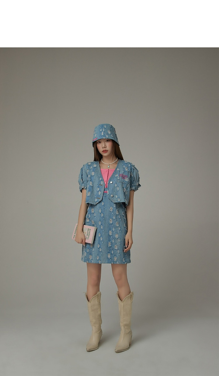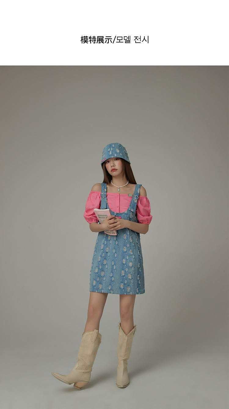 商品名称:宽松直筒连衣裙女夏设计感破洞牛仔背带裙短裙子 054099