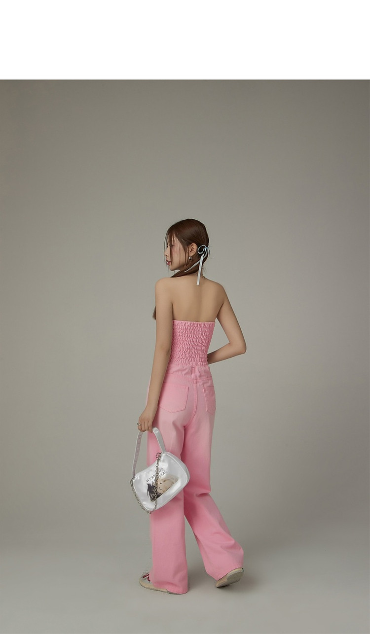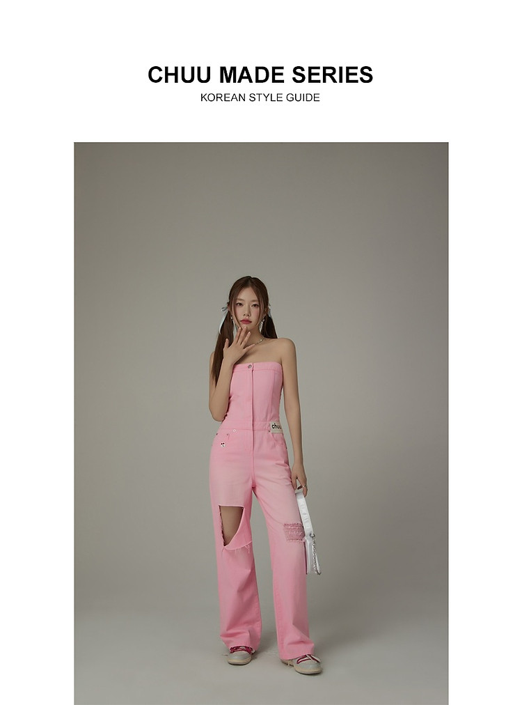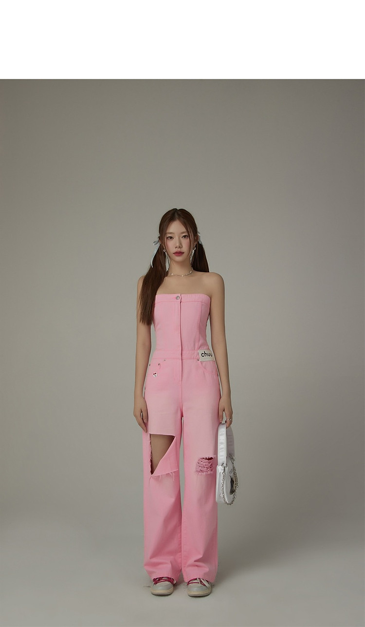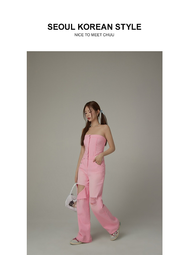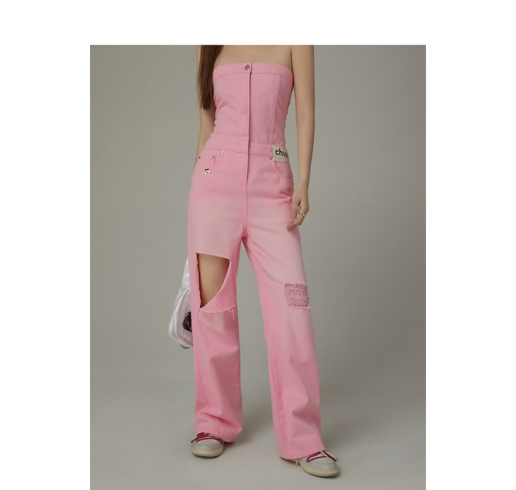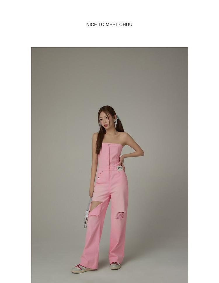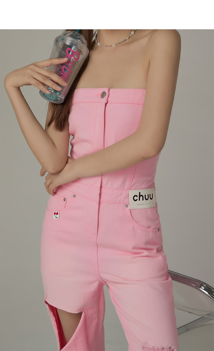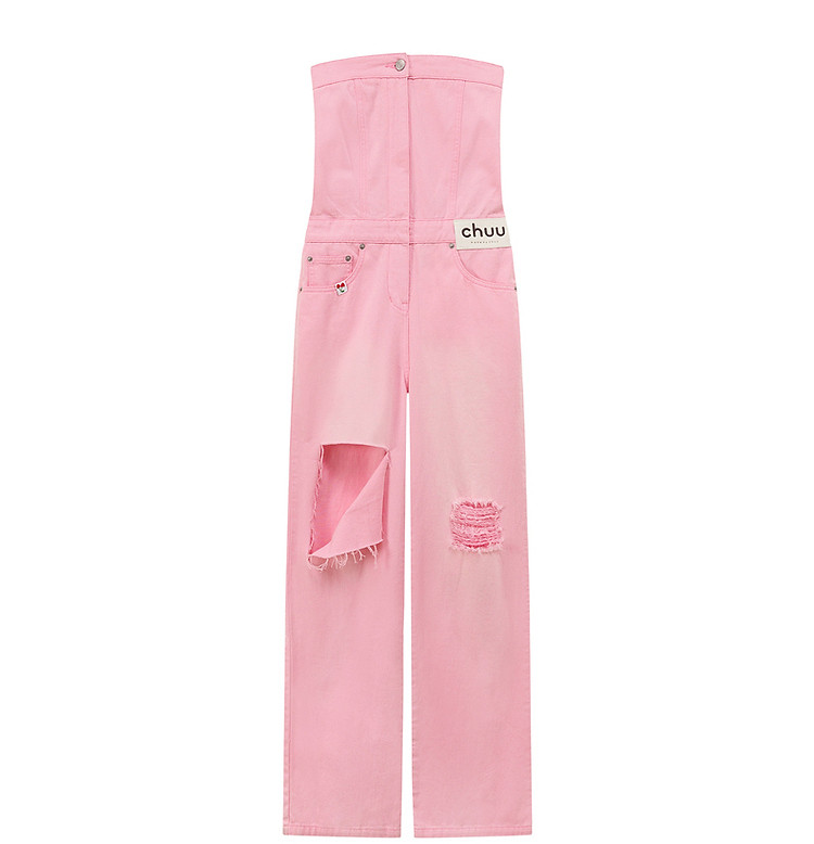 CHUU破洞抹胸连体牛仔裤女士夏小众设计感阔腿裤 351315